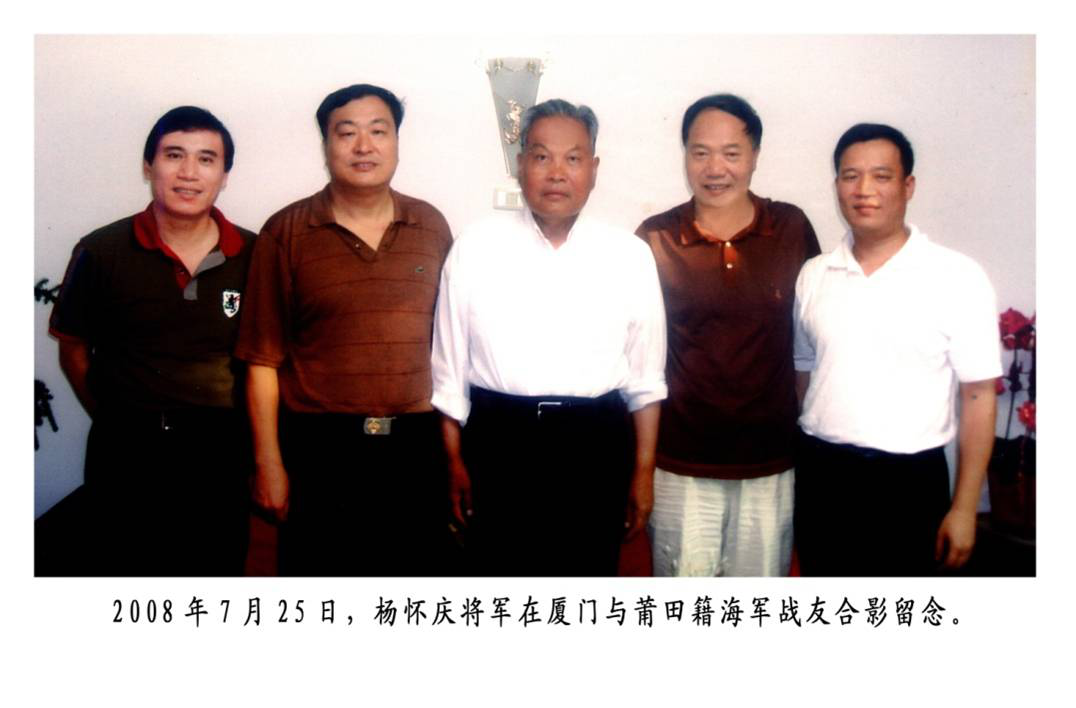 彼此牽掛 情真意切 1984年6月,我調(diào)福建基地干部處工作。翌年8月,楊懷慶部長也離開了他軍旅生涯工作時間長達(dá)15年之久的東海艦隊干部部,先后到舟山基地和海政、海軍領(lǐng)導(dǎo)崗位上任職。雖然與老首長地域相隔越來越遙遠(yuǎn),但我和首長之間始終保持著不間斷的聯(lián)系和交往,關(guān)系越來越親近,感情越來越深厚,彼此相互牽掛著對方。長期的相處交往,使我從他那里得到許多教益,從他身上學(xué)到許多難能可貴的東西和細(xì)潤無聲的高尚品德。 楊懷慶同志生前曾多次到過福建,他對福建這片擁軍熱土懷有一股深情,又特別記掛我這個曾經(jīng)的老部下。每每到福建,老首長總會惦記召見我,與我促膝長談,了解基層部隊的有關(guān)動態(tài),詢問我到福建后的工作、學(xué)習(xí)和家庭狀況,關(guān)心我的成長進(jìn)步,鼓勵我繼續(xù)為部隊建設(shè)和地方發(fā)展多做貢獻(xiàn)。 1989年5月底,時任舟山基地政委的楊懷慶與司令員王永國率艦船編隊到三都與福建基地部隊舉行海上演練。29日上午,他電召當(dāng)時在福建基地政治部(地處飛鸞)工作的我,約我到三都礁頭面談。記得當(dāng)時他謝絕了其他干部求見,與我談了整整一個上午。他詢問了我個人的工作生活和家庭情況后,了解了福建基地部隊和干部情況。他特別對當(dāng)時的熱點問題很感興趣,與我探討交流市場經(jīng)濟(jì)條件下部隊思想政治工作面臨的問題:如軍地收入反差對干部的沖擊;地處僑鄉(xiāng)和改革開放地區(qū)部隊受燈紅酒綠的影響以及多元文化侵蝕的問題;青年學(xué)生官帶兵能力不足的問題。他還非常耐心地征求我對如何加強(qiáng)和改進(jìn)在改革開放新形勢下做好部隊思想政治工作的意見。楊政委總是以平等的口吻與我探討問題,注意傾聽我的看法,只把我當(dāng)做戰(zhàn)友和知心朋友對待,更讓我油然而生敬意。 2000年3月24日,我當(dāng)時正參加莆田市機(jī)關(guān)第二批“三講”,楊政委來福建視察工作要召見我,并特地交待楊野平秘書,叫我把妻子方美珠和女兒黃方也帶上福州。我向市委請假后,當(dāng)晚帶妻子、女兒上福州,到福海賓館時,總臺服務(wù)員說,楊政委交待,把你們一家人安排住6樓首長隔壁間。我們感到莫大的榮幸。當(dāng)晚首長會見我和家人并合影留念,還和我長談到深夜。 次日晨,首長還叫我一起散步。早飯后,楊政委親自從6樓下來送我們上車。此情此景,感人至深。 2007年8月底,老首長在廈門鼓浪嶼療養(yǎng)院療養(yǎng),得知我要去探望他,冒著烈日酷暑,抱病早早就在離居室約300米處的地方迎候我,臨走時還把我和另一位曾在艦隊干部部工作過的周金龍戰(zhàn)友一直送到鼓療門口,令我們感動不已。 2008年7月25日中午,我赴廈門水警區(qū)拜訪正在休養(yǎng)的楊將軍,到達(dá)后,他正在午休。老首長起床后,聽姚樹彬秘書說我來見他,立即召見我。他因左耳聽力下降,叫我靠近點坐在他的右側(cè),對我說:“飛龍,今天我要考考你,看你腦瓜還靈不靈?!彼幌伦舆B續(xù)問了10多位曾在艦隊干部部工作過的老戰(zhàn)友愛人的姓名,我一個個作了回答,沒出差錯。問答后,他幽默風(fēng)趣地對一同前來探望他的水警區(qū)政委趙閩陽等人說:“看來飛龍你這個腦瓜還管用,沒有故障,你記性還好,過去我常夸你電腦,看來還沒生銹,不錯?!币幌?,說得大家哄堂大笑。爾后,楊將軍很興奮地親自招呼大家與他合影留念(見圖九)。 在離開艦隊干部部后,我也十分想念老首長,曾多次電話、書信或面見首長。我1997年底擬定轉(zhuǎn)業(yè)和1998年8月轉(zhuǎn)到地方工作后,尤其是在楊懷慶將軍病重、病危時,先后于1997年12月21日、1998年11月14日、2006年6月22日、2010年3月20日、2012年2月22日共5次前往北京看望老首長。彼此牽掛、相互探訪,而每次的重逢會面,首長總是喜出望外、談笑風(fēng)生、挽留共餐、合影留念;離別時,也總是依戀不舍,熱情歡送。 2010年3月20日,我?guī)ьI(lǐng)兩莆田籍戰(zhàn)友劉國基、楊東陽赴京向老首長匯報,他抱重病會見我們。當(dāng)他觀看我編輯制作的《媽祖故鄉(xiāng)海軍情》《大海情》紀(jì)錄片后,語重心長地再三叮囑我今后要著重宣揚為地方建設(shè)做出重大貢獻(xiàn)的戰(zhàn)友企業(yè)家和各行業(yè)的優(yōu)秀人才。爾后,老首長拖著病體、舉步維艱帶著我們上二樓,為前去的每人各寫了一幅包含虎年特色的題字,我看著題字后臉頰冒汗的老首長,情不自禁一陣心酸,熱淚盈眶;臨別時,他還讓工作人員在他的掛像前拍下他生前與我的最后一次合影。 返程途中,我心潮澎湃,熱血沸騰,這是一次多么難忘的留影,是老首長與我之間深厚友誼的像征。“仁義為友、道德為師”“重金難買戰(zhàn)友情”這些古訓(xùn)在此時此刻得到了充分的體現(xiàn)。 特別難忘的是,2012年2月22日上午,我?guī)е鴥晌粦?zhàn)友企業(yè)家劉光榮、鄭健前往北京海軍總院看望病重中的老首長并給他送去我編輯的《莆田籍海軍戰(zhàn)友紀(jì)念冊暨通訊錄》,這是他生前與我的最后一次見面。當(dāng)時楊將軍非常高興。當(dāng)我們走到病榻旁,我向老首長行軍禮時,躺在床上的他左手掛點滴,伸出右手給我回了個軍禮。并把我贈他的紀(jì)念冊放在枕邊,說要認(rèn)真仔細(xì)看。此情此景,令我刻骨銘心,永志難忘。 2012年12月12日