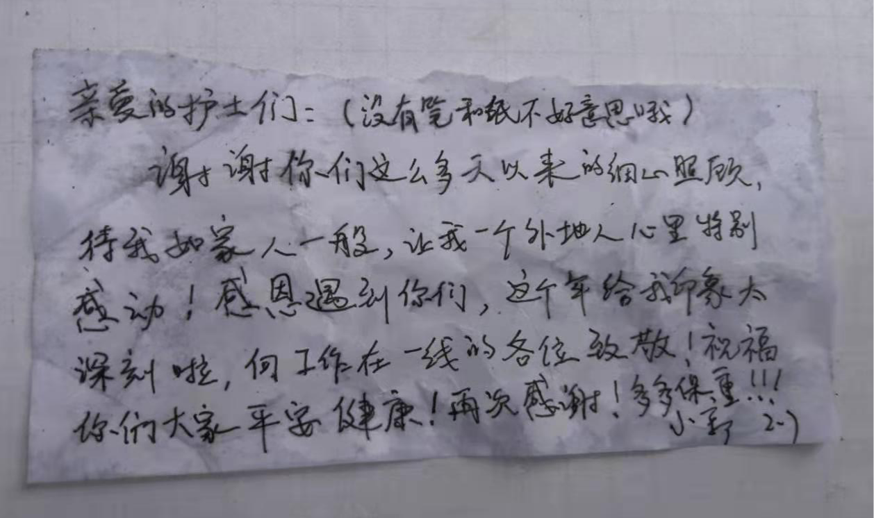 ![]() ![]() 這是一封來自明溪縣總醫(yī)院隔離病房的一位醫(yī)學隔離觀察患者的感謝信。前些天,這位患者在醫(yī)護人員的觀察和護理下,順利解除隔離,出院回家。 看到這封感謝信,感染科的全體醫(yī)護人員都倍受感動和鼓舞,護理部主任黃君燕說:“我們和患者一起攜手并肩,抗擊疫情,相信定能幫助更多的患者恢復健康!” 隔離病房處在戰(zhàn)“疫”最前線,這里的醫(yī)護人員除了背負著治療隔離患者的任務,還要主動自我隔離,割舍與家人團聚......下面這篇自述來自于明溪縣總醫(yī)院感染科的醫(yī)護人員黃君燕,我們一起去聽聽隔離病房里的那些“紙短情長”。 1月24日開始到現(xiàn)在,我們隔離病房已經(jīng)更換了第二批人員了。感染科醫(yī)護團隊在除夕中午進入隔離病房,有些人已在里面戰(zhàn)斗了近二十天。除夕夜,我和戴仁海醫(yī)師、廖愛珠副主任、張雪珍護士長一起在感染科吃完“簡單”的年夜飯,仍然堅守崗位,與病人一起度過除夕夜。 我是感染病房總管,醫(yī)護人員和患者的事都要管,有生活、工作流程、院感控制、物資管理、學習培訓、內外協(xié)調等事情。一開始進入新的環(huán)境,流程不夠順暢,各個部門之間的配合不夠默契,我花費了大精力不斷優(yōu)化流程,記錄缺乏的物資,多溝通勤協(xié)調。工作很快步入正軌,工作也相對輕松了些。 對于每一位進隔離病房的護士,我總盼著她們能早些出來,但她們總覺得,不能浪費防護服,要確保把每一件事都做好、檢查好才肯離開隔離病房。在病房里,穿著厚厚的防護服的護士們負責完成各種治療,監(jiān)測生命體征、記錄病情變化,并為患者提供一切生活所需。 護士還有一項重要工作,就是做好患者心理護理。許多患者入院時,他們的心里滿滿都是恐慌,擔心自己是不是病毒感染、是不是治不好了。面對封閉式管理的病房,他們更加緊張。然而,我們的醫(yī)生護士在照顧病患的生活起居時,同他們講解一些疾病的知識,細心安慰,貼心關懷,讓患者安心。 |