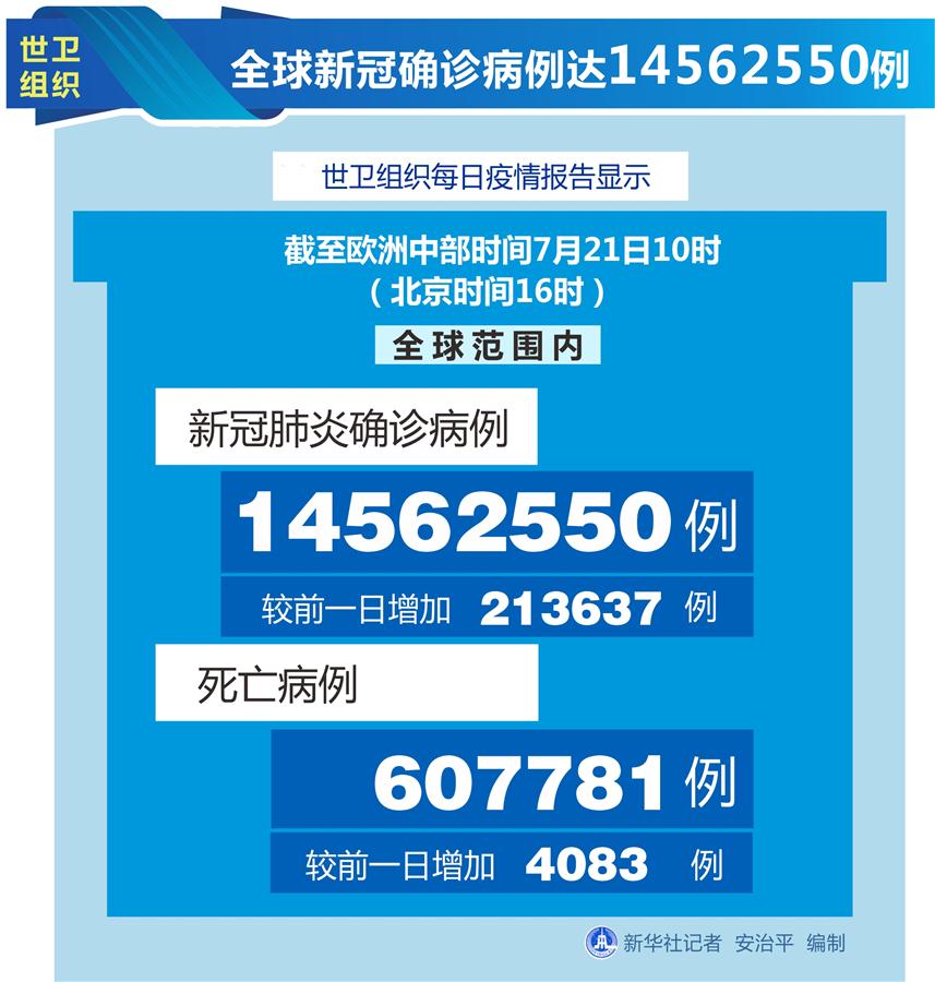 新華社日內(nèi)瓦7月21日電(記者劉曲)世界衛(wèi)生組織21日公布的最新數(shù)據(jù)顯示,全球新冠確診病例達(dá)14562550例。 世衛(wèi)組織每日疫情報(bào)告顯示,截至歐洲中部時(shí)間21日10時(shí)(北京時(shí)間16時(shí)),全球確診病例較前一日增加213637例,達(dá)到14562550例;死亡病例增加4083例,達(dá)到607781例。 |