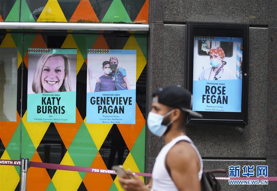 8月19日,在美國紐約,一名行人從街頭向醫(yī)護(hù)人員致敬的廣告牌旁走過。 新華社記者 王迎 攝 |