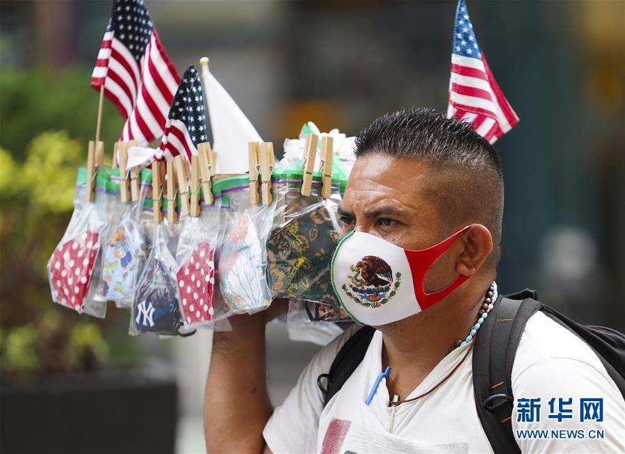 8月19日,一名小販在美國紐約時報廣場售賣口罩。 新華社記者 王迎 攝 目前美國累計確診病例最多的州是加利福尼亞州,為640722例。佛羅里達(dá)州和得克薩斯州確診病例均超過50萬例,紐約州確診病例超過40萬例。累計確診病例超過18萬例的州還有佐治亞州、伊利諾伊州、亞利桑那州和新澤西州。