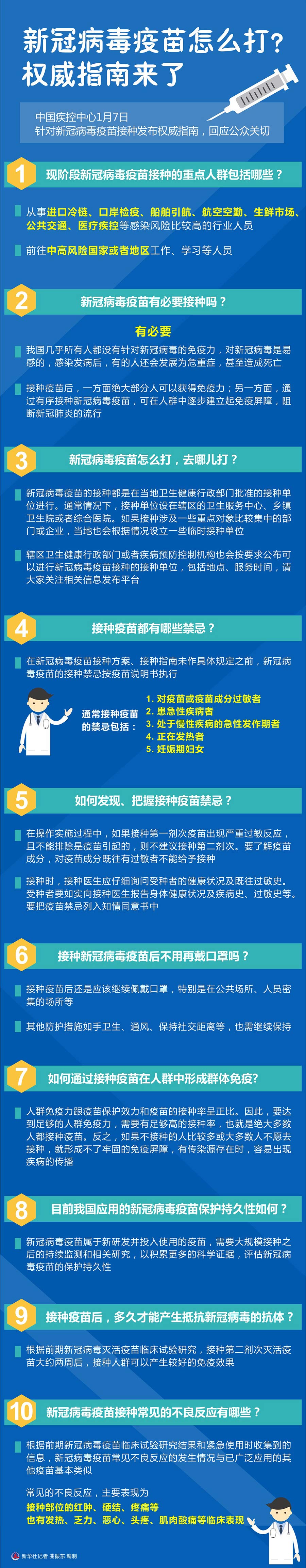 新華社北京1月7日電 題:新冠病毒疫苗怎么打?權(quán)威指南來了 新華社記者王琳琳、沐鐵城 中國疾控中心7日針對新冠病毒疫苗接種發(fā)布權(quán)威指南,回應(yīng)公眾關(guān)切。 一、現(xiàn)階段新冠病毒疫苗接種的重點人群包括哪些? 我國新冠疫情形勢與國外不同,疫苗使用策略也不一樣。新冠病毒疫苗接種的主要策略需要結(jié)合國內(nèi)疫情形勢和防控工作目標(biāo)來考慮。當(dāng)前,重點人群接種疫苗的意義,一方面是對這部分人群起到保護作用,另一方面有利于“外防輸入、內(nèi)防反彈”,有利于我國總體疫情防控。 現(xiàn)階段新冠病毒疫苗接種的重點人群主要包括從事進口冷鏈、口岸檢疫、船舶引航、航空空勤、生鮮市場、公共交通、醫(yī)療疾控等感染風(fēng)險比較高的行業(yè)人員;前往中高風(fēng)險國家或者地區(qū)工作、學(xué)習(xí)等人員。 二、新冠病毒疫苗有必要接種嗎? 有必要。一方面我國幾乎所有人都沒有針對新冠病毒的免疫力,對新冠病毒是易感的,感染發(fā)病后,有的人還會發(fā)展為危重癥,甚至造成死亡。接種疫苗后,一方面絕大部分人可以獲得免疫力;另一方面,通過有序接種新冠病毒疫苗,可在人群中逐步建立起免疫屏障,阻斷新冠肺炎的流行。 三、新冠病毒疫苗怎么打,去哪兒打? 新冠病毒疫苗的接種都是在當(dāng)?shù)匦l(wèi)生健康行政部門批準(zhǔn)的接種單位進行。通常情況下,接種單位設(shè)在轄區(qū)的衛(wèi)生服務(wù)中心、鄉(xiāng)鎮(zhèn)衛(wèi)生院或者綜合醫(yī)院。如果接種涉及一些重點對象比較集中的部門或企業(yè),當(dāng)?shù)匾矔鶕?jù)情況設(shè)立一些臨時接種單位。 轄區(qū)衛(wèi)生健康行政部門或者疾病預(yù)防控制機構(gòu)也會按要求公布可以進行新冠病毒疫苗接種的接種單位,包括地點、服務(wù)時間,請大家關(guān)注相關(guān)信息發(fā)布平臺。 大多數(shù)重點人群的接種,由重點人群所在的單位組織摸底、預(yù)約,并協(xié)助開展接種工作。對于前往中高風(fēng)險國家或者地區(qū)工作、學(xué)習(xí)的個人,可關(guān)注當(dāng)?shù)匦鹿诓《疽呙缃臃N的相關(guān)服務(wù)信息。 四、接種疫苗都有哪些禁忌? 疫苗接種的禁忌是指不應(yīng)接種疫苗的情況。因為大多數(shù)禁忌都是暫時的,所以當(dāng)導(dǎo)致禁忌的情況不再存在時,可以在晚些時候接種疫苗。 在新冠病毒疫苗接種方案、接種指南未作具體規(guī)定之前,新冠病毒疫苗的接種禁忌按疫苗說明書執(zhí)行。通常接種疫苗的禁忌包括:1.對疫苗或疫苗成分過敏者;2.患急性疾病者;3.處于慢性疾病的急性發(fā)作期者;4.正在發(fā)熱者;5.妊娠期婦女。 五、如何發(fā)現(xiàn)、把握接種疫苗禁忌? 在操作實施過程中,如果接種第一劑次疫苗出現(xiàn)嚴(yán)重過敏反應(yīng),且不能排除是疫苗引起的,則不建議接種第二劑次。要了解疫苗成分,對疫苗成分既往有過敏者不能給予接種。 接種時,接種醫(yī)生應(yīng)仔細詢問受種者的健康狀況及既往過敏史。受種者要如實向接種醫(yī)生報告身體健康狀況及疾病史、過敏史等。要把疫苗禁忌列入知情同意書中。 六、接種新冠病毒疫苗后不用再戴口罩嗎? 在人群免疫屏障沒有建立起來之前,即使部分人群接種了疫苗,大家的防控意識和防控措施也不能放松。一方面,疫苗免疫成功率不是100%,在流行期間還會有較少部分已接種的人可能發(fā)病。另一方面,在沒有形成免疫屏障的情況下,新冠病毒依然容易傳播。因此,接種疫苗后還是應(yīng)該繼續(xù)佩戴口罩,特別是在公共場所、人員密集的場所等;其他防護措施如手衛(wèi)生、通風(fēng)、保持社交距離等,也需要繼續(xù)保持。 七、如何通過接種疫苗在人群中形成群體免疫? 不同傳染病的傳染力不一樣,阻斷傳染病流行的人群免疫力水平也不一樣。一般而言,傳染病的傳染力越強,則需要越高的人群免疫力。例如,麻疹和百日咳傳染力較強,如果要阻斷它們的流行,人群免疫力要達到90%-95%;而消滅天花和脊髓灰質(zhì)炎,人群免疫力要達到80%以上。人群免疫力達到上述閾值,也就建立了阻斷麻疹、百日咳、天花和脊髓灰質(zhì)炎傳播的免疫屏障。 人群免疫力跟疫苗保護效力和疫苗的接種率呈正比。因此,要達到足夠的人群免疫力,需要有足夠高的接種率,也就是絕大多數(shù)人都接種疫苗。反之,如果不接種的人比較多或大多數(shù)人不愿去接種,就形成不了牢固的免疫屏障,有傳染源存在時,容易出現(xiàn)疾病的傳播。 八、目前我國應(yīng)用的新冠病毒疫苗保護持久性如何? 新冠病毒疫苗屬于新研發(fā)并投入使用的疫苗,需要大規(guī)模接種之后的持續(xù)監(jiān)測和相關(guān)研究,以積累更多的科學(xué)證據(jù),評估新冠病毒疫苗的保護持久性。 九、接種疫苗后,多久才能產(chǎn)生抵抗新冠病毒的抗體? 根據(jù)前期新冠病毒滅活疫苗臨床試驗研究,接種第二劑次滅活疫苗大約兩周后,接種人群可以產(chǎn)生較好的免疫效果。 十、新冠病毒疫苗接種常見的不良反應(yīng)有哪些? 從前期新冠病毒疫苗臨床試驗研究結(jié)果和緊急使用時收集到的信息,新冠病毒疫苗常見不良反應(yīng)的發(fā)生情況與已廣泛應(yīng)用的其他疫苗基本類似。常見的不良反應(yīng),主要表現(xiàn)為接種部位的紅腫、