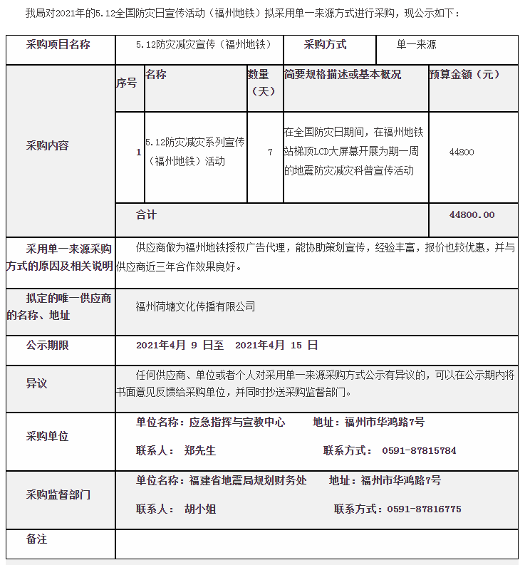 應急指揮與宣教中心5.12防災減災宣傳(福州地鐵)采購公示
