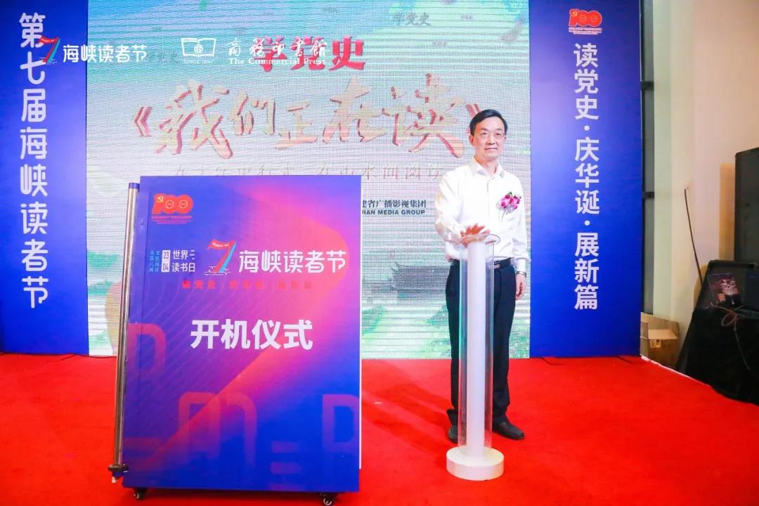 4月23日,在第七屆海峽讀者節(jié)開(kāi)幕式上,大型沉浸式閱讀分享類(lèi)節(jié)目《我們正在讀》開(kāi)機(jī)啟動(dòng)。福建省人大常委會(huì)副主任嚴(yán)可仕,福建省政協(xié)副主席劉獻(xiàn)祥,中共福建省委組織部副部長(zhǎng)、老干局局長(zhǎng)兼省政協(xié)文化文史和學(xué)習(xí)委員會(huì)主任何國(guó)輝,中共福建省委宣傳部副部長(zhǎng)、一級(jí)巡視員、省新聞出版局(省版權(quán)局)局長(zhǎng)肖貴新,中共福州市委副書(shū)記、福州新區(qū)管委會(huì)常務(wù)副主任林飛,海峽出版發(fā)行集團(tuán)黨委書(shū)記、董事長(zhǎng)林義良,福建廣播影視集團(tuán)黨組副書(shū)記、總經(jīng)理莊志松等出席開(kāi)機(jī)儀式。