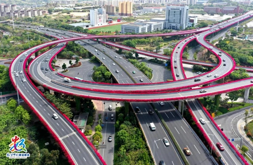 池遠(yuǎn) 攝 在福州的高架、大橋等關(guān)鍵路段 盛放的三角梅為道路鑲上了紅色“花邊” 長(zhǎng)達(dá)158公里的“紅緞帶” 在路邊熱情地歡迎著八方賓客