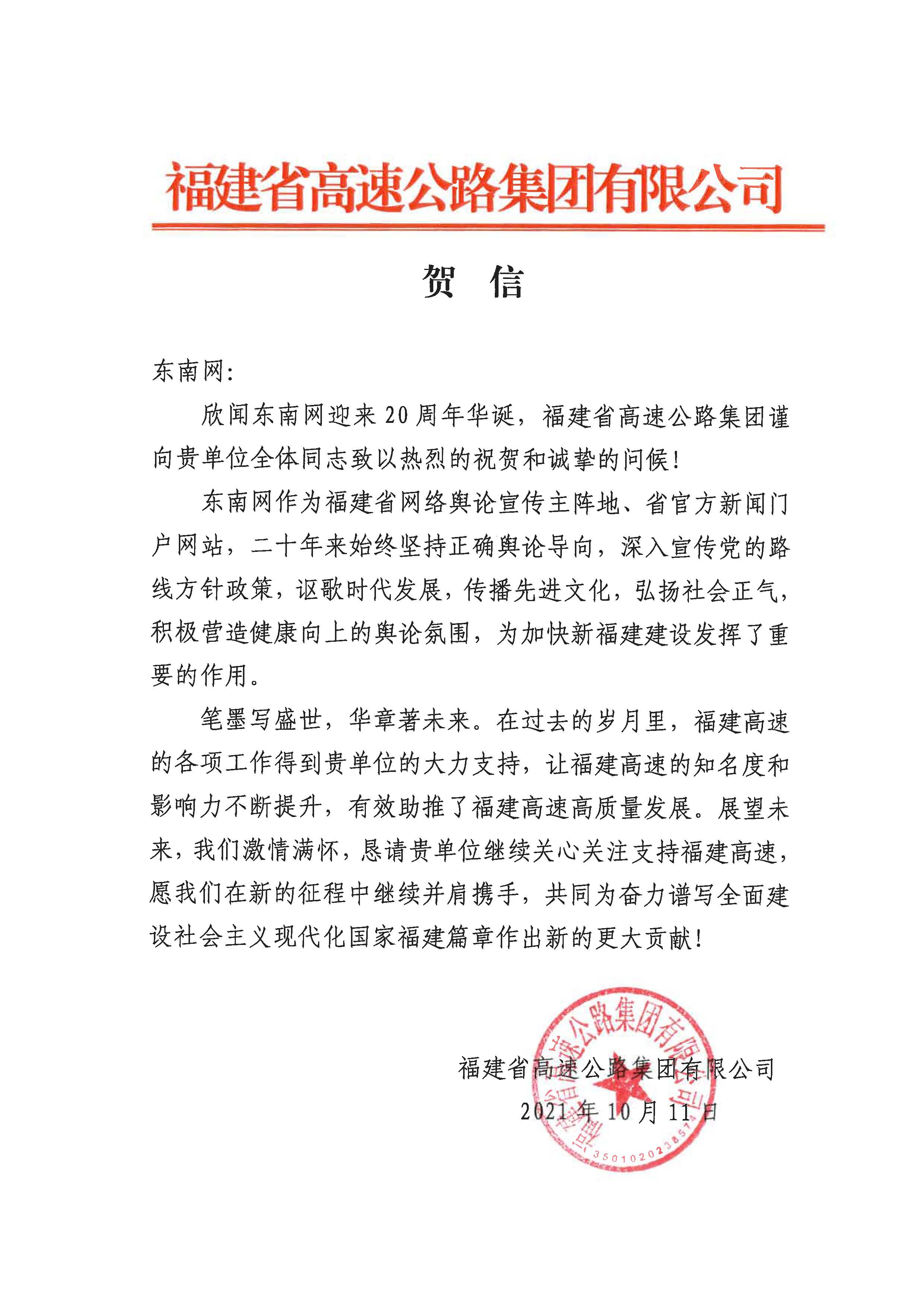 福建省高速公路集團有限公司致東南網(wǎng)20周年賀信