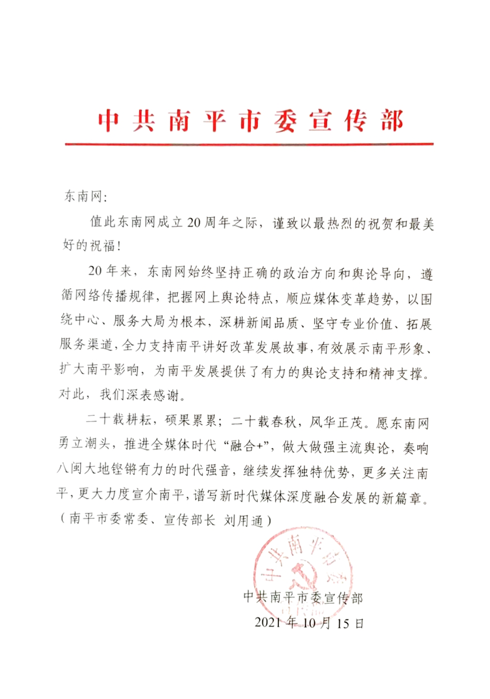 中共南平市委宣傳部賀信