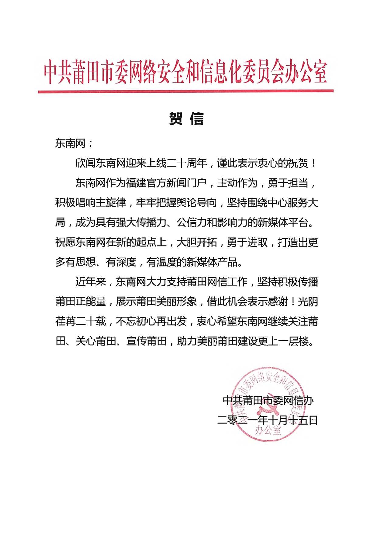 中共莆田市委網(wǎng)絡(luò)安全和信息化委員會(huì)辦公室賀信