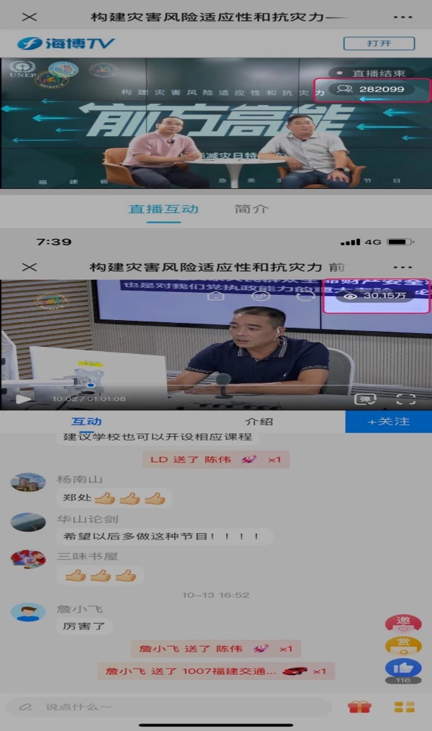 10月13日是第32個(gè)國際減災(zāi)日,今年的主題是“構(gòu)建災(zāi)害風(fēng)險(xiǎn)適應(yīng)性和抗災(zāi)力”。在今年的國際減災(zāi)日(2021年10月13日)中,福建省應(yīng)急管理廳與福建交通應(yīng)急廣播共同策劃,推出《前方高能》國際減災(zāi)日直播訪談特別節(jié)目。本次參加訪談的是福建省應(yīng)急管理廳風(fēng)險(xiǎn)監(jiān)測(cè)和綜合減災(zāi)處鄭成捷處長、福建省減災(zāi)中心周翔副主任和福建師范大學(xué)地理研究所高路教授,他們一同為觀眾朋友們講解了全國第一次自然災(zāi)害綜合風(fēng)險(xiǎn)普查的目的和做法,以及構(gòu)建災(zāi)害風(fēng)險(xiǎn)適應(yīng)性和抗災(zāi)力的多項(xiàng)舉措。 在訪談直播中,鄭成捷處長強(qiáng)調(diào)了今年國際減災(zāi)日的主題“合作協(xié)同,多管齊下”,呼吁防災(zāi)減災(zāi)救災(zāi)工作要政府、社會(huì)、公民等各方力量廣泛參與,形成合力。周翔副主任特別介紹了本次普查是新中國成立以來第一次開展的全國自然災(zāi)害綜合風(fēng)險(xiǎn)普查,包括致災(zāi)因子調(diào)查、承災(zāi)體調(diào)查、歷史災(zāi)害信息調(diào)查和區(qū)域綜合減災(zāi)能力調(diào)查等,普查涉及領(lǐng)域廣、綜合性強(qiáng)、技術(shù)要求高、實(shí)施難度大。高路教授表示,第一次自然災(zāi)害綜合風(fēng)險(xiǎn)普查不僅可以摸清風(fēng)險(xiǎn)隱患底數(shù)、客觀認(rèn)知風(fēng)險(xiǎn)水平,還可以為長遠(yuǎn)的應(yīng)急預(yù)案、防災(zāi)規(guī)劃等工作提供可靠的科技支撐,真正做到智慧減災(zāi)。 本次《前方高能》國際減災(zāi)日直播訪談特別節(jié)目在微博、視頻號(hào)、抖音、直播海峽、海博TV等多平臺(tái)同步直播,全網(wǎng)播放量超過60萬,取得了良好的社會(huì)反響。