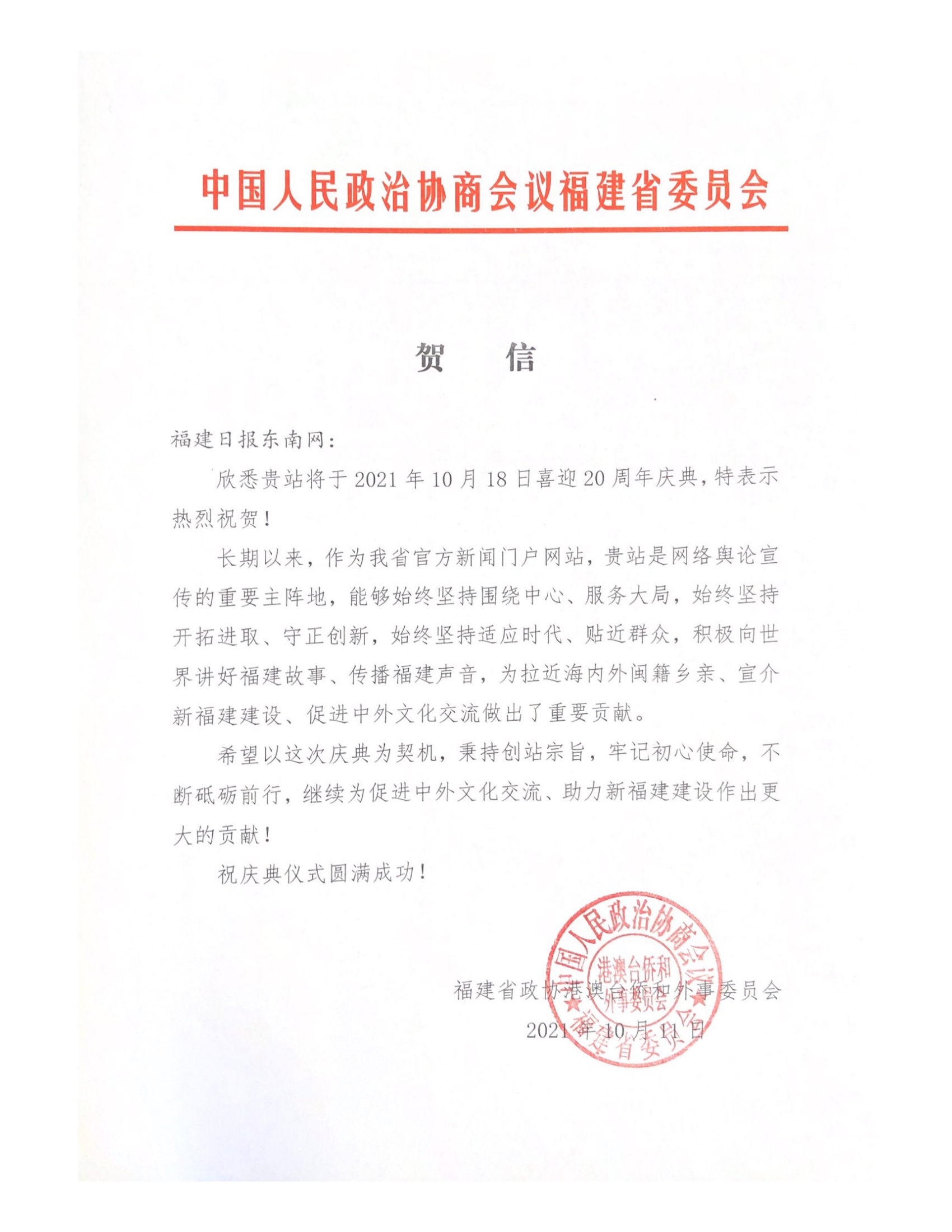 福建省政協(xié)港澳臺僑和外事委員會賀信