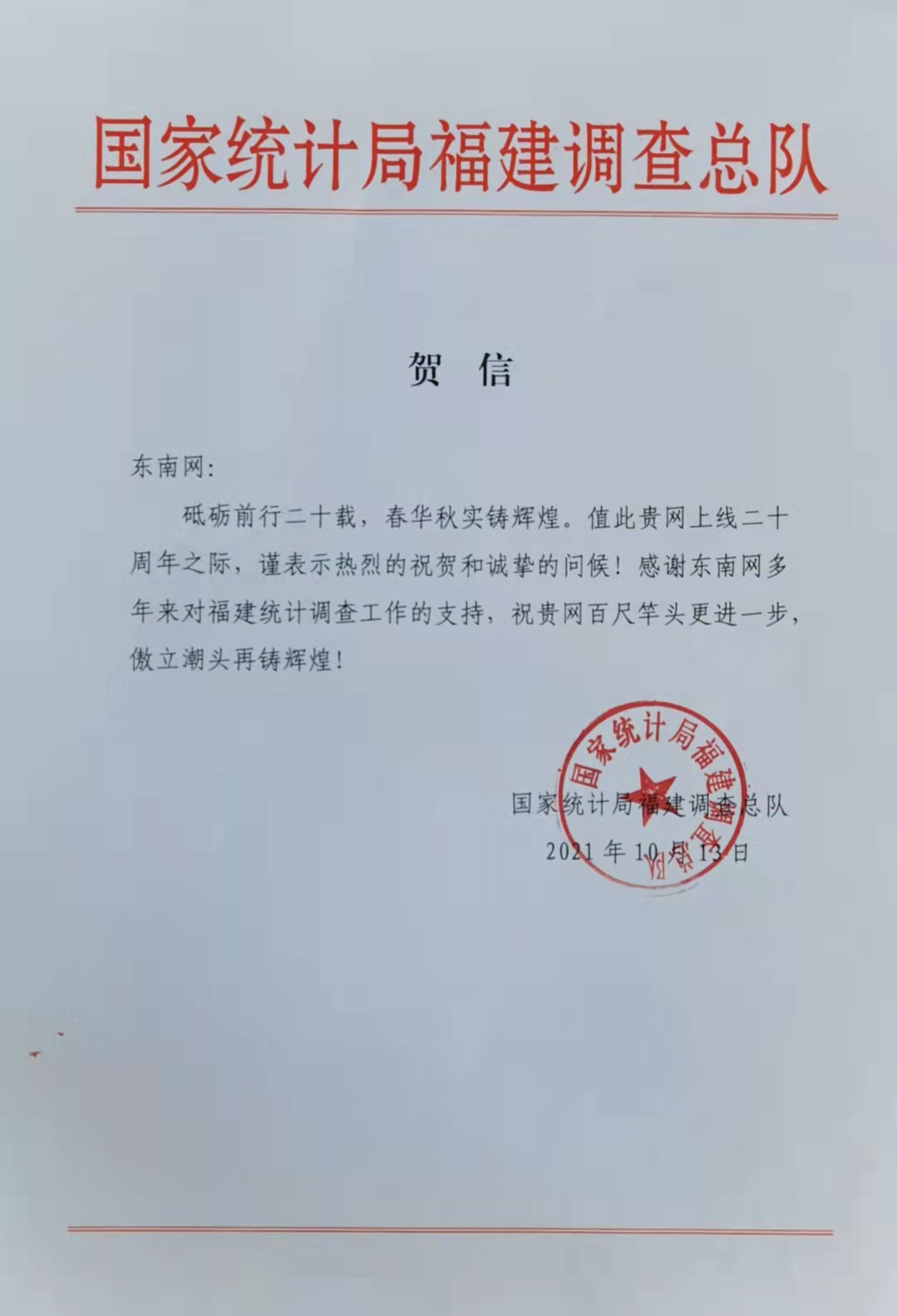 國家統(tǒng)計局福建調(diào)查總隊賀信