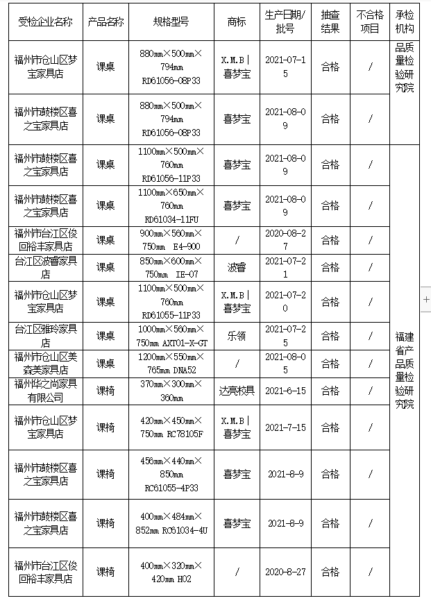 課桌椅的安全性一直是學(xué)校家長社會(huì)關(guān)注的重點(diǎn),由于學(xué)生每天直接接觸使用其安全性必須得到充分的保證。有的課桌椅存在危險(xiǎn)銳利尖銳物安全隱患,有的課桌椅產(chǎn)品低價(jià)甲醛釋放量超標(biāo),導(dǎo)致學(xué)生頭暈、頭痛等,很容易給孩子們帶來傷害。 根據(jù)市場監(jiān)管總局關(guān)于開展消費(fèi)品質(zhì)量安全進(jìn)校園活動(dòng)的要求,近期,福建省市場監(jiān)管局依據(jù)《產(chǎn)品質(zhì)量法》,組織對(duì)學(xué)生課桌椅產(chǎn)品質(zhì)量開展省級(jí)監(jiān)督抽查。共抽查7家銷售單位的課桌10批次產(chǎn)品、7家銷售單位的課椅10批次產(chǎn)品。 本次抽查依據(jù)QB/T 4071-2010 《課桌椅》標(biāo)準(zhǔn)的要求,對(duì)課桌的安全性、桌面垂直靜載荷、桌面垂直耐久性、桌面垂直沖擊、桌腿跌落、桌面水平靜載荷、重金屬含量(限色漆)、甲醛釋放量等8個(gè)項(xiàng)目進(jìn)行了檢驗(yàn);對(duì)課椅的安全性、椅子向前傾翻、椅子側(cè)向傾翻(有扶手和無扶手)、椅子向后傾翻、凳子任意方向傾翻、座面椅背聯(lián)合靜載荷、座面?zhèn)认蜢o載荷、椅腿向前靜載荷、椅腿側(cè)向靜載荷、座面沖擊、椅背沖擊、踏腳靜載荷、椅腿跌落、枕靠側(cè)向靜載荷、扶手側(cè)向靜載荷、重金屬含量(限色漆)、甲醛釋放量等17個(gè)項(xiàng)目進(jìn)行了檢驗(yàn),未發(fā)現(xiàn)不合格產(chǎn)品。 合格產(chǎn)品信息表 課桌、課椅產(chǎn)品小常識(shí) 課桌、課椅是學(xué)生學(xué)習(xí)使用工具之一,對(duì)聽課、做功課、看書等學(xué)習(xí)行為非常重要,是校用或家庭用家具的一大類。因其使用對(duì)象、使用環(huán)境等不同,課桌、課椅有多種設(shè)計(jì),產(chǎn)品外觀也多種多樣。但是,無論怎樣改變,課桌、課椅都要符合標(biāo)準(zhǔn)。 一、課桌、課椅應(yīng)重點(diǎn)關(guān)注其結(jié)構(gòu)安全性。從外表看課桌、課椅是否存在安全隱患,如:是否有尖銳突出物、邊角是否經(jīng)過圓弧處理、桌腿和椅腿是否防滑、升降調(diào)節(jié)機(jī)構(gòu)是否安全等等。安全性有問題可能造成學(xué)生被撞傷、擦傷或刮傷等受傷情況出現(xiàn)。 二、課桌、課椅應(yīng)重點(diǎn)關(guān)注所使用材料和產(chǎn)品本身是否安全環(huán)保。查看相關(guān)產(chǎn)品的檢驗(yàn)報(bào)告中有害物質(zhì)是否在標(biāo)準(zhǔn)規(guī)定的限量范圍內(nèi),不選擇有刺鼻氣味的產(chǎn)品。課桌、課椅選用的材料是影響其安全性的重要因素。劣質(zhì)的材料中含有甲醛等各種揮發(fā)性物質(zhì),而這些物質(zhì)會(huì)逐步地侵入學(xué)生的身體中,影響學(xué)生人身健康。 三、課桌、課椅高度應(yīng)符合學(xué)生身體特征。課桌、課椅太低,學(xué)生只能伸著脖子,太高,學(xué)生要彎著腰。課桌、課椅過高或過低都影響學(xué)生的學(xué)習(xí)姿勢(shì)。不利于他們的身體發(fā)育,還會(huì)導(dǎo)致彎腰駝背或近視。此外,學(xué)習(xí)坐姿不正確會(huì)導(dǎo)致其雙腳懸空或踩地不實(shí),也會(huì)使學(xué)生學(xué)習(xí)無法集中精力。因此,課桌、課椅的高度要符合孩子的身體特征,最好選擇高度可調(diào)的課椅。 四、購買課桌、課椅時(shí),應(yīng)仔細(xì)查看該產(chǎn)品使用說明書,關(guān)注產(chǎn)品的規(guī)格型號(hào)、執(zhí)行標(biāo)準(zhǔn)編號(hào)、有害物質(zhì)限量指標(biāo)、主要原輔材料名稱和使用部位、產(chǎn)品安裝、故障分析排除方法、注意事項(xiàng)等并查看相關(guān)產(chǎn)品的檢驗(yàn)報(bào)告。 |