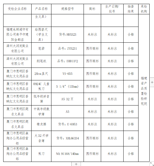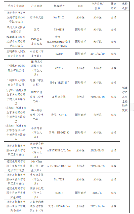 漂亮精致的文具使枯燥乏味的學(xué)習(xí)多了一層亮色。紙筆橡皮、膠帶涂改、記號熒光筆……在各具特色的外表下,卻可能暗含著許多不安全的成份,有毒文具時有出現(xiàn)。甚至有一支筆含十種毒的典型案例學(xué)生文具質(zhì)量關(guān)系到兒童的身心健康,使用質(zhì)量不合格的文具會直接對學(xué)生身體產(chǎn)生危害。那么在選購和使用時如何保障產(chǎn)品質(zhì)量安全? 福建省市場監(jiān)督管理部門堅持不懈把住學(xué)生用品質(zhì)量關(guān),定期開展市場上的文具質(zhì)量抽檢,我省市場上流通的學(xué)生文具質(zhì)量明顯上升。近期,根據(jù)國家市場監(jiān)管總局關(guān)于開展消費品質(zhì)量安全進校園活動的要求,福建省市場監(jiān)督管理局再次組織對各類批發(fā)市場、校園周邊店鋪的學(xué)生文具質(zhì)量開展省級監(jiān)督抽查。 本次抽查依據(jù)GB 21027-2007《學(xué)生用品的安全通用要求》標準的要求,對學(xué)生文具的可遷移元素的最大限量、筆的上帽安全、有機溶劑苯含量、氯代烴、甲醛含量、本冊亮度(白度)、邊緣尖端等7個項目進行了檢驗。共抽查11家銷售企業(yè)30批次產(chǎn)品,未發(fā)現(xiàn)不合格。 合格產(chǎn)品信息表 學(xué)生文具產(chǎn)品小常識 1、建議在選購學(xué)生文具時,要在正規(guī)商場、超市、文具店購買。 2、不要購買“三無”產(chǎn)品,選購前應(yīng)檢查是否帶有完整標簽信息,如:產(chǎn)品名稱、執(zhí)行標準、生產(chǎn)企業(yè)及地址、產(chǎn)品相關(guān)的警示說明等。 3、選購本冊要注意白度,紙張過于潔白易造成視覺疲勞,長期接觸視力將受到不良影響。 4、根據(jù)孩子的年齡選擇適合的學(xué)生文具,購買時不要買過于花哨和功能復(fù)雜的學(xué)生用品,以免分散孩子的注意力。 5、盡量選購安全環(huán)保的文具產(chǎn)品,具有可觸及邊緣、邊角、分模線的產(chǎn)品,應(yīng)注意是否存在銳利毛邊、尖端或溢邊,以免傷害孩子。 6、養(yǎng)成良好的使用習(xí)慣,在使用文具后要勤洗手,不“咬筆”,不玩有銳利尖端、邊緣的文具。 |