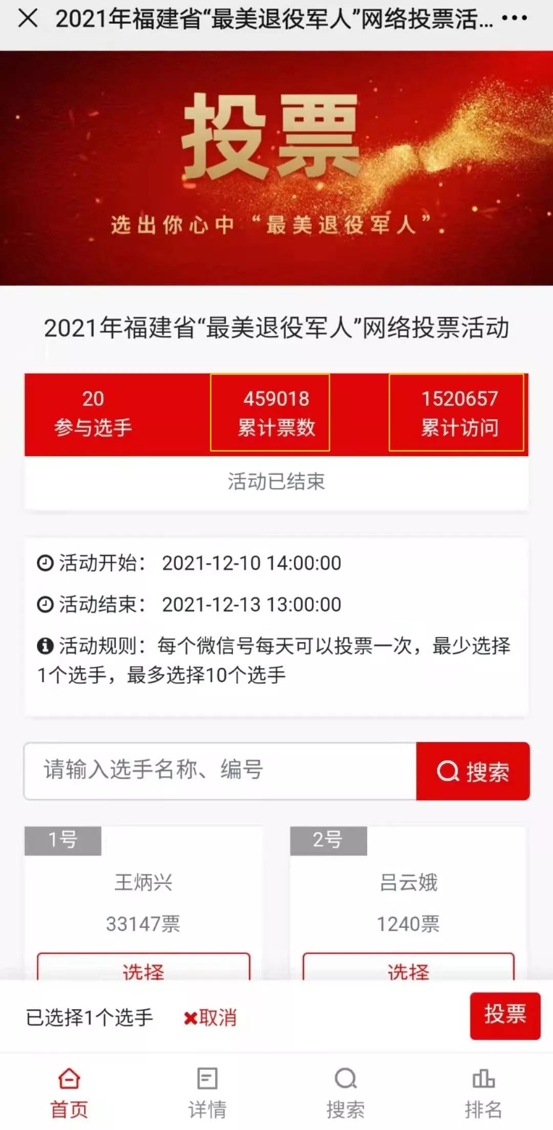 2021年福建省“最美退役軍人”網(wǎng)絡(luò)投票活動圓滿落幕!截止至2021年12月13日13:00,本次投票累計訪問人次達到了152萬,總計投票數(shù)45.9萬。本次微信投票結(jié)果將作為評選的參考,最終評選結(jié)果將于近日公布,不論最終結(jié)果如何,每一位入圍的退役軍人都值得我們尊敬,向你們致敬! |
