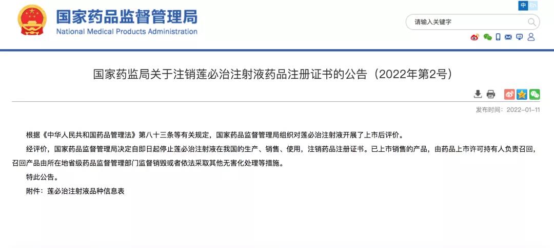 1月11日,國家藥監(jiān)局發(fā)布公告,即日起停止蓮必治注射液在我國的生產(chǎn)、銷售、使用,注銷藥品注冊證書。 根據(jù)《中華人民共和國藥品管理法》第八十三條等有關(guān)規(guī)定,國家藥品監(jiān)督管理局組織對蓮必治注射液開展了上市后評價(jià)。 經(jīng)評價(jià),國家藥品監(jiān)督管理局決定自即日起停止蓮必治注射液在我國的生產(chǎn)、銷售、使用,注銷藥品注冊證書。已上市銷售的產(chǎn)品,由藥品上市許可持有人負(fù)責(zé)召回,召回產(chǎn)品由所在地省級藥品監(jiān)督管理部門監(jiān)督銷毀或者依法采取其他無害化處理等措施。 附:蓮必治注射液品種信息表 |