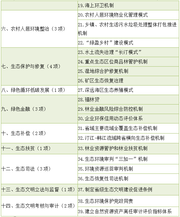 經(jīng)國務院同意,國家發(fā)展改革委近日正式印發(fā)《國家生態(tài)文明試驗區(qū)改革舉措和經(jīng)驗做法推廣清單》,充分肯定了福建等四個國家生態(tài)文明試驗區(qū) 大膽探索、先行先試,并向全國推廣自然資源資產(chǎn)產(chǎn)權(quán)、國土空間開發(fā)保護、環(huán)境治理體系、水資源水環(huán)境綜合整治等14個領(lǐng)域形成的90項改革舉措和經(jīng)驗做法。其中,福建39項改革舉措和經(jīng)驗做法入選,居四省推廣總數(shù)首位。 2016年8月,中共中央辦公廳、國務院辦公廳印發(fā)了《國家生態(tài)文明試驗區(qū)(福建)實施方案》,福建成為全國首個國家生態(tài)文明試驗區(qū)。在習近平生態(tài)文明思想的重要指引下,全省干部群眾持之以恒深入實施生態(tài)省建設戰(zhàn)略,統(tǒng)籌推進國家生態(tài)文明試驗區(qū)建設,聚焦于生態(tài)文明體制改革綜合試驗,健全改革推進機制,抓好制度創(chuàng)新、生態(tài)保護、綠色發(fā)展等各項工作,以點帶面實現(xiàn)“先試點后推廣”的改革路徑,探索創(chuàng)新了一批可復制、可推廣的制度模式,為生態(tài)環(huán)境質(zhì)量總體改善保駕護航,全省生態(tài)文明領(lǐng)域治理體系和治理能力現(xiàn)代化進程穩(wěn)步推進。 經(jīng)過持續(xù)努力,福建在實現(xiàn)生態(tài)環(huán)境“高顏值”和經(jīng)濟發(fā)展“高素質(zhì)”的道路上邁出堅實步伐。2020年前三季度—— 全省12條主要河流Ⅰ~Ⅲ類水質(zhì)比例為97.9%,高于全國平均水平16.7個百分點,縣級以上飲用水水源地水質(zhì)達標率100%; 設區(qū)城市空氣達標天數(shù)比例98.5%,高于全國平均水平11.3個百分點,PM2.5年平均濃度20微克/立方米,比全國平均水平低33.3%; 森林覆蓋率66.8%,連續(xù)41年保持全國首位,與此同時,我們積極抗疫情、穩(wěn)經(jīng)濟、謀發(fā)展,扎實做好“六穩(wěn)”工作,全面落實“六?!比蝿?,經(jīng)濟運行呈現(xiàn)持續(xù)明顯向上向好的態(tài)勢,前三季度GDP增長2.4%。 福建成為全國唯一一個保持水、大氣、生態(tài)環(huán)境全優(yōu)的省份和全國唯一的全省所有地級市人均GDP均超過全國平均水平的省份,中國工程院2019年發(fā)布的全國生態(tài)文明指數(shù),福建排名第一。 下階段,福建將圍繞中央關(guān)于生態(tài)文明建設的新部署新要求,以更高質(zhì)量深化國家生態(tài)文明試驗區(qū)建設,以推進生態(tài)文明領(lǐng)域治理體系和治理能力現(xiàn)代化為目標,推動制度優(yōu)勢轉(zhuǎn)化為治理效能,促進經(jīng)濟社會發(fā)展全面綠色轉(zhuǎn)型,建設人與自然和諧共生的現(xiàn)代化,為建設美麗中國作出福建應有的貢獻。 福建國家生態(tài)文明試驗區(qū)改革舉措和經(jīng)驗做法推廣清單 |