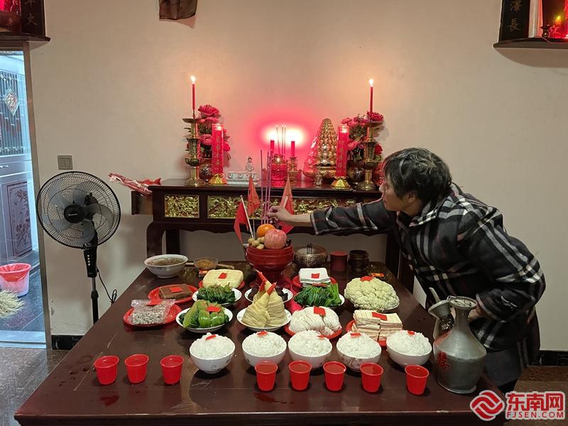除夕晚上11點(diǎn),寧德周寧的張阿姨備好八果糕、長壽面、水果等貢品,焚香點(diǎn)燭,準(zhǔn)備“接年”,祈求新的一年平安順?biāo)?,大吉大利。東南網(wǎng)記者 孫勁貞 攝