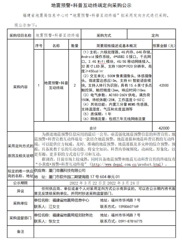 地震預(yù)警+科普互動(dòng)終端定向采購公示