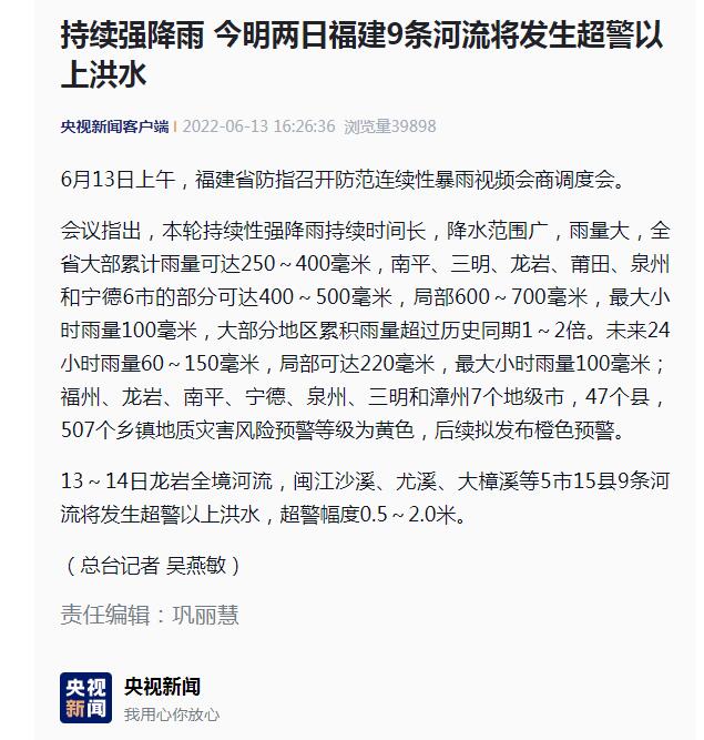 [央視新聞客戶端]持續(xù)強降雨 今明兩日福建9條河流將發(fā)生超警以上洪水