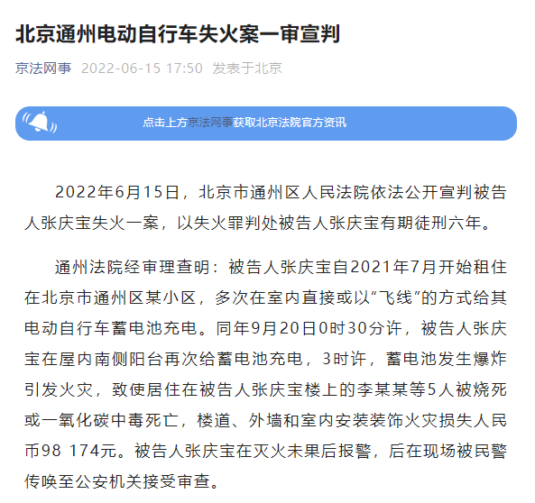 有期徒刑6年!北京通州電動(dòng)自行車失火致5人亡案一審宣判