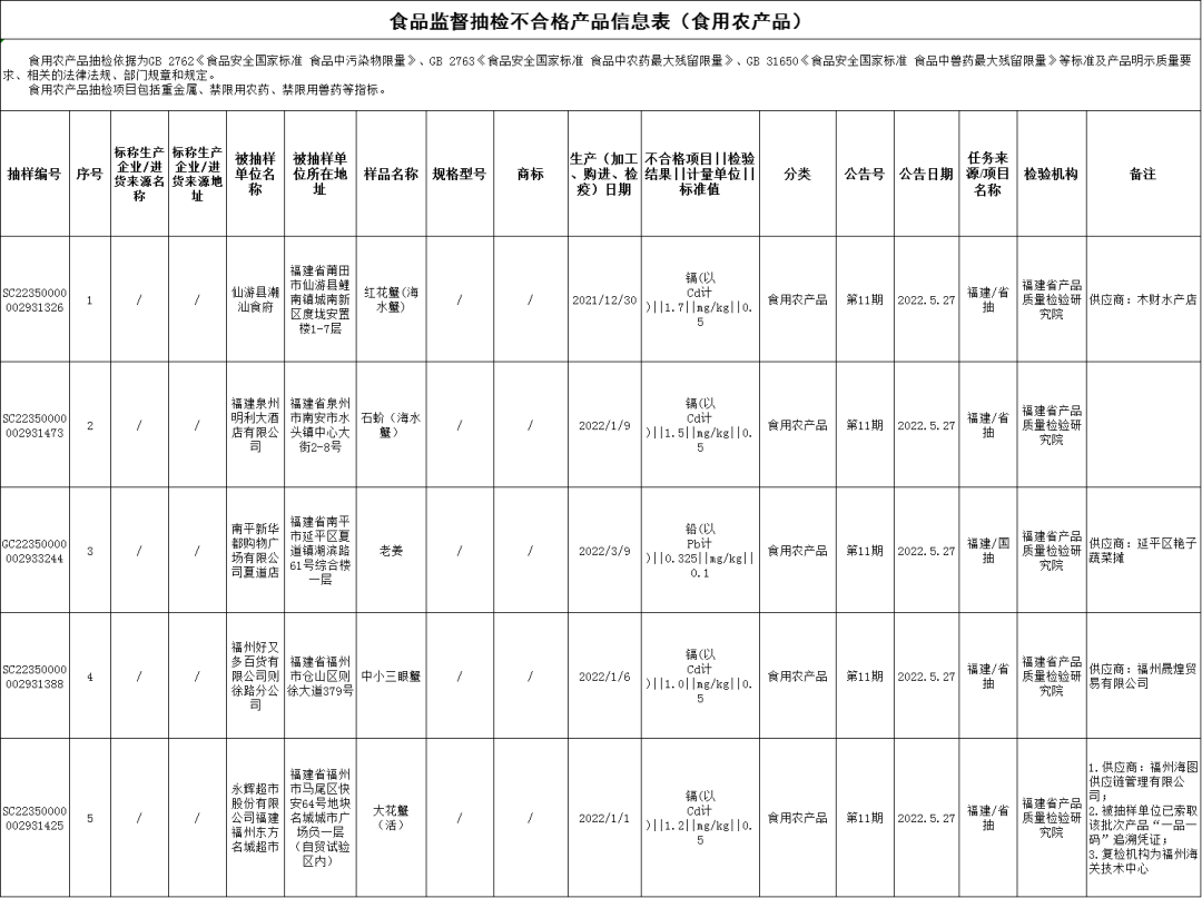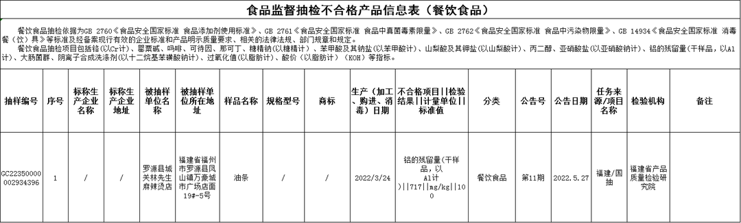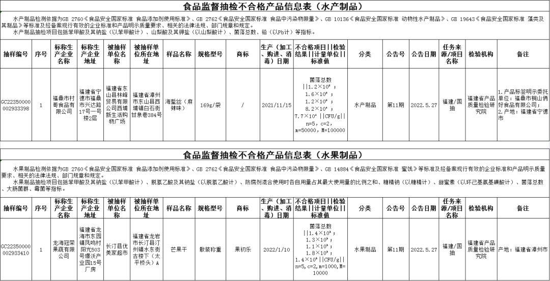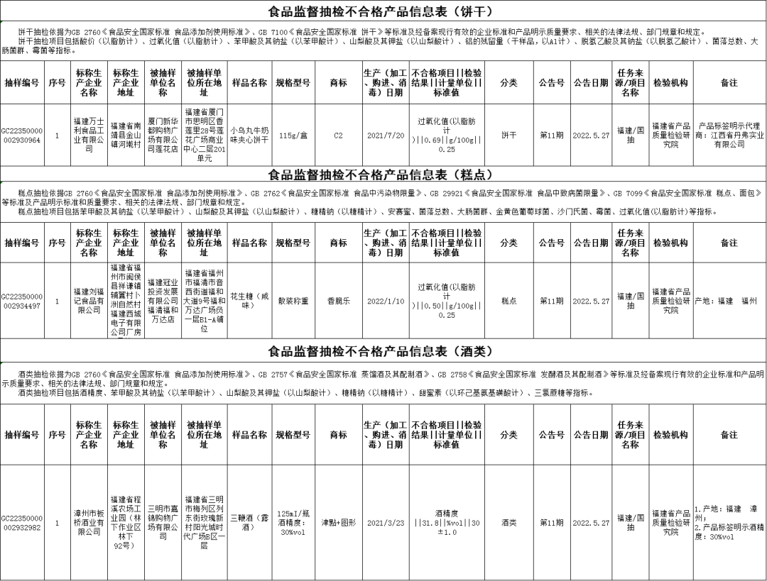 小伙伴們 新一期的抽檢 終于來啦 注意這些食品不合格 千萬別買哦 第11期公告的監(jiān)督抽檢信息涉及26大類食品916批次,包括:糧食加工品、食用油(含油脂及其制品)、調(diào)味品、肉制品、乳制品、飲料、方便食品、餅干、罐頭、速凍食品、薯類和膨化食品、糖果制品、茶葉及相關(guān)制品、酒類、蔬菜制品、水果制品、炒貨食品及堅(jiān)果制品、蛋制品、食糖、水產(chǎn)制品、淀粉及淀粉制品、糕點(diǎn)、豆制品、蜂產(chǎn)品、餐飲食品、食用農(nóng)產(chǎn)品。合格905批次,不合格11批次。涉及微生物污染問題、重金屬污染問題、食品添加劑問題、質(zhì)量指標(biāo)問題。 微生物污染問題 福鼎市村哥食品有限公司2021年11月15日生產(chǎn)的海蜇絲(麻辣味),菌落總數(shù)不合格,銷售單位為福建省東山縣林峰貿(mào)易有限公司西埔新生活購物廣場,檢驗(yàn)機(jī)構(gòu)為福建省產(chǎn)品質(zhì)量檢驗(yàn)研究院; 龍海冠榮果蔬有限公司2022年1月10日生產(chǎn)的芒果干,菌落總數(shù)不合格,銷售單位為長汀縣優(yōu)美家超市,檢驗(yàn)機(jī)構(gòu)為福建省產(chǎn)品質(zhì)量檢驗(yàn)研究院。 重金屬污染問題 仙游縣潮汕食府銷售的紅花蟹(海水蟹)(購進(jìn)日期為2021年12月30日),鎘(以Cd計(jì))不合格,檢驗(yàn)機(jī)構(gòu)為福建省產(chǎn)品質(zhì)量檢驗(yàn)研究院; 福建泉州明利大酒店有限公司銷售的石蚧(海水蟹)(購進(jìn)日期為2022年1月9日),鎘(以Cd計(jì))不合格,檢驗(yàn)機(jī)構(gòu)為福建省產(chǎn)品質(zhì)量檢驗(yàn)研究院; 南平新華都購物廣場有限公司夏道店銷售的老姜(購進(jìn)日期為2022年3月9日),鉛(以Pb計(jì))不合格,檢驗(yàn)機(jī)構(gòu)為福建省產(chǎn)品質(zhì)量檢驗(yàn)研究院; 福州好又多百貨有限公司則徐路分公司銷售的中小三眼蟹(購進(jìn)日期為2022年1月6日),鎘(以Cd計(jì))不合格,檢驗(yàn)機(jī)構(gòu)為福建省產(chǎn)品質(zhì)量檢驗(yàn)研究院; 永輝超市股份有限公司福建福州東方名城超市銷售的大花蟹(活)(購進(jìn)日期為2022年1月1日),鎘(以Cd計(jì))不合格,初檢機(jī)構(gòu)為福建省產(chǎn)品質(zhì)量檢驗(yàn)研究院,復(fù)檢機(jī)構(gòu)為福州海關(guān)技術(shù)中心。 食品添加劑問題 羅源縣城關(guān)林先生麻辣燙店的油條(加工日期為2022年3月24日),鋁的殘留量(干樣品,以Al計(jì))不合格,檢驗(yàn)機(jī)構(gòu)為福建省產(chǎn)品質(zhì)量檢驗(yàn)研究院。 質(zhì)量指標(biāo)問題 福建萬士利食品工業(yè)有限公司2021年7月20日生產(chǎn)的小烏丸牛奶味夾心餅干,過氧化值(以脂肪計(jì))不合格,銷售單位為廈門新華都購物廣場有限公司蓮花店,檢驗(yàn)機(jī)構(gòu)為福建省產(chǎn)品質(zhì)量檢驗(yàn)研究院; 福建劉福記食品有限公司2022年1月10日生產(chǎn)的花生糖(咸味),過氧化值(以脂肪計(jì))不合格,銷售單位為福建冠業(yè)投資發(fā)展有限公司福清福和萬達(dá)店,檢驗(yàn)機(jī)構(gòu)為福建省產(chǎn)品質(zhì)量檢驗(yàn)研究院; 漳州市板橋酒業(yè)有限公司2021年3月23日生產(chǎn)的三鞭酒(露酒),酒精度不合格,銷售單位為三明市嘉錦購物廣場有限公司,檢驗(yàn)機(jī)構(gòu)為福建省產(chǎn)品質(zhì)量檢驗(yàn)研究院。 整改措施 福建省市場監(jiān)督管理局已要求所在地市場監(jiān)管部門對(duì)不合格產(chǎn)品生產(chǎn)經(jīng)營者進(jìn)行調(diào)查處置,依法查處違法違規(guī)行為,督促生產(chǎn)經(jīng)營者履行停止銷售、下架、召回等法定義務(wù),有效防控食品安全風(fēng)險(xiǎn)。 特別提醒 特別提醒消費(fèi)者,如購買或在市場上發(fā)現(xiàn)公告所列的不合格產(chǎn)品,請(qǐng)撥打投訴舉報(bào)電話12315進(jìn)行投訴舉報(bào)。 掃描二維碼查看合格產(chǎn)品信息表 |