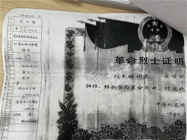 “爸爸,我們來看您了。今天終于知道您安葬在這里,以后我們會(huì)常來看您的!”7月14日傍晚,顧不上旅途的疲勞,山東威海籍烈屬劉昌存夫婦及兒女一起匆匆前往漳州市龍海區(qū)革命烈士陵園,看望安葬在這里的父親劉玉明。至此,劉昌存一家也成為龍海革命烈士紀(jì)念碑77名無名烈士中第一個(gè)前來祭拜的烈士家庭。 當(dāng)天下午,劉昌存來到龍海區(qū)退役軍人服務(wù)中心,向工作人員出示了一張革命烈士證明書,劉昌存向工作人員介紹了父親劉玉明的事跡。1946年劉玉明從山東榮成縣橋頭公社參軍入伍,1948年因傷回家休養(yǎng),同年養(yǎng)完傷后回歸原部隊(duì)。此時(shí)妻子呂桂明已經(jīng)懷有身孕,1949年10月,劉玉明因戰(zhàn)犧牲,部隊(duì)根據(jù)他本人所留地址將革命烈士證明送到家鄉(xiāng)(原件收藏于當(dāng)?shù)夭┪镳^),并留下口信,交代劉玉明犧牲后安葬于海澄縣革命烈士陵園。 由于當(dāng)時(shí)交通不便且信息較為閉塞,呂桂明只打聽到了海澄縣位于福建省,其它再無消息。隨著劉昌存逐漸長(zhǎng)大,呂桂明尋找丈夫墓地的愿望越來越深,曾經(jīng)也努力打聽過但都杳無音訊??粗赣H多年因思念父親落下的疾病,劉昌存心下暗想一定要幫母親圓多年夢(mèng)想,也要看看自己的父親到底安葬在何處。后經(jīng)網(wǎng)上查找、多方核實(shí),終于了解到龍海區(qū)有個(gè)鄉(xiāng)鎮(zhèn)叫海澄鎮(zhèn),很可能就是父親安葬的地方。于是,在和家人商量后,劉昌存攜妻兒等一起從山東威海輾轉(zhuǎn)來到福建龍海。 聽了劉昌存的故事,龍海區(qū)退役軍人服務(wù)中心的工作人員迅速將情況向局領(lǐng)導(dǎo)匯報(bào),并通過烈屬的自述查詢相關(guān)資料。經(jīng)核實(shí),劉玉明為山東省榮成縣橋頭公社(現(xiàn)橋頭鎮(zhèn))福祿莊人,任31軍91師272團(tuán)3營(yíng)班長(zhǎng),1949年10月15日,廈鼓戰(zhàn)役打響,劉玉明所在部隊(duì)主要任務(wù)是配合主力解放廈門,吸引廈門國(guó)民黨部隊(duì)炮火、飛機(jī)的所有炸彈。為保護(hù)廈門鼓浪嶼人民的生命財(cái)產(chǎn)和歷史文化建筑的完整,在盡量不使用重武器的前提下,部隊(duì)官兵與支前船工冒著槍林彈雨往前沖,哪怕身旁戰(zhàn)友們一排排地倒下,依舊前仆后繼,最終換取廈門的勝利解放,而年僅26歲的劉玉明也就在這場(chǎng)戰(zhàn)役中英勇犧牲。 戰(zhàn)況慘烈,傷亡重大。負(fù)責(zé)指揮這場(chǎng)戰(zhàn)役的葉飛將軍在后來的回憶錄《渡海登陸的成功一戰(zhàn)》中寫道:他回顧這場(chǎng)戰(zhàn)役,用了8個(gè)字來評(píng)價(jià):勝仗、險(xiǎn)仗、硬仗、惡仗。為紀(jì)念在廈鼓戰(zhàn)役中犧牲的烈士,龍海區(qū)修建了革命烈士紀(jì)念碑,碑內(nèi)安葬有77名無名烈士,另有12名支前船工。 “正是有像您父親這些革命先輩的浴血奮戰(zhàn),才有了我們今天幸福的生活和美麗繁華的廈門!”經(jīng)過相關(guān)資料核實(shí),劉玉明烈士最終被確認(rèn)是龍海革命烈士紀(jì)念碑77名無名烈士之一。聽到這個(gè)消息,劉玉明孫子劉響寧心情久久不能平靜,為了這一天,奶奶等了73年,終于可以圓夢(mèng)了,按捺不住激動(dòng)的心情,劉昌存一家踏上幸福返鄉(xiāng)的旅程,他們想要快點(diǎn)把這里的所見所聞告訴親人。 |