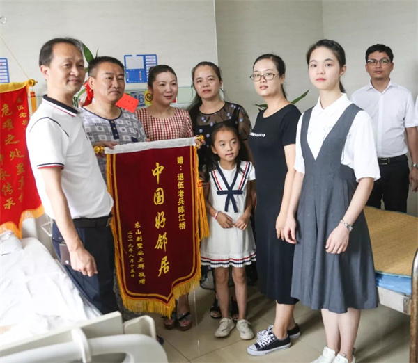 7月17日,第十四屆全國見義勇為英雄模范表彰大會(huì)召開,陳江橋作為全國見義勇為英雄,在北京接受表彰。這個(gè)故事,還要從3年前的一個(gè)午后說起—— “你出去,不關(guān)你的事,不然對你不客氣!”面對持刀歹徒的恫嚇,危急時(shí)刻,退伍軍人陳江橋挺身而出,從歹徒刀下救出被挾持的母女,并與歹徒展開殊死搏斗,身中4刀,仍繼續(xù)追趕歹徒,直至體力不支…… 2019年7月29日中午,一陣急促的呼救聲,打破了龍巖市漳平市某住宅區(qū)的寂靜?!爸袊绵従印标惤瓨蛞娏x勇為、不畏強(qiáng)暴的義舉,讓該母女轉(zhuǎn)危為安,更激起了全社會(huì)的正義感,歹徒被繩之以法。 而他的傷情受到了漳平全市的廣泛關(guān)注,不少漳平市民也紛紛為他祈福點(diǎn)贊。陳江橋先后被授予“中國好人”“福建省見義勇為英雄”“龍巖市道德模范”、龍巖市首屆“最美退役軍人”等榮譽(yù)稱號(hào)。 歹徒兇殘,他挺身而出護(hù)鄰居周全 平靜的午后,一名窮兇極惡的歹徒手持匕首,突然闖入了吳女士家中,將吳女士的女兒瞬間劫持?!澳阆敫蓡??放開我女兒?!贝跬街幻俺隽?個(gè)字“要錢”。在對峙過程中,吳女士將門打開,直呼救命。 此時(shí),鄰居陳江橋在家剛剛吃完午飯,突然聽到隔壁一陣嘈雜聲,似乎有人在求救。他急忙沖出門口,發(fā)現(xiàn)對面鄰居吳女士家里,一名男子正在實(shí)施搶劫。 陳江橋見狀,喝令該男子把匕首扔掉將人放開,該男子稱“你出去,不關(guān)你的事,不然對你不客氣?!鼻闆r危急,男子情緒激動(dòng),隨時(shí)可能傷害受害人。陳江橋趁機(jī)抓起門口的一個(gè)空花盆砸向男子,被男子用手擋開。隨后,該男子惱羞成怒,手持匕首朝陳江橋瘋狂砍刺,陳江橋不顧自身安危,沖上前去將吳女士女兒往后一拉,與歹徒搏斗在一起。 兩人從屋內(nèi)扭打至門口,直至滾至樓梯中間平臺(tái)……該男子掙脫后奪路而逃,陳江橋追了幾步因失血過多倒在地上。隨后,在及時(shí)趕到現(xiàn)場的民警、醫(yī)務(wù)人員的幫助下,滿身鮮血的陳江橋被緊急送往漳平市總醫(yī)院搶救。半個(gè)小時(shí)后,歹徒在公安機(jī)關(guān)強(qiáng)大的追捕攻勢下,主動(dòng)投案自首。 身中四刀,他用血染風(fēng)采捍衛(wèi)正義 陳江橋身中四刀,其中脖頸、背部、腰部三刀最為嚴(yán)重,“經(jīng)檢查,陳江橋的背部傷口有23至25厘米長,頸部的傷口有7、8厘米,如果再延伸一點(diǎn),頸內(nèi)靜脈、動(dòng)脈一旦損傷,后果不堪設(shè)想?!眳⑴c搶救的醫(yī)務(wù)人員介紹,所幸陳江橋經(jīng)搶救后無生命危險(xiǎn)。 在與歹徒的搏斗中,歹徒手持利刃對陳江橋進(jìn)行多次砍刺。在現(xiàn)場,醫(yī)務(wù)人員發(fā)現(xiàn)陳江橋身中多處刀傷,滿身鮮血,其中背后衣服被劃開一個(gè)大口,鮮血直流。 “當(dāng)時(shí),最要緊的是保證人質(zhì)的安全,后來雖然人質(zhì)已經(jīng)脫離歹徒的控制,但歹徒手持利刃,我怕他再傷害小區(qū)里其他人,所以不能輕易讓他逃脫,必須控制住他?!标惤瓨蚧貞浀?。 據(jù)當(dāng)時(shí)監(jiān)控顯示,從吳女士家門口到樓梯平臺(tái),歹徒對陳江橋又進(jìn)行多次砍刺,但陳江橋毫無退縮,在嚴(yán)重受傷的情況下抓住歹徒不放,堅(jiān)持與其纏斗,直到受傷力竭。 在陳江橋住院及康復(fù)期間,鄰居還專門制作一面“中國好鄰居”的錦旗送到醫(yī)院,為他送上祝福。 真誠仗義,他堅(jiān)守初心退役不褪色 “我們都很心疼,但是非常理解。因?yàn)樗恢焙軣嵝摹⒑苡赂?。”陳江橋的愛人鄭女士說,陳江橋是一名共產(chǎn)黨員,也是一名退役軍人,碰到不平事總會(huì)插手,對朋友熱情仗義。 1990年至1993年,陳江橋在駐泉州的某野戰(zhàn)部隊(duì)服役,在軍隊(duì)的幾年里,既練就強(qiáng)壯的身體,又鑄就了堅(jiān)強(qiáng)的品格,雖然已退役多年,但他一直以軍人的標(biāo)準(zhǔn)嚴(yán)格要求自己。 當(dāng)時(shí)事發(fā)突然,但是許多陳江橋身邊的親人、朋友覺得他會(huì)做出這樣的舉動(dòng)并不意外,因?yàn)樵诖蠹已壑?,他一直是個(gè)熱心、實(shí)誠且充滿正義感的人。 陳江橋所在單位漳平市委宣傳部同事介紹,“江橋是部里的‘元老’,工作多年來,他兢兢業(yè)業(yè),任勞任怨,同事有什么事情需要幫忙,往往一句話他便盡力幫忙。”“跟他認(rèn)識(shí)18年了,陳江橋工作比較認(rèn)真,對自己要求嚴(yán)格,非常嚴(yán)謹(jǐn),總是保持當(dāng)兵‘退伍不褪色’的精神?!闭勂痍惤瓨?,他的朋友盧炳坤這樣說。 鄰居吳女士在事發(fā)后仍心有余悸,對陳江橋的舉動(dòng)多次表示感謝,她說,“要是沒有他的幫忙,后果不堪設(shè)想。”她同時(shí)表示,他們鄰里之間關(guān)系很好,經(jīng)?;ハ鄮兔?,偶爾誰家出遠(yuǎn)門,都會(huì)叫鄰居幫忙照看家里。 陳江橋的多年好友們則回憶了這么一件事。1999年前后,陳江橋開車下鄉(xiāng)到溪南鎮(zhèn),回來的路上發(fā)現(xiàn)路邊發(fā)生了一起車禍,一輛摩托車被小汽車撞倒,摩托車駕駛員倒地不起,傷勢嚴(yán)重。陳江橋看到后二話不說,趕忙將傷者抬上車送至醫(yī)院,背著滿身是血的傷者直奔搶救室,直至家屬趕到才離開。 他沒有把曾經(jīng)是軍人的身份掛在嘴上,更沒有把幫助他人的事情記在心上,而是以在實(shí)際行動(dòng)默默詮釋熱心與擔(dān)當(dāng)?!拔抑皇亲隽藨?yīng)該