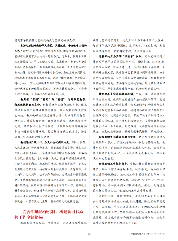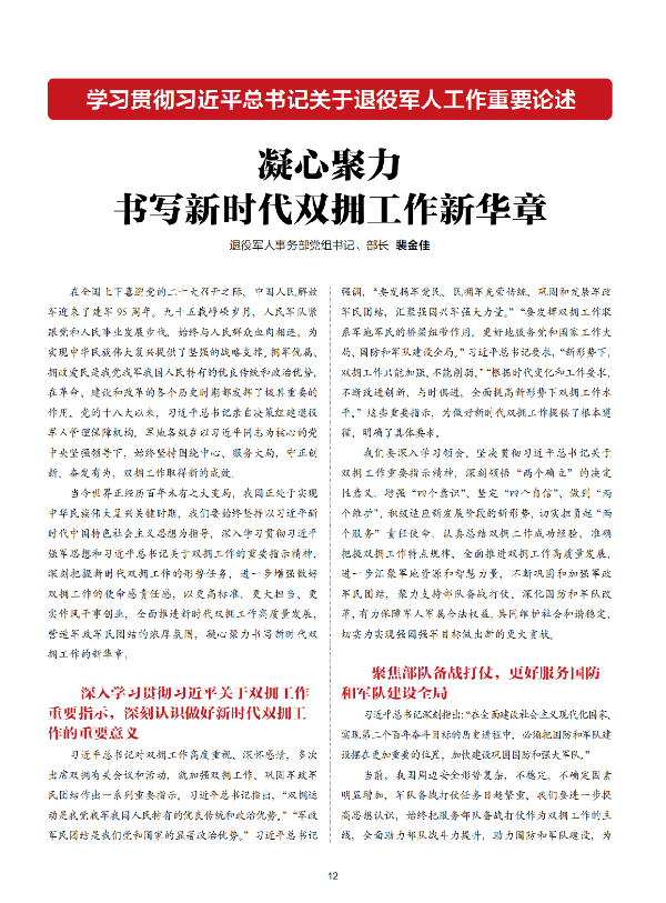 《中國(guó)退役軍人》雜志2022年第八期在重要位置推出“學(xué)習(xí)貫徹習(xí)近平總書記關(guān)于退役軍人工作重要論述”專欄,刊發(fā)了退役軍人事務(wù)部黨組書記、部長(zhǎng)裴金佳署名文章《凝心聚力書寫新時(shí)代雙擁工作新華章》。 凝心聚力書寫新時(shí)代雙擁工作新華章 退役軍人事務(wù)部黨組書記、部長(zhǎng) 裴金佳 在全國(guó)上下喜迎黨的二十大召開之際,中國(guó)人民解放軍迎來(lái)了建軍95 周年。九十五載崢嶸歲月,人民軍隊(duì)緊跟黨和人民事業(yè)發(fā)展步伐,始終與人民群眾血肉相連,為實(shí)現(xiàn)中華民族偉大復(fù)興提供了堅(jiān)強(qiáng)的戰(zhàn)略支撐。擁軍優(yōu)屬、擁政愛民是我黨我軍我國(guó)人民特有的優(yōu)良傳統(tǒng)和政治優(yōu)勢(shì),在革命、建設(shè)和改革的各個(gè)歷史時(shí)期都發(fā)揮了極其重要的作用。黨的十八大以來(lái),習(xí)近平總書記親自決策組建退役軍人管理保障機(jī)構(gòu),軍地各級(jí)在以習(xí)近平同志為核心的黨中央堅(jiān)強(qiáng)領(lǐng)導(dǎo)下,始終堅(jiān)持圍繞中心、服務(wù)大局,守正創(chuàng)新、奮發(fā)有為,雙擁工作取得新的成效。 當(dāng)今世界正經(jīng)歷百年未有之大變局,我國(guó)正處于實(shí)現(xiàn)中華民族偉大復(fù)興關(guān)鍵時(shí)期,我們要始終堅(jiān)持以習(xí)近平新時(shí)代中國(guó)特色社會(huì)主義思想為指導(dǎo),深入學(xué)習(xí)貫徹習(xí)近平強(qiáng)軍思想和習(xí)近平總書記關(guān)于雙擁工作的重要指示精神,深刻把握新時(shí)代雙擁工作的形勢(shì)任務(wù),進(jìn)一步增強(qiáng)做好雙擁工作的使命感責(zé)任感,以更高標(biāo)準(zhǔn)、更大擔(dān)當(dāng)、更實(shí)作風(fēng)干事創(chuàng)業(yè),全面推進(jìn)新時(shí)代雙擁工作高質(zhì)量發(fā)展,營(yíng)造軍政軍民團(tuán)結(jié)的濃厚氛圍,凝心聚力書寫新時(shí)代雙擁工作的新華章。 深入學(xué)習(xí)貫徹習(xí)近平關(guān)于雙擁工作重要指示 深刻認(rèn)識(shí)做好新時(shí)代雙擁工作的重要意義 習(xí)近平總書記對(duì)雙擁工作高度重視、深懷感情,多次出席雙擁有關(guān)會(huì)議和活動(dòng),就加強(qiáng)雙擁工作、鞏固軍政軍民團(tuán)結(jié)作出一系列重要指示。習(xí)近平總書記指出,“雙擁運(yùn)動(dòng)是我黨我軍我國(guó)人民特有的優(yōu)良傳統(tǒng)和政治優(yōu)勢(shì)。”“軍政軍民團(tuán)結(jié)是我們黨和國(guó)家的顯著政治優(yōu)勢(shì)?!绷?xí)近平總書記強(qiáng)調(diào),“要發(fā)揚(yáng)軍愛民、民擁軍光榮傳統(tǒng),鞏固和發(fā)展軍政軍民團(tuán)結(jié),匯聚強(qiáng)國(guó)興軍強(qiáng)大力量。”“要發(fā)揮雙擁工作聯(lián)系軍地軍民的橋梁紐帶作用,更好地服務(wù)黨和國(guó)家工作大局、國(guó)防和軍隊(duì)建設(shè)全局。”習(xí)近平總書記要求,“新形勢(shì)下,雙擁工作只能加強(qiáng)、不能削弱?!薄案鶕?jù)時(shí)代變化和工作要求,不斷改進(jìn)創(chuàng)新、與時(shí)俱進(jìn),全面提高新形勢(shì)下雙擁工作水平?!边@些重要指示,為做好新時(shí)代雙擁工作提供了根本遵循、明確了具體要求。 我們要深入學(xué)習(xí)領(lǐng)會(huì)、堅(jiān)決貫徹習(xí)近平總書記關(guān)于雙擁工作的重要指示精神,深刻領(lǐng)悟“兩個(gè)確立”的決定性意義,增強(qiáng)“四個(gè)意識(shí)”、堅(jiān)定“四個(gè)自信”、做到“兩個(gè)維護(hù)”,積極適應(yīng)新發(fā)展階段的新形勢(shì),切實(shí)擔(dān)負(fù)起“兩個(gè)服務(wù)”責(zé)任使命,認(rèn)真總結(jié)雙擁工作成功經(jīng)驗(yàn),準(zhǔn)確把握雙擁工作特點(diǎn)規(guī)律,全面推進(jìn)雙擁工作高質(zhì)量發(fā)展,進(jìn)一步匯聚軍地資源和智慧力量,不斷鞏固和加強(qiáng)軍政軍民團(tuán)結(jié),聚力支持部隊(duì)備戰(zhàn)打仗、深化國(guó)防和軍隊(duì)改革,有力保障軍人軍屬合法權(quán)益,共同維護(hù)社會(huì)和諧穩(wěn)定,切實(shí)為實(shí)現(xiàn)強(qiáng)國(guó)強(qiáng)軍目標(biāo)做出新的更大貢獻(xiàn)。 聚焦部隊(duì)備戰(zhàn)打仗 更好服務(wù)國(guó)防和軍隊(duì)建設(shè)全局 習(xí)近平總書記深刻指出:“在全面建設(shè)社會(huì)主義現(xiàn)代化國(guó)家、實(shí)現(xiàn)第二個(gè)百年奮斗目標(biāo)的歷史進(jìn)程中,必須把國(guó)防和軍隊(duì)建設(shè)擺在更加重要的位置,加快建設(shè)鞏固國(guó)防和強(qiáng)大軍隊(duì)?!?/p> 當(dāng)前,我國(guó)周邊安全形勢(shì)復(fù)雜,不穩(wěn)定、不確定因素明顯增加,軍隊(duì)備戰(zhàn)打仗任務(wù)日趨繁重。我們要進(jìn)一步提高思想認(rèn)識(shí),始終把服務(wù)部隊(duì)備戰(zhàn)打仗作為雙擁工作的主線,全面助力部隊(duì)?wèi)?zhàn)斗力提升,助力國(guó)防和軍隊(duì)建設(shè),為實(shí)現(xiàn)中華民族偉大復(fù)興提供更為堅(jiān)強(qiáng)的戰(zhàn)略支撐。 要持之以恒地做好軍人安置、家屬就業(yè)、子女就學(xué)方面的工作。“后方”連著“前線”,做好這些工作,解除官兵后顧之憂,能夠有效激勵(lì)官兵全力投入練兵備戰(zhàn)。近年來(lái),國(guó)防和軍隊(duì)改革持續(xù)深化,軍人在退役安置、家屬就業(yè)、子女入學(xué)等方面遇到許
