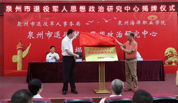 9月27日,全省首個退役軍人思想政治研究中心——泉州市退役軍人思想政治研究中心(以下簡稱“研究中心”)在泉州海洋職業(yè)學(xué)院成立。泉州市退役軍人事務(wù)局黨組書記、局長唐良元、泉州海洋職業(yè)學(xué)院董事長蔡天真共同為該研究中心揭牌并為研究中心校外首批7名特聘專家頒發(fā)證書。 “泉州市退役軍人思想政治研究中心的成立,是落實中央和省委退役軍人事務(wù)工作領(lǐng)導(dǎo)小組工作意見,結(jié)合新時期發(fā)展特點推進我市退役軍人思想政治工作的一項具體務(wù)實舉措?!?唐良元介紹,該研究中心的主要任務(wù)是成立科研團隊、開展課題研究、深化“軍民情·連心橋”主題活動,拓展大講堂、沙龍和“心靈茶室”等系列活動,真正從退役軍人生活、工作的實處、困處、難處化解矛盾和問題。此外,研究中心的成立還將起到“筑巢引鳳”的示范作用,積極整合全省思政教育資源平臺及思政領(lǐng)域業(yè)界高水平專家,推動退役軍人思想政治工作進一步優(yōu)化落實。 推動退役軍人思想政治工作發(fā)展有益探索,實現(xiàn)高校和政府部門有機聯(lián)動。近年來,泉州市退役軍人事務(wù)工作向高質(zhì)量發(fā)展邁出堅實步伐,多項工作走在全省前列。去年,泉州榮獲“全國雙擁模范城”九連冠、實現(xiàn)“一帶三”目標(biāo),受命名數(shù)量與蘇州市并列全國第一。今年,泉州榮獲福建省雙擁模范城(縣)“滿堂紅”四連冠;還成立泉州市退役軍人關(guān)愛協(xié)會和關(guān)愛基金,共有1871支退役軍人志愿服務(wù)隊和1.3萬多名退役軍人志愿者,涌現(xiàn)出陳聰河、溫文溪等一批全國、全省最美退役軍人,有力支撐退役軍人思想政治工作發(fā)展基礎(chǔ)。 在泉州市退役軍人局的指導(dǎo)和支持下,泉州海洋職業(yè)學(xué)院立足涉海院校準(zhǔn)軍事化管理基礎(chǔ),將“軍營旅”作為學(xué)校的發(fā)展特色,打造了一系列思政育人品牌,多次榮獲福建省職業(yè)教育教學(xué)成果獎。該校還在全省建立首個民辦高校退役軍人服務(wù)站,目前學(xué)校共有退役軍人98名,成立一支25人退役軍人志愿服務(wù)隊,與本地多所學(xué)校合作開展軍訓(xùn)教育和研學(xué)活動,參與學(xué)生2萬余人。 |
