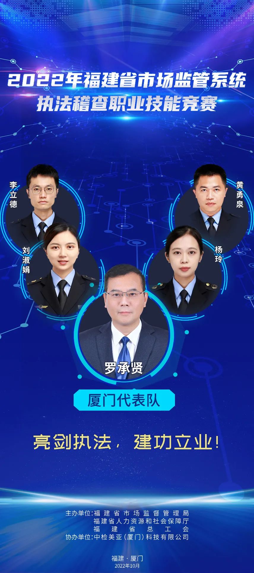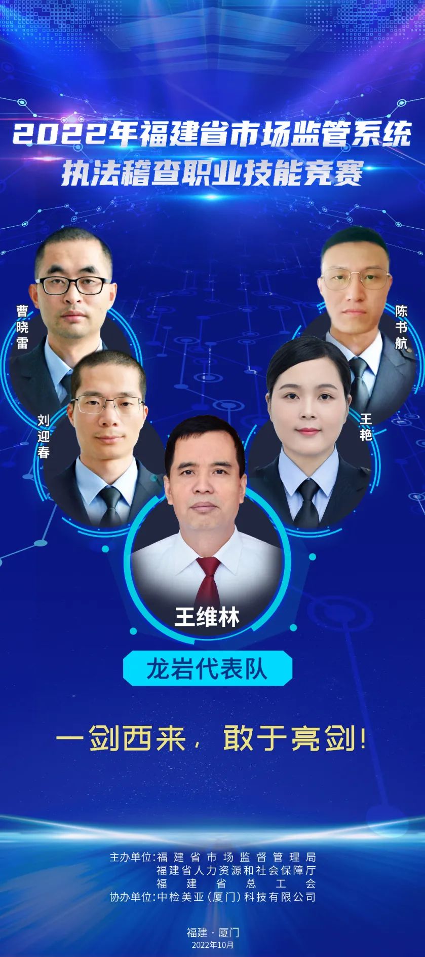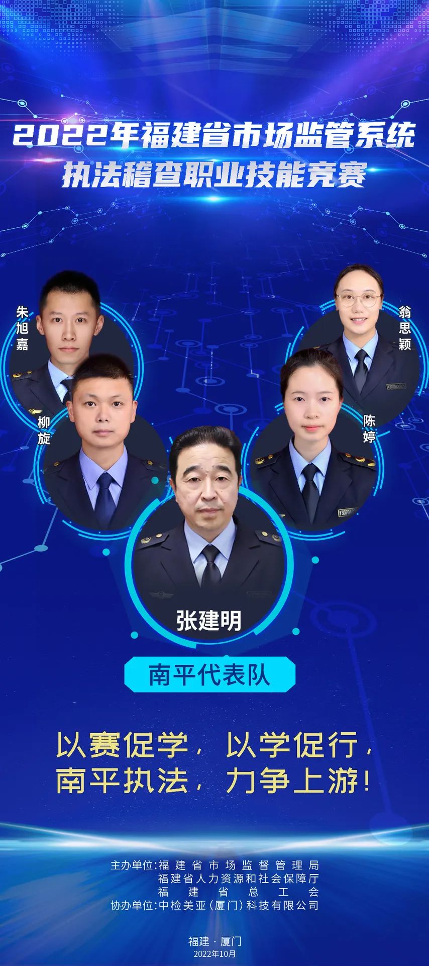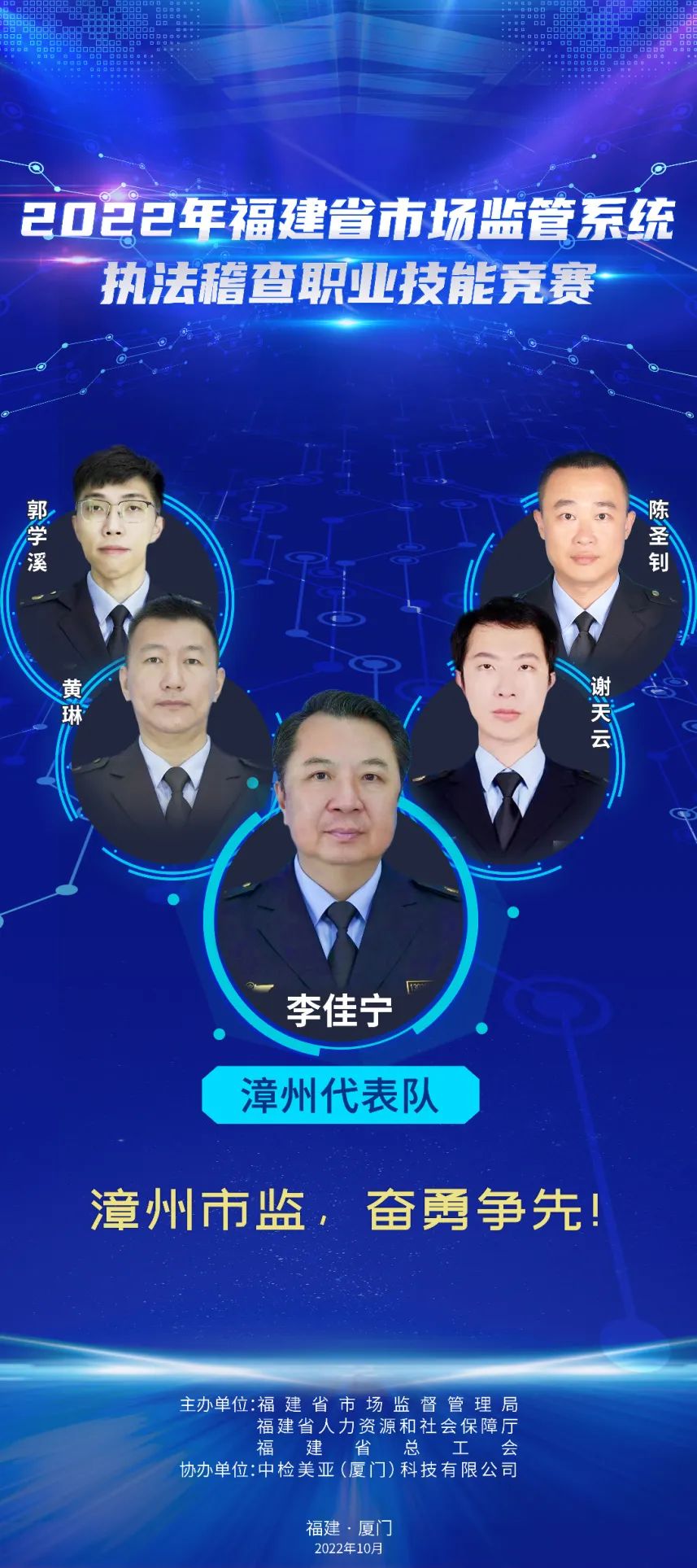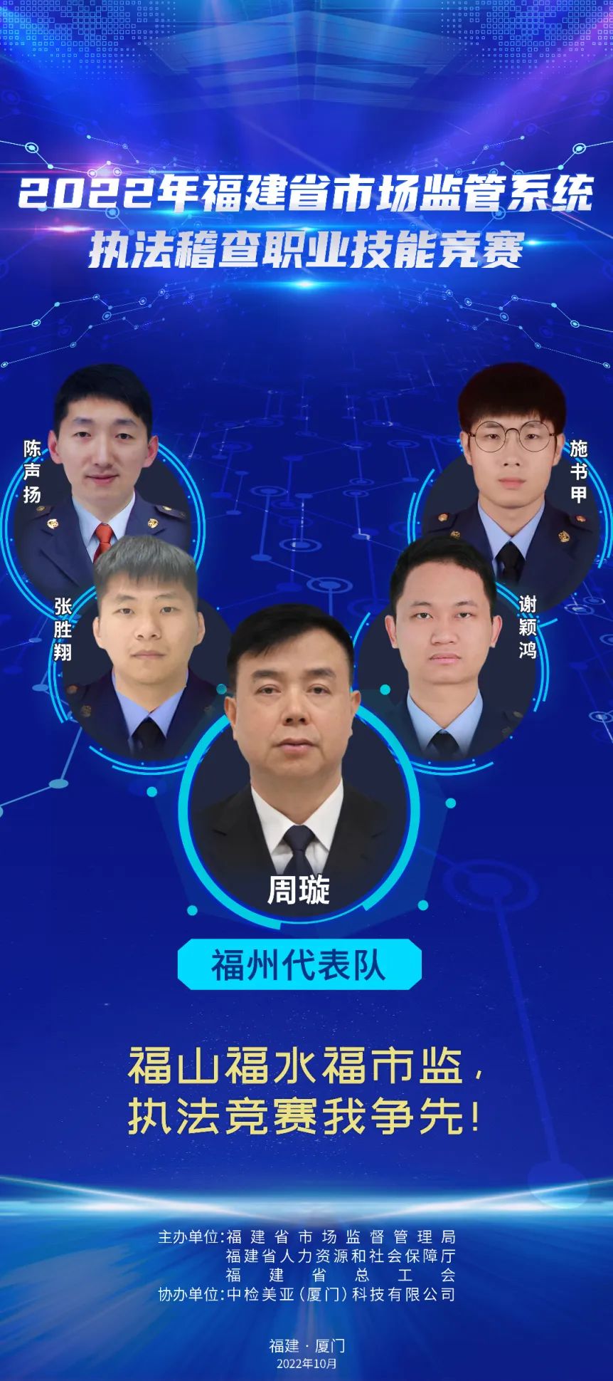 為推進(jìn)維護(hù)統(tǒng)一市場(chǎng)綜合執(zhí)法能力建設(shè),選出一批辦案能手,進(jìn)一步在市場(chǎng)監(jiān)管系統(tǒng)強(qiáng)化法治思維,規(guī)范執(zhí)法行為,提升執(zhí)法水平,鍛造“敢執(zhí)法、能執(zhí)法、善執(zhí)法、會(huì)執(zhí)法”的專業(yè)化市場(chǎng)監(jiān)管鐵軍,2022年福建省市場(chǎng)監(jiān)管系統(tǒng)執(zhí)法稽查職業(yè)技能競(jìng)賽活動(dòng)正式舉辦,全省10支代表隊(duì)40名參賽選手,厲兵秣馬展開激烈角逐。他們分別是誰(shuí)? 成員簡(jiǎn)介:周璇(領(lǐng)隊(duì)),福州市市場(chǎng)監(jiān)管局黨組成員、副局長(zhǎng)。 謝穎鴻:男,漢族,中共黨員,現(xiàn)任福州經(jīng)濟(jì)技術(shù)開發(fā)區(qū)市場(chǎng)監(jiān)督管理局行政執(zhí)法大隊(duì)一級(jí)科員。長(zhǎng)期從事市場(chǎng)監(jiān)管執(zhí)法一線工作,查處過(guò)廣告、食品、特種設(shè)備、反不正當(dāng)競(jìng)爭(zhēng)、價(jià)格、知識(shí)產(chǎn)權(quán)等各類市場(chǎng)違法案件,有較高的辦案能力,掌握較全面的法律知識(shí)。 張勝翔:男,漢族,中共黨員,現(xiàn)為福州市長(zhǎng)樂(lè)區(qū)市場(chǎng)監(jiān)督管理局江田市場(chǎng)監(jiān)管所一級(jí)科員,借調(diào)金峰市場(chǎng)監(jiān)管所,從事一線執(zhí)法工作,查處過(guò)商標(biāo)、食品、化妝品、特種設(shè)備、侵犯消費(fèi)者權(quán)益等各類市場(chǎng)違法案件,有較高辦案能力,掌握較全面法律知識(shí)。 陳聲揚(yáng):男,漢族,中共黨員,福州高新區(qū)市場(chǎng)監(jiān)督管理行政執(zhí)法大隊(duì)二中隊(duì)長(zhǎng),畢業(yè)于福建師范大學(xué)日語(yǔ)專業(yè)。2017年進(jìn)入福州高新區(qū)市場(chǎng)監(jiān)督管理行政執(zhí)法大隊(duì)至今,主要從事工商、質(zhì)監(jiān)、知識(shí)產(chǎn)權(quán)保護(hù)等方面違法行為的查處。 施書甲:男,漢族,中共黨員,現(xiàn)任閩清縣市場(chǎng)監(jiān)督管理局綜合執(zhí)法大隊(duì)科員,長(zhǎng)期從事執(zhí)法一線工作,自參加工作以來(lái),先后從事食品、藥品、化妝品、專利、商標(biāo)、反不正當(dāng)競(jìng)爭(zhēng)、價(jià)格、廣告等領(lǐng)域執(zhí)法辦案工作,具備較為全面的綜合執(zhí)法經(jīng)驗(yàn)。 成員簡(jiǎn)介:羅承賢(領(lǐng)隊(duì)),廈門市市場(chǎng)監(jiān)管局黨組成員、副局長(zhǎng)。 劉淑娟:女,廈門市集美區(qū)市場(chǎng)監(jiān)管局杏林所三中隊(duì)中隊(duì)長(zhǎng),2018年以來(lái)該同志共辦結(jié)各類市場(chǎng)監(jiān)管違法案件254件,罰沒(méi)款949.72萬(wàn)元,多起案件入選國(guó)家、省、市級(jí)典型案例。2019年參加全國(guó)市場(chǎng)監(jiān)管執(zhí)法電子取證技能大比武,榮獲團(tuán)體一等獎(jiǎng)。2020年榮立公務(wù)員三等功。2021年參加首屆福建省市場(chǎng)監(jiān)管系統(tǒng)執(zhí)法辦案電子數(shù)據(jù)取證大比武,榮獲團(tuán)體一等獎(jiǎng)。 楊玲:女,湖里區(qū)市場(chǎng)監(jiān)督管理局湖里所四級(jí)主任科員,2019年入職以來(lái)一直從事一線執(zhí)法辦案工作,2021年7月代表廈門局參加首屆福建省市場(chǎng)監(jiān)管系統(tǒng)執(zhí)法辦案電子數(shù)據(jù)取證大比武獲個(gè)人二等獎(jiǎng),團(tuán)體一等獎(jiǎng)。2022年7月代表福建省參加第二屆全國(guó)市場(chǎng)監(jiān)管執(zhí)法辦案電子數(shù)據(jù)取證大比武,獲個(gè)人第五名,團(tuán)體第二名。 黃勇泉:男,思明區(qū)市場(chǎng)監(jiān)管局蓮前所一中隊(duì)中隊(duì)長(zhǎng),歷任監(jiān)管、許可、執(zhí)法等工作崗位,有較豐富的基層工作經(jīng)驗(yàn),兩起案件入選國(guó)家典型案例,2020年榮立公務(wù)員三等功。2018年參加全國(guó)食品安全法律知識(shí)競(jìng)賽,獲得半決賽團(tuán)體第一名,2019年參加全國(guó)市場(chǎng)監(jiān)管法律知識(shí)競(jìng)賽,獲得團(tuán)體第六名。 李立德:男,海滄市場(chǎng)監(jiān)督管理所一級(jí)科員,2021年入職以來(lái)主要從事監(jiān)管和執(zhí)法工作。作為一名有多年工作經(jīng)驗(yàn)的“工程師+技師”轉(zhuǎn)行市場(chǎng)監(jiān)管系統(tǒng)的“新兵”,入職以來(lái)積極學(xué)習(xí),參與查辦了廈門市首起侵犯奧林匹克標(biāo)志專用權(quán)案、出租不合格電動(dòng)車案等多起有影響力的案件。 成員簡(jiǎn)介:李佳寧(領(lǐng)隊(duì)),漳州市市場(chǎng)監(jiān)管局黨組成員、二級(jí)調(diào)研員。 陳圣釗:男,2007年福建師范大學(xué)生物工程本科畢業(yè),2022年4月任職東山縣市場(chǎng)監(jiān)督管理局西埔市場(chǎng)監(jiān)督管理所副所長(zhǎng),從事投訴舉報(bào)核查處置、案件查辦等一線監(jiān)管執(zhí)法工作,先后辦理食品、化妝品、特種設(shè)備、知識(shí)產(chǎn)權(quán)等多種類型案件。 黃琳:男,2005年西安郵電學(xué)院通信工程本科畢業(yè),長(zhǎng)期從事有線無(wú)線衛(wèi)星通信、網(wǎng)絡(luò)、電子信息技術(shù)相關(guān)工作。2022年1月任職漳州市市場(chǎng)監(jiān)督管理綜合執(zhí)法支隊(duì)科員,從事一線執(zhí)法工作。 郭學(xué)溪:男,漳州市市場(chǎng)監(jiān)督管理綜合執(zhí)法支隊(duì)干部。2008年以來(lái)長(zhǎng)期在一線執(zhí)法崗位工作,先后主辦過(guò)食品、藥品、醫(yī)療