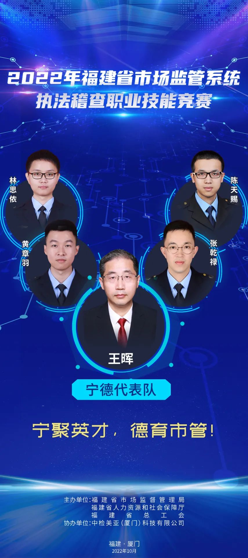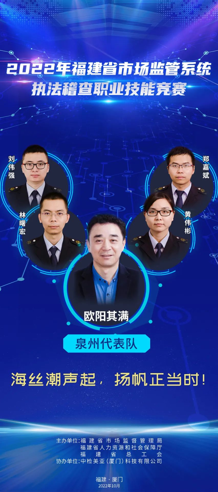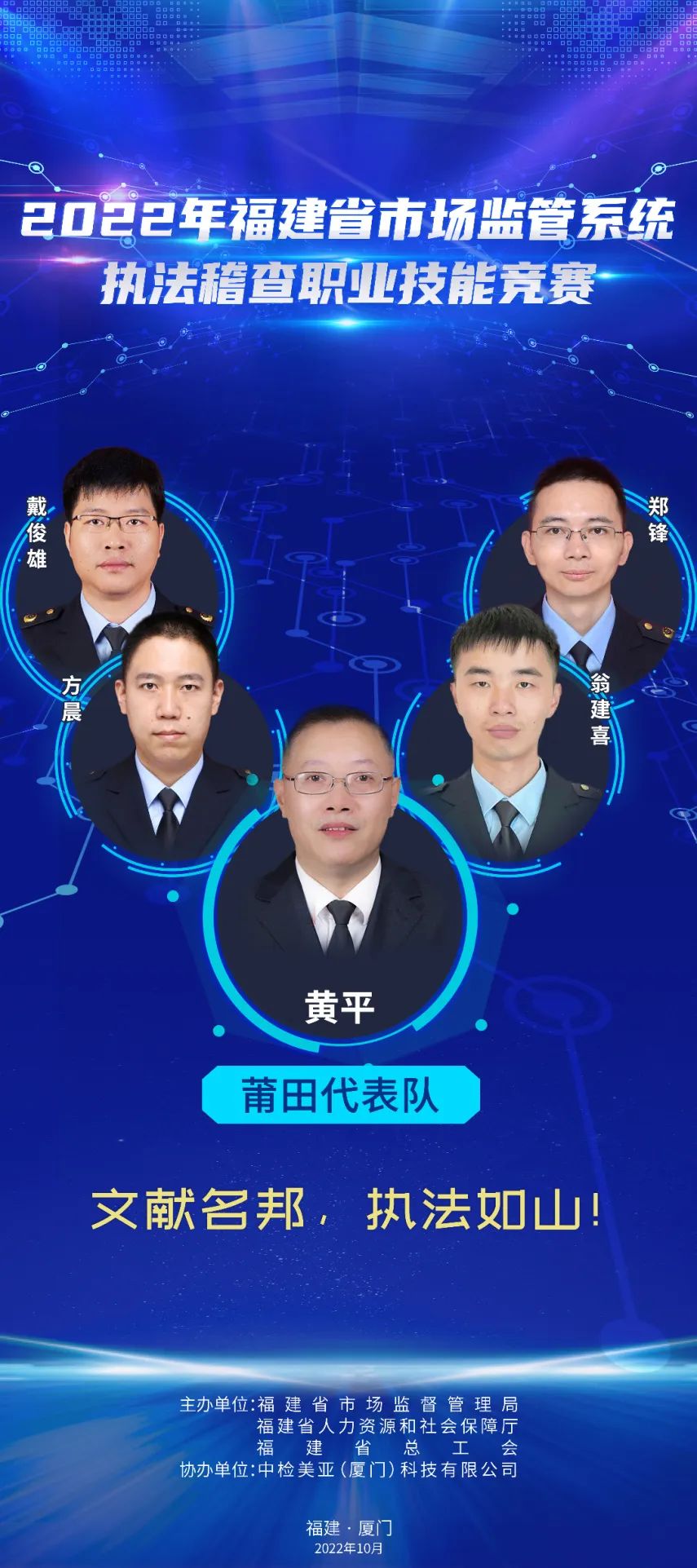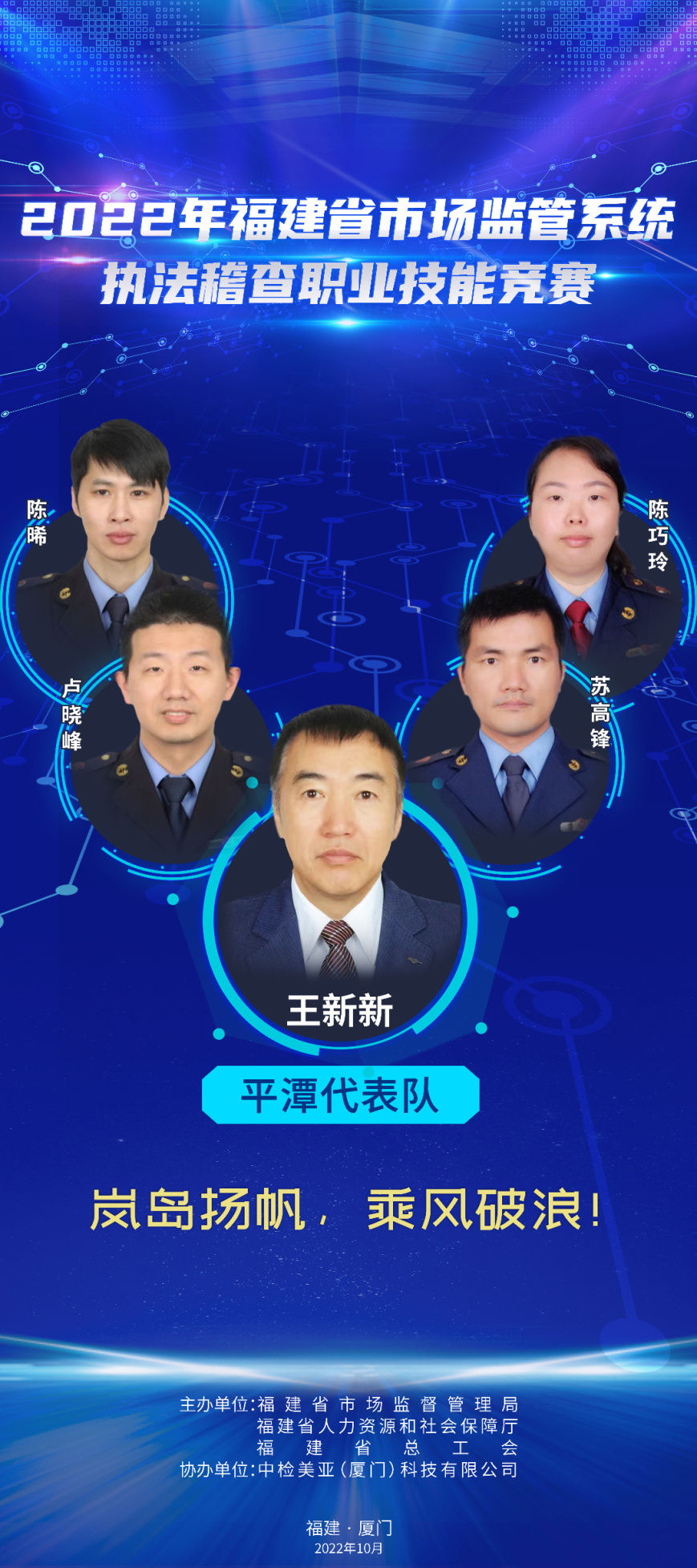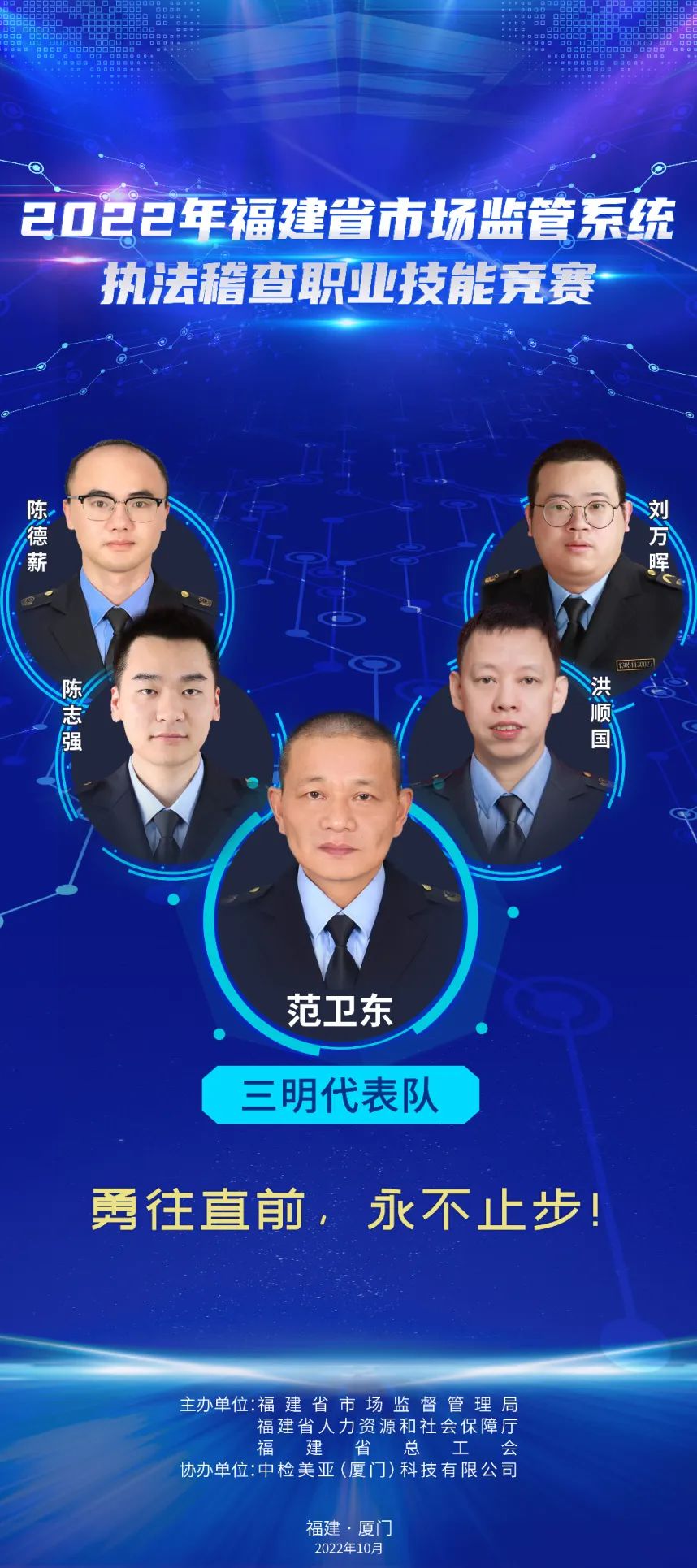 為推進(jìn)維護(hù)統(tǒng)一市場(chǎng)綜合執(zhí)法能力建設(shè),選出一批辦案能手,進(jìn)一步在市場(chǎng)監(jiān)管系統(tǒng)強(qiáng)化法治思維,規(guī)范執(zhí)法行為,提升執(zhí)法水平,鍛造“敢執(zhí)法、能執(zhí)法、善執(zhí)法、會(huì)執(zhí)法”的專業(yè)化市場(chǎng)監(jiān)管鐵軍,2022年福建省市場(chǎng)監(jiān)管系統(tǒng)執(zhí)法稽查職業(yè)技能競(jìng)賽活動(dòng)正式舉辦,全省10支代表隊(duì)40名參賽選手,厲兵秣馬展開激烈角逐。他們分別是誰(shuí)? 成員簡(jiǎn)介:周璇(領(lǐng)隊(duì)),福州市市場(chǎng)監(jiān)管局黨組成員、副局長(zhǎng)。 謝穎鴻:男,漢族,中共黨員,現(xiàn)任福州經(jīng)濟(jì)技術(shù)開發(fā)區(qū)市場(chǎng)監(jiān)督管理局行政執(zhí)法大隊(duì)一級(jí)科員。長(zhǎng)期從事市場(chǎng)監(jiān)管執(zhí)法一線工作,查處過(guò)廣告、食品、特種設(shè)備、反不正當(dāng)競(jìng)爭(zhēng)、價(jià)格、知識(shí)產(chǎn)權(quán)等各類市場(chǎng)違法案件,有較高的辦案能力,掌握較全面的法律知識(shí)。 張勝翔:男,漢族,中共黨員,現(xiàn)為福州市長(zhǎng)樂(lè)區(qū)市場(chǎng)監(jiān)督管理局江田市場(chǎng)監(jiān)管所一級(jí)科員,借調(diào)金峰市場(chǎng)監(jiān)管所,從事一線執(zhí)法工作,查處過(guò)商標(biāo)、食品、化妝品、特種設(shè)備、侵犯消費(fèi)者權(quán)益等各類市場(chǎng)違法案件,有較高辦案能力,掌握較全面法律知識(shí)。 陳聲揚(yáng):男,漢族,中共黨員,福州高新區(qū)市場(chǎng)監(jiān)督管理行政執(zhí)法大隊(duì)二中隊(duì)長(zhǎng),畢業(yè)于福建師范大學(xué)日語(yǔ)專業(yè)。2017年進(jìn)入福州高新區(qū)市場(chǎng)監(jiān)督管理行政執(zhí)法大隊(duì)至今,主要從事工商、質(zhì)監(jiān)、知識(shí)產(chǎn)權(quán)保護(hù)等方面違法行為的查處。 施書甲:男,漢族,中共黨員,現(xiàn)任閩清縣市場(chǎng)監(jiān)督管理局綜合執(zhí)法大隊(duì)科員,長(zhǎng)期從事執(zhí)法一線工作,自參加工作以來(lái),先后從事食品、藥品、化妝品、專利、商標(biāo)、反不正當(dāng)競(jìng)爭(zhēng)、價(jià)格、廣告等領(lǐng)域執(zhí)法辦案工作,具備較為全面的綜合執(zhí)法經(jīng)驗(yàn)。 成員簡(jiǎn)介:羅承賢(領(lǐng)隊(duì)),廈門市市場(chǎng)監(jiān)管局黨組成員、副局長(zhǎng)。 劉淑娟:女,廈門市集美區(qū)市場(chǎng)監(jiān)管局杏林所三中隊(duì)中隊(duì)長(zhǎng),2018年以來(lái)該同志共辦結(jié)各類市場(chǎng)監(jiān)管違法案件254件,罰沒(méi)款949.72萬(wàn)元,多起案件入選國(guó)家、省、市級(jí)典型案例。2019年參加全國(guó)市場(chǎng)監(jiān)管執(zhí)法電子取證技能大比武,榮獲團(tuán)體一等獎(jiǎng)。2020年榮立公務(wù)員三等功。2021年參加首屆福建省市場(chǎng)監(jiān)管系統(tǒng)執(zhí)法辦案電子數(shù)據(jù)取證大比武,榮獲團(tuán)體一等獎(jiǎng)。 楊玲:女,湖里區(qū)市場(chǎng)監(jiān)督管理局湖里所四級(jí)主任科員,2019年入職以來(lái)一直從事一線執(zhí)法辦案工作,2021年7月代表廈門局參加首屆福建省市場(chǎng)監(jiān)管系統(tǒng)執(zhí)法辦案電子數(shù)據(jù)取證大比武獲個(gè)人二等獎(jiǎng),團(tuán)體一等獎(jiǎng)。2022年7月代表福建省參加第二屆全國(guó)市場(chǎng)監(jiān)管執(zhí)法辦案電子數(shù)據(jù)取證大比武,獲個(gè)人第五名,團(tuán)體第二名。 黃勇泉:男,思明區(qū)市場(chǎng)監(jiān)管局蓮前所一中隊(duì)中隊(duì)長(zhǎng),歷任監(jiān)管、許可、執(zhí)法等工作崗位,有較豐富的基層工作經(jīng)驗(yàn),兩起案件入選國(guó)家典型案例,2020年榮立公務(wù)員三等功。2018年參加全國(guó)食品安全法律知識(shí)競(jìng)賽,獲得半決賽團(tuán)體第一名,2019年參加全國(guó)市場(chǎng)監(jiān)管法律知識(shí)競(jìng)賽,獲得團(tuán)體第六名。 李立德:男,海滄市場(chǎng)監(jiān)督管理所一級(jí)科員,2021年入職以來(lái)主要從事監(jiān)管和執(zhí)法工作。作為一名有多年工作經(jīng)驗(yàn)的“工程師+技師”轉(zhuǎn)行市場(chǎng)監(jiān)管系統(tǒng)的“新兵”,入職以來(lái)積極學(xué)習(xí),參與查辦了廈門市首起侵犯奧林匹克標(biāo)志專用權(quán)案、出租不合格電動(dòng)車案等多起有影響力的案件。 成員簡(jiǎn)介:李佳寧(領(lǐng)隊(duì)),漳州市市場(chǎng)監(jiān)管局黨組成員、二級(jí)調(diào)研員。 陳圣釗:男,2007年福建師范大學(xué)生物工程本科畢業(yè),2022年4月任職東山縣市場(chǎng)監(jiān)督管理局西埔市場(chǎng)監(jiān)督管理所副所長(zhǎng),從事投訴舉報(bào)核查處置、案件查辦等一線監(jiān)管執(zhí)法工作,先后辦理食品、化妝品、特種設(shè)備、知識(shí)產(chǎn)權(quán)等多種類型案件。 黃琳:男,2005年西安郵電學(xué)院通信工程本科畢業(yè),長(zhǎng)期從事有線無(wú)線衛(wèi)星通信、網(wǎng)絡(luò)、電子信息技術(shù)相關(guān)工作。2022年1月任職漳州市市場(chǎng)監(jiān)督管理綜合執(zhí)法支隊(duì)科員,從事一線執(zhí)法工作。 郭學(xué)溪:男,漳州市市場(chǎng)監(jiān)督管理綜合執(zhí)法支隊(duì)干部。2008年以來(lái)長(zhǎng)期在一線執(zhí)法崗位工作,先后主辦過(guò)食品、藥品、醫(yī)療
