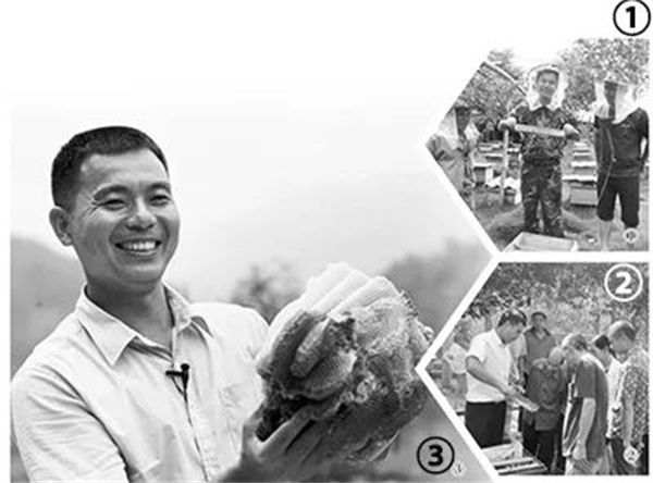 圖①:鐘亮生(中)與合作社成員察看蜜蜂產蜜情況。 圖②:鐘亮生(左一)面向當地農戶開展養(yǎng)蜂技術培訓。 圖③:鐘亮生展示蜂巢 冬日的閩西山區(qū),草木依然蔥蘢。 走進位于福建省龍巖市武平山區(qū)的一家林下養(yǎng)蜂基地,一排排蜂箱錯落有致地擺放在樹蔭下。循著“嗡嗡”聲望去,成群的蜜蜂穿梭于花叢間,蜂箱入口處的蜜蜂進進出出。 “眼下,基地氣溫下降到20攝氏度,正是蜜蜂繁殖分蜂、準備越冬的關鍵時期,要定期觀察蜂箱溫度,做好保溫工作……”看著集滿蜂蜜的蜂巢,基地負責人、退役軍人鐘亮生興致勃勃地向筆者回顧他的養(yǎng)蜂之路。 鐘亮生是當地有名的“蜂王”。16年前,鐘亮生抱著“試試看”的心態(tài),從父親手中接過20多只蜂箱。那時的他不曾想到,靠著小小蜜蜂,自己會成就一份“甜蜜的事業(yè)”。依托這份“甜蜜的事業(yè)”,窮山村換了天地,一方群眾走上幸福路。 “有價值的崗位就有趣味” “黨的二十大報告提出,推動綠色發(fā)展,促進人與自然和諧共生……”作為龍巖市“老兵宣講團”成員,黨的二十大召開后,鐘亮生深入當地機關單位和街道社區(qū),結合自己的養(yǎng)蜂創(chuàng)業(yè)經歷,宣傳綠色發(fā)展理念。 生長于青山綠水間,穿過綠軍裝,退役后自主創(chuàng)業(yè)發(fā)展綠色養(yǎng)殖,在鐘亮生看來,綠色是他人生的底色。 1993年,18歲的鐘亮生做出“影響自己一生”的決定:參軍入伍。新訓結束,他沒有被分到夢寐以求的作戰(zhàn)部隊,而是成為駐江西某部一座倉庫的管理員。 在很多戰(zhàn)友眼中,倉庫管理員的工作枯燥乏味。鐘亮生卻覺得,只要花了心思、用了感情,再平凡的崗位都會有價值,“有價值的崗位就有趣味”。 平日里,鐘亮生沒事就待在倉庫里,識型號、查數量,很快就對保管物資做到“品種清、數量清、質量清、批次清、配套清、文件手續(xù)清”。3個月后,當其他戰(zhàn)友每人只管理1個倉庫時,他已經把兩個倉庫打理得井井有條。 不久后,上級看中鐘亮生勤勞踏實,把他調到炊事班。毫無烹飪基礎的他沒有懈怠,從洗菜、切菜、配菜學起,苦練一招一式,提高烹飪技能。 1995年,上級舉辦炊事員大比武,鐘亮生和另外兩名戰(zhàn)友組隊參賽?!暗豆の也皇亲詈玫?,取菜名我也不是最棒的”,賽前準備時,擔心拖團隊后腿的鐘亮生另辟蹊徑,全力以赴提高炒菜速度。比賽時,鐘亮生和戰(zhàn)友們配合默契,一舉奪魁,榮立集體三等功。鐘亮生同時榮立個人三等功。 1998年,鐘亮生退役后回到福建老家,成為武平縣林業(yè)局一名護林員。2001年,因當地林業(yè)體制改革下崗后,他憑借在部隊練就的好手藝,在縣城開起路邊大排檔。 因為做生意實在,小吃品種多、味道好、分量足,鐘亮生的大排檔吸引了不少顧客。不到3年,幾張桌子的路邊攤擴大為5家店鋪。 見兒子生意紅火,在山間養(yǎng)蜂多年的父親把自家產的蜂蜜拿到店里代銷。那時的鐘亮生沒有想到,幾年后,他會追隨父親的腳步回歸山野,成為一名“甜蜜使者”。 “‘一鍋飯’大家一起吃才香” 早在20世紀80年代,鐘亮生的父親就開始養(yǎng)蜂。那時,由于山林產權歸屬不清,村民靠山吃山,亂砍濫伐現象導致蜜源稀少。盡管父親每天如蜜蜂一樣忙碌,卻只能換來微薄收入。周邊農戶的日子,也大都過得清苦。 2001年,始于“全國林改第一縣”——武平縣的集體林權制度改革,讓鐘亮生離開護林員崗位,也讓他看到養(yǎng)蜂項目的發(fā)展前景。 “‘林改’后,山定權、樹定根、人定心,人們護山、養(yǎng)山的積極性高漲,山上樹多了,花也多了。”鐘亮生說,父親原來養(yǎng)一箱蜂每年產8斤土蜂蜜,集體林權制度改革后,產量增加到20多斤,拿到店里銷售,廣受顧客歡迎。2006年,鐘亮生從父親手中接過20多只蜂箱,開始嘗試養(yǎng)蜂。從小受父親耳濡目染,加上能吃苦、肯鉆研,不到兩年,鐘亮生的養(yǎng)蜂規(guī)模擴大到200箱,成立了養(yǎng)蜂基地。 正當鐘亮生繼續(xù)壯大他的“甜蜜事業(yè)”,準備大展拳腳之際,一系列打擊接踵而來:2008年,一場突如其來的大雪凍死了基地大部分蜜蜂;次年3月,由于管理疏忽,蜜蜂發(fā)生幼蟲病,差點“全軍覆沒”。 “從哪里跌倒,就從哪里爬起來?!辈桓适〉溺娏辽I來各種專業(yè)書籍自學,并找機會向福建農林大學的專家們請教。經過不懈嘗試和努力,基地漸漸有了起色,養(yǎng)蜂數量和蜂蜜產量逐年增加,鐘亮生也成為遠近聞名的養(yǎng)蜂能手。 “小小微軀能負重,器器薄翅會乘風。”在鐘亮生看來,養(yǎng)蜂事業(yè)之所以取得成功,關鍵在于乘“林改”之風。為了讓更多鄉(xiāng)親分享這份甜蜜,2010年,鐘亮生成立了養(yǎng)蜂專業(yè)合作社,動員當地生活困難的農戶參加。他不僅通過“合作社+公司+基地+農戶”的管理模式,為蜂農提供保價回收蜂蜜等服務,還起早貪黑奔走于各個蜂場,拿著自編的養(yǎng)殖小冊子,將好不容易摸索出來的經驗傾囊相授。 有親友不理解鐘亮生:“明明可以一家獨大、做大做強,偏要帶著鄉(xiāng)親一起干,你就不怕將來人家和你搶飯吃?”鐘亮生樂呵呵地回應:“當炊事員時我們總說,‘一鍋飯’大家一起吃才香!” 隨著合作社養(yǎng)蜂規(guī)模越來越大,鐘亮生將經營項目拓展到蜂蜜加工和銷售領域,創(chuàng)新研發(fā)的蜂蜜酒、蜂蜜姜茶、蜂蜜護膚品等衍生產品,受到市場歡