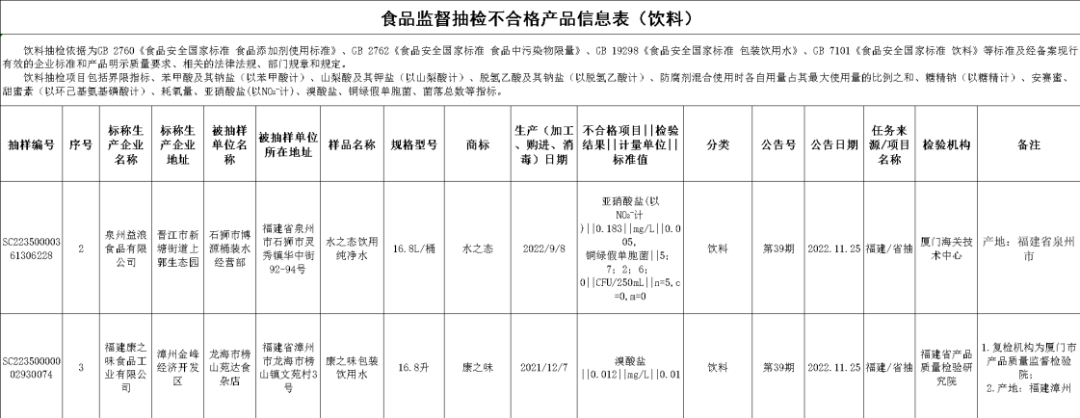 元旦將至 小伙伴們是不是 都在積極囤年貨啦 先!別!急! 看完本期抽檢再?zèng)Q定 第39期公告的監(jiān)督抽檢信息涉及29大類(lèi)食品1498批次,包括:糧食加工品、食用油(含油脂及其制品)、調(diào)味品、肉制品、乳制品、飲料、方便食品、餅干、罐頭、冷凍飲品、速凍食品、薯類(lèi)和膨化食品、糖果制品、茶葉及相關(guān)制品、酒類(lèi)、蔬菜制品、水果制品、炒貨食品及堅(jiān)果制品、蛋制品、食糖、水產(chǎn)制品、淀粉及淀粉制品、糕點(diǎn)、豆制品、蜂產(chǎn)品、保健食品、餐飲食品(含餐飲具)、食品添加劑、食用農(nóng)產(chǎn)品。合格1452批次,不合格46批次。涉及食品添加劑問(wèn)題、微生物污染問(wèn)題、重金屬污染問(wèn)題、農(nóng)獸藥殘留問(wèn)題、質(zhì)量指標(biāo)問(wèn)題、其他污染問(wèn)題。 食品添加劑問(wèn)題 德化縣張紅霞小吃店的紅糖饅頭(加工日期為2022年9月19日),糖精鈉(以糖精計(jì))不合格,檢驗(yàn)機(jī)構(gòu)為廈門(mén)海關(guān)技術(shù)中心; 漳州市旺豐香食品有限公司2022年9月3日生產(chǎn)的香松小卷蛋糕,脫氫乙酸及其鈉鹽(以脫氫乙酸計(jì))不合格、防腐劑混合使用時(shí)各自用量占其最大使用量的比例之和不合格,銷(xiāo)售單位為福州市晉安區(qū)興福興超市有限公司,檢驗(yàn)機(jī)構(gòu)為福建賽福食品檢測(cè)研究所有限公司。 微生物污染問(wèn)題 南安市英都千百味快餐店的湯碗(消毒日期為2022年9月22日),陰離子合成洗滌劑(以十二烷基苯磺酸鈉計(jì))不合格、大腸菌群不合格,檢驗(yàn)機(jī)構(gòu)為福建省產(chǎn)品質(zhì)量檢驗(yàn)研究院; 南安市英都千百味快餐店的飯碗(消毒日期為2022年9月22日),大腸菌群不合格,檢驗(yàn)機(jī)構(gòu)為福建省產(chǎn)品質(zhì)量檢驗(yàn)研究院; 廈門(mén)市集美區(qū)李貞珠飲品店的仙草碗(消毒日期為2022年9月22日),大腸菌群不合格,檢驗(yàn)機(jī)構(gòu)為福建省產(chǎn)品質(zhì)量檢驗(yàn)研究院; 上杭縣瑞仟香飯店的碗(消毒日期為2022年9月24日),陰離子合成洗滌劑(以十二烷基苯磺酸鈉計(jì))不合格、大腸菌群不合格,檢驗(yàn)機(jī)構(gòu)為福建省產(chǎn)品質(zhì)量檢驗(yàn)研究院; 廈門(mén)市味友閩南宴文化推廣有限公司的小圓碗(消毒日期為2022年9月23日),陰離子合成洗滌劑(以十二烷基苯磺酸鈉計(jì))不合格、大腸菌群不合格,檢驗(yàn)機(jī)構(gòu)為福建省產(chǎn)品質(zhì)量檢驗(yàn)研究院; 廈門(mén)市湖里區(qū)魚(yú)你相伴餐飲店的大白碗(消毒日期為2022年9月26日),大腸菌群不合格,檢驗(yàn)機(jī)構(gòu)為福建省產(chǎn)品質(zhì)量檢驗(yàn)研究院; 福州市長(zhǎng)樂(lè)區(qū)吳航鴻川魚(yú)莊的消毒餐具套裝(碗、碟、杯、勺)(消毒日期為2022年9月25日),大腸菌群不合格,檢驗(yàn)機(jī)構(gòu)為福建省產(chǎn)品質(zhì)量檢驗(yàn)研究院; 廈門(mén)市湖里區(qū)魚(yú)你相伴餐飲店的白方盤(pán)(消毒日期為2022年9月26日),陰離子合成洗滌劑(以十二烷基苯磺酸鈉計(jì))不合格、大腸菌群不合格,檢驗(yàn)機(jī)構(gòu)為福建省產(chǎn)品質(zhì)量檢驗(yàn)研究院; 維他麥?zhǔn)称酚邢薰?022年7月27日生產(chǎn)的核桃黑芝麻糊,霉菌不合格,檢驗(yàn)機(jī)構(gòu)為福建省產(chǎn)品質(zhì)量檢驗(yàn)研究院; 福建餐庫(kù)食品有限公司2022年9月5日生產(chǎn)的醬香風(fēng)味鹵鳳爪(辣),大腸菌群不合格,銷(xiāo)售單位為福州市鼓樓區(qū)吉鮮鹵制品店,檢驗(yàn)機(jī)構(gòu)為福州海關(guān)技術(shù)中心; 福鼎市村哥食品有限公司2022年7月26日生產(chǎn)的海蜇頭,菌落總數(shù)不合格,銷(xiāo)售單位為永泰縣山水購(gòu)物廣場(chǎng)有限公司,檢驗(yàn)機(jī)構(gòu)為廈門(mén)海關(guān)技術(shù)中心; 福鼎市村哥食品有限公司2022年8月14日生產(chǎn)的海蜇霸(麻辣味),菌落總數(shù)不合格,銷(xiāo)售單位為龍巖市博凱貿(mào)易有限公司永定分店,檢驗(yàn)機(jī)構(gòu)為廈門(mén)海關(guān)技術(shù)中心; 晉江市百泉食品飲料有限公司2022年8月30日生產(chǎn)的思必特果味型碳酸飲料(橙汁味),菌落總數(shù)不合格,銷(xiāo)售單位為安溪縣鳳城聯(lián)財(cái)副食品店,檢驗(yàn)機(jī)構(gòu)為廈門(mén)海關(guān)技術(shù)中心; 泉州益浪食品有限公司2022年9月8日生產(chǎn)的水之態(tài)飲用純凈水,亞硝酸鹽(以NO2ˉ計(jì))不合格、銅綠假單胞菌不合格,銷(xiāo)售單位為石獅市博源桶裝水經(jīng)營(yíng)部,檢驗(yàn)機(jī)構(gòu)為廈門(mén)海關(guān)技術(shù)中心。 重金屬污染問(wèn)題 漳州市錦龍商貿(mào)有限公司圓池生活廣場(chǎng)銷(xiāo)售的本地生姜(購(gòu)進(jìn)日期為2022年9月15日),鉛(以Pb計(jì))不合格,檢驗(yàn)機(jī)構(gòu)為廈門(mén)海關(guān)技術(shù)中心; 晉江潤(rùn)德商業(yè)有限公司銷(xiāo)售的小米椒(購(gòu)進(jìn)日期為2022年9月18日),鎘(以Cd計(jì))不合格,檢驗(yàn)機(jī)構(gòu)為福州海關(guān)技術(shù)中心; 廈門(mén)閩籃超市有限公司杏林店銷(xiāo)售的冬蟹(活)(購(gòu)進(jìn)日期為2022年9月23日),鎘(以Cd計(jì))不合格,檢驗(yàn)機(jī)構(gòu)為福州海關(guān)技術(shù)中心; 龍巖夏商百貨有限公司新羅九一南路分店銷(xiāo)售的生姜(購(gòu)進(jìn)日期為2022年9月5日),鉛(以Pb計(jì))不合格,檢驗(yàn)機(jī)構(gòu)為福州海關(guān)