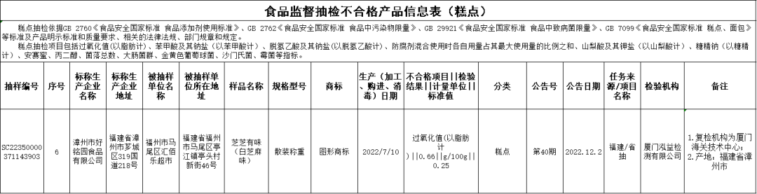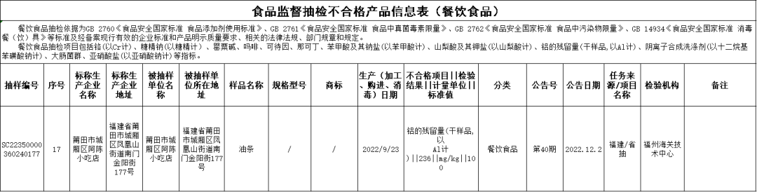 俗話說(shuō) 人是鐵,飯是鋼 一頓不吃餓得慌 守護(hù)老百姓“舌尖上的安全” 我們一直在路上 最新一期食品抽檢結(jié)果 新!鮮!出!爐! 快來(lái)看看 第40期公告的監(jiān)督抽檢信息涉及22大類食品1566批次,包括:糧食加工品、食用油(含油脂及其制品)、調(diào)味品、肉制品、乳制品、飲料、方便食品、餅干、冷凍飲品、速凍食品、薯類和膨化食品、糖果制品、茶葉及相關(guān)制品、酒類、水果制品、炒貨食品及堅(jiān)果制品、水產(chǎn)制品、糕點(diǎn)、豆制品、保健食品、餐飲食品(含餐飲具)、食用農(nóng)產(chǎn)品。合格1514批次,不合格52批次。涉及食品添加劑問題、微生物污染問題、重金屬污染問題、農(nóng)獸藥殘留問題、質(zhì)量指標(biāo)問題、其他污染問題。 食品添加劑問題 漳平市阿川小吃店的油條(加工日期為2022年10月5日),鋁的殘留量(干樣品,以Al計(jì))不合格,檢驗(yàn)機(jī)構(gòu)為福州海關(guān)技術(shù)中心; 晉江市青陽(yáng)晉仙小吃店的油條(加工日期為2022年10月5日),鋁的殘留量(干樣品,以Al計(jì))不合格,檢驗(yàn)機(jī)構(gòu)為廈門海關(guān)技術(shù)中心; 廈門市同安區(qū)清渝小吃店的油條(加工日期為2022年9月27日),鋁的殘留量(干樣品,以Al計(jì))不合格,檢驗(yàn)機(jī)構(gòu)為福建省產(chǎn)品質(zhì)量檢驗(yàn)研究院; 莆田市城廂區(qū)阿陳小吃店的油條(加工日期為2022年9月23日),鋁的殘留量(干樣品,以Al計(jì))不合格,檢驗(yàn)機(jī)構(gòu)為福州海關(guān)技術(shù)中心; 福建宇之潤(rùn)食品有限公司2022年7月5日生產(chǎn)的紫薯燒小面包(紫薯味),苯甲酸及其鈉鹽(以苯甲酸計(jì))不合格,銷售單位為廈門市同安區(qū)誼品陽(yáng)光便利店,初檢機(jī)構(gòu)為福州海關(guān)技術(shù)中心,復(fù)檢機(jī)構(gòu)為廈門市產(chǎn)品質(zhì)量監(jiān)督檢驗(yàn)院; 漳州市旺豐香食品有限公司2022年9月3日生產(chǎn)的水果小卷蛋糕,脫氫乙酸及其鈉鹽(以脫氫乙酸計(jì))不合格、防腐劑混合使用時(shí)各自用量占其最大使用量的比例之和不合格,銷售單位為福州市晉安區(qū)興福興超市有限公司,檢驗(yàn)機(jī)構(gòu)為福建賽福食品檢測(cè)研究所有限公司; 龍海市正豐食品有限公司2022年9月7日生產(chǎn)的鳳凰蛋酥(原味),丙二醇不合格,銷售單位為泰寧縣秀娟便利店,檢驗(yàn)機(jī)構(gòu)為福州海關(guān)技術(shù)中心。 微生物污染問題 莆田市涵江區(qū)京味餐館的白色花紋碗(消毒日期為2022年9月26日),大腸菌群不合格,檢驗(yàn)機(jī)構(gòu)為福建省產(chǎn)品質(zhì)量檢驗(yàn)研究院; 福清市音西歡喜餐飲店的圓盤(消毒日期為2022年9月28日),大腸菌群不合格,檢驗(yàn)機(jī)構(gòu)為福建省產(chǎn)品質(zhì)量檢驗(yàn)研究院; 福清市音西歡喜餐飲店的三角盤(消毒日期為2022年9月28日),大腸菌群不合格,檢驗(yàn)機(jī)構(gòu)為福建省產(chǎn)品質(zhì)量檢驗(yàn)研究院; 廈門麥初食品有限公司2022年9月10日生產(chǎn)的麻棗(糕點(diǎn)),霉菌不合格,銷售單位為廈門市湖里區(qū)秋良泓干貨商行,檢驗(yàn)機(jī)構(gòu)為福州海關(guān)技術(shù)中心; 晉江市百泉食品飲料有限公司2022年8月31日生產(chǎn)的思必特果味型碳酸飲料(檸檬味),菌落總數(shù)不合格,銷售單位為安溪縣鳳城聯(lián)財(cái)副食品店,檢驗(yàn)機(jī)構(gòu)為廈門海關(guān)技術(shù)中心。 重金屬污染問題 永輝超市有限公司漳州萬(wàn)科里店銷售的田趣官塢小海帶結(jié)(購(gòu)進(jìn)日期為2022年8月19日),鉛(以Pb計(jì))不合格,初檢機(jī)構(gòu)為福建省產(chǎn)品質(zhì)量檢驗(yàn)研究院,復(fù)檢機(jī)構(gòu)為福州海關(guān)技術(shù)中心。 福建宏華央廚餐飲服務(wù)有限公司銷售的生姜(購(gòu)進(jìn)日期為2022年9月6日),鉛(以Pb計(jì))不合格,初檢機(jī)構(gòu)為福建省產(chǎn)品質(zhì)量檢驗(yàn)研究院,復(fù)檢機(jī)構(gòu)為廈門市產(chǎn)品質(zhì)量監(jiān)督檢驗(yàn)院; 泉州市如佳營(yíng)養(yǎng)餐配送有限公司銷售的生姜(購(gòu)進(jìn)日期為2022年9月15日),鉛(以Pb計(jì))不合格,檢驗(yàn)機(jī)構(gòu)為福建省產(chǎn)品質(zhì)量檢驗(yàn)研究院; 永輝超市股份有限公司福建福州公園道超市銷售的公正蟹(活)(購(gòu)進(jìn)日期為2022年8月31日),鎘(以Cd計(jì))不合格,初檢機(jī)構(gòu)為南京海關(guān)動(dòng)植物與食品檢測(cè)中心,復(fù)檢機(jī)構(gòu)為福建省產(chǎn)品質(zhì)量檢驗(yàn)研究院; 晉江市池店鎮(zhèn)松東蔬菜行銷售的老姜(購(gòu)進(jìn)日期為2022年9月26日),鉛(以Pb計(jì))不合格,檢驗(yàn)機(jī)構(gòu)為福州海關(guān)技術(shù)中心; 廈門夏商百貨集團(tuán)南平有限公司建甌時(shí)代店銷售的茄子(購(gòu)進(jìn)日期為2022年10月1日),鎘(以Cd計(jì))不合格,檢驗(yàn)機(jī)構(gòu)為廈門泓益檢測(cè)有限公司; 福建省建甌市福瑞生鮮超市有限公司銷售的青絲茄(購(gòu)進(jìn)日期為2022年9月30日),鎘(以Cd計(jì))不合格,檢驗(yàn)機(jī)構(gòu)為廈門泓益檢測(cè)有限公司; 晉江潤(rùn)德商業(yè)有限公司銷售的老姜(購(gòu)進(jìn)日期為2022年9月18日),鉛(以Pb計(jì))不合格,檢驗(yàn)機(jī)構(gòu)為福州海關(guān)技術(shù)中心。 農(nóng)獸藥殘留問題 古田縣商業(yè)大世界農(nóng)貿(mào)市場(chǎng)魏錫旺銷售的長(zhǎng)豆(購(gòu)進(j