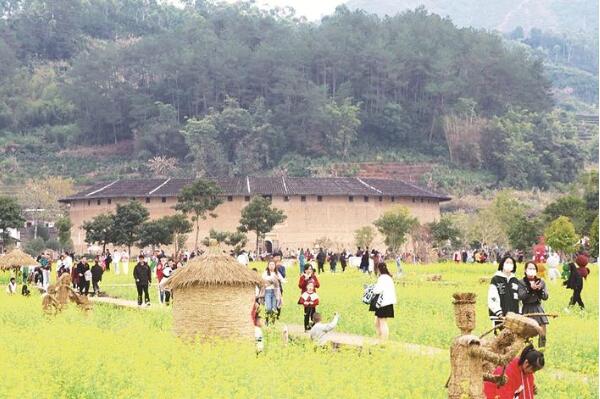 土樓與油菜花海相得益彰 油菜花 滿(mǎn)目金黃春意濃 春節(jié)假期,不少人的朋友圈被華安大地土樓群景區(qū)的油菜花海刷屏。在藍(lán)天白云的陪襯下,遠(yuǎn)處連綿的青山、近處古老的土樓群和這片金黃花海構(gòu)成了一幅醉人的鄉(xiāng)村畫(huà)卷。 油菜花海里游人如織,四處可見(jiàn)拍照留影的人,想留住眼前的春色。年輕人們舉起自拍桿,在花叢中定格自己的笑顏。孩子們也找到了樂(lè)趣,嬉笑著追逐飛舞的蝴蝶,往花叢深處去。周邊鋪設(shè)了小火車(chē)軌道,家長(zhǎng)帶著孩子坐上小火車(chē),不到10分鐘即可將這60畝金色花海的美景賞個(gè)遍。為了更好地留住客人,景區(qū)還在花海中布置了稻草造景,有巨型稻草人、恐龍、大猩猩等卡通造型,吸引不少孩子來(lái)“打卡”。 賞過(guò)油菜花海,再去逛逛土樓群,行程更充實(shí)。華安大地土樓群由“土樓之王”二宜樓、“福建土樓博物館”南陽(yáng)樓、“宜居典范”東陽(yáng)樓組成,是福建土樓建筑的代表。景區(qū)工作人員透露,多數(shù)游客將逛土樓、賞花打包一起玩。春節(jié)期間,景區(qū)的客流量達(dá)到2.5萬(wàn)人次,目前日均客流量在1000人左右,熱度不減。 景區(qū)還推出了優(yōu)惠政策,2月28日前購(gòu)買(mǎi)土樓(華安)景區(qū)門(mén)票(全價(jià)票70元),可贈(zèng)送秋千谷景區(qū)入園門(mén)票或者土樓觀光車(chē)車(chē)票+油菜花海小火車(chē)票。