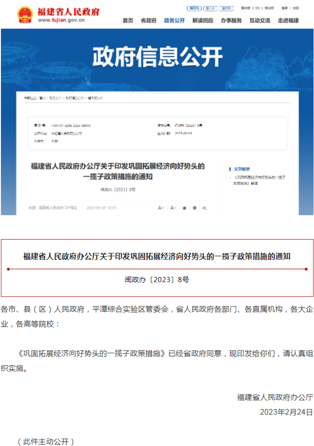 安排貼息資金1億元,支持中小微企業(yè)創(chuàng)新轉(zhuǎn)型、開拓市場、提質(zhì)增效……今天,福建省人民政府網(wǎng)站公布了《福建省人民政府辦公廳關(guān)于印發(fā)鞏固拓展經(jīng)濟(jì)向好勢頭的一攬子政策措施的通知》。 鞏固拓展經(jīng)濟(jì)向好勢頭的一攬子政策措施 為全面貫徹落實(shí)黨的二十大和中央經(jīng)濟(jì)工作會議精神,落實(shí)省委十一屆三次全會和省“兩會”部署,深入實(shí)施“深學(xué)爭優(yōu)、敢為爭先、實(shí)干爭效”行動,進(jìn)一步強(qiáng)信心、鼓干勁,激勵市場主體增產(chǎn)增效,鞏固拓展經(jīng)濟(jì)向好勢頭,努力推動一季度開門紅、二季度增長穩(wěn)、三季度勢頭強(qiáng)、四季度成效好,制定以下措施。 一、繼續(xù)加大財(cái)稅支持力度 1.全面落實(shí)增值稅小規(guī)模納稅人減免增值稅等政策,自2023年1月1日至2023年12月31日,對月銷售額10萬元以下(含本數(shù))的增值稅小規(guī)模納稅人,免征增值稅;增值稅小規(guī)模納稅人適用3%征收率的應(yīng)稅銷售收入,減按1%征收率征收增值稅;適用3%預(yù)征率的預(yù)繳增值稅項(xiàng)目,減按1%預(yù)征率預(yù)繳增值稅;允許生產(chǎn)性服務(wù)業(yè)納稅人按照當(dāng)期可抵扣進(jìn)項(xiàng)稅額加計(jì)5%抵減應(yīng)納稅額;允許生活性服務(wù)業(yè)納稅人按照當(dāng)期可抵扣進(jìn)項(xiàng)稅額加計(jì)10%抵減應(yīng)納稅額?!藏?zé)任單位:省稅務(wù)局、廈門市稅務(wù)局,各市、縣(區(qū))人民政府,平潭綜合實(shí)驗(yàn)區(qū)管委會,以下均需各市、縣(區(qū))人民政府,平潭綜合實(shí)驗(yàn)區(qū)管委會落實(shí),不再列出〕 2.落實(shí)增值稅留抵退稅政策,按規(guī)定對符合條件的企業(yè)繼續(xù)落實(shí)好增值稅留抵退稅政策,在納稅人自愿申請的基礎(chǔ)上,確保應(yīng)退盡退、及時退付。(責(zé)任單位:省稅務(wù)局、廈門市稅務(wù)局,省財(cái)政廳,人行福州中心支行) 二、強(qiáng)化金融服務(wù)實(shí)體經(jīng)濟(jì) 3.引導(dǎo)延期還本付息等政策平穩(wěn)接續(xù)過渡。推動進(jìn)一步擴(kuò)大“無還本續(xù)貸”產(chǎn)品覆蓋面,緩釋市場主體疫情恢復(fù)期償債壓力。繼續(xù)加大“隨借隨還”類金融產(chǎn)品創(chuàng)新和推廣力度,支持市場主體降低融資成本。(責(zé)任單位:人行福州中心支行、福建銀保監(jiān)局、廈門銀保監(jiān)局,省金融監(jiān)管局) 4.設(shè)立福建省中小微企業(yè)“爭優(yōu)爭先爭效”專項(xiàng)資金貸款,第一期規(guī)模100億元,省財(cái)政安排貼息資金1億元,支持中小微企業(yè)創(chuàng)新轉(zhuǎn)型、開拓市場、提質(zhì)增效等。積極支持小微企業(yè)、個體工商戶以及“三農(nóng)”主體1000萬元以下的融資擔(dān)保業(yè)務(wù),在可持續(xù)經(jīng)營前提下,合理降低擔(dān)保費(fèi)率。各地政府性融資擔(dān)保機(jī)構(gòu)主管部門要推動政府性融資擔(dān)保機(jī)構(gòu)合理提高擔(dān)保放大倍數(shù),減少重復(fù)盡職調(diào)查,擴(kuò)大對小微企業(yè)的覆蓋面。(責(zé)任單位:省財(cái)政廳、金融監(jiān)管局) 5.新發(fā)行小微企業(yè)增信集合債券,對募集資金由托管商業(yè)銀行轉(zhuǎn)貸給中小微企業(yè)的,省發(fā)改委按當(dāng)年實(shí)際完成的轉(zhuǎn)貸規(guī)模一次性給予發(fā)行人0.5%貼息。(責(zé)任單位:省發(fā)改委) 6.推動金融機(jī)構(gòu)加大對房地產(chǎn)項(xiàng)目(特別是收尾項(xiàng)目)金融扶持力度,緩解企業(yè)資金短缺。區(qū)分房地產(chǎn)集團(tuán)公司風(fēng)險和項(xiàng)目公司風(fēng)險,加大對正常建設(shè)房地產(chǎn)項(xiàng)目的開發(fā)貸款、按揭貸款等合理融資需求的支持力度,確保房地產(chǎn)項(xiàng)目建設(shè)交付。(責(zé)任單位:省金融監(jiān)管局、住建廳,人行福州中心支行、福建銀保監(jiān)局、廈門銀保監(jiān)局) 7.擴(kuò)大“鄉(xiāng)村振興貸”、信貸直通車服務(wù)等農(nóng)業(yè)農(nóng)村金融產(chǎn)品,以及“商貿(mào)貸”“外貿(mào)貸”“臺企快服貸”等商務(wù)領(lǐng)域金融產(chǎn)品普惠覆蓋面。(責(zé)任單位:省農(nóng)業(yè)農(nóng)村廳、商務(wù)廳、財(cái)政廳) 8.繼續(xù)做好中小企業(yè)融資支持,落實(shí)好普惠小微貸款支持工具資金支持比例提高的政策,按相關(guān)地方法人銀行普惠小微貸款余額增量的2%提供資金支持。充分用好普惠性再貸款再貼現(xiàn)政策工具,持續(xù)引導(dǎo)金融機(jī)構(gòu)加大對涉農(nóng)、小微和民營企業(yè)的信貸支持。加強(qiáng)跨部門“幾家抬”,激勵引導(dǎo)金融機(jī)構(gòu)實(shí)施差異化信貸支持政策,加大首貸、信用貸支持力度,推動民營和中小微企業(yè)融資增量、擴(kuò)面、降價。(責(zé)任單位:人行福州中心支行,省金融監(jiān)管局,福建銀保監(jiān)局、廈門銀保監(jiān)局) 9.對2022年第四季度到期、因新冠疫情影響暫時遇困的小微企業(yè)貸款(含個體工商戶和小微企業(yè)主經(jīng)營性貸款),鼓勵銀行業(yè)金融機(jī)構(gòu)與借款人按市場化原則共同協(xié)商延期還本付息,延期貸款正常計(jì)息,免收罰息,還本付息日期原則上最長可延至2023年6月30日。(責(zé)任單位:人行福州中心支行、福建銀保監(jiān)局、廈門銀保監(jiān)局,省