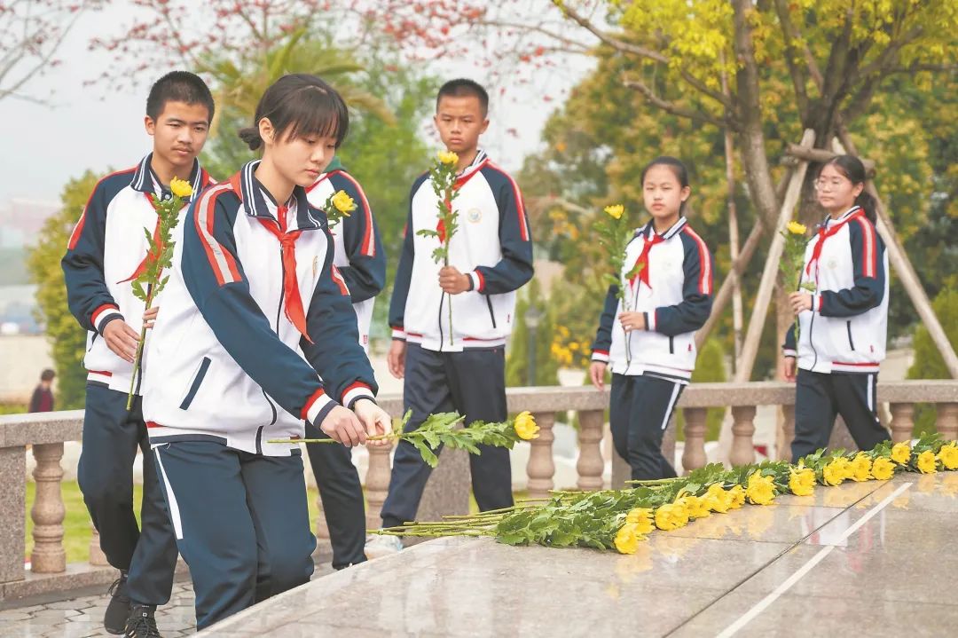 又是清明祭掃時(shí),緬懷英烈寄哀思。 今年清明,全省干部群眾、軍人師生線上線下同步展開(kāi)、創(chuàng)新創(chuàng)意靈活祭掃。截至4月3日,全省各界通過(guò)“2023清明祭英烈”網(wǎng)絡(luò)祭奠活動(dòng),參與網(wǎng)上祭掃3167萬(wàn)余人次。不論是現(xiàn)場(chǎng)祭掃還是網(wǎng)上“云祭掃”,不一樣的祭掃方式,一樣的寄托哀思、緬懷深情。 4月2日上午,漳州市華僑中學(xué)師生到市烈士陵園祭奠。楊紀(jì)翔 攝 百園千校祭英烈 3月27日,福建省軍地領(lǐng)導(dǎo)與福州市機(jī)關(guān)單位工作人員、退役軍人及師生代表等200余人,來(lái)到福州市文林山革命烈士陵園,舉行“百園千校清明祭英烈”活動(dòng)啟動(dòng)儀式。9時(shí)30分,全體人員整齊列隊(duì),莊嚴(yán)肅立,鞠躬默哀。隨著《獻(xiàn)花曲》奏響,大家手持鮮花拾階緩行,依次將鮮花擺在革命烈士紀(jì)念碑前寄托哀思。隨后,在烈士陵園講解員的引導(dǎo)下,師生代表來(lái)到烈士墓區(qū)開(kāi)展“傾聽(tīng)一段紅色故事”“書寫一張寄語(yǔ)卡片”等活動(dòng),表達(dá)對(duì)英烈的崇敬之情。 據(jù)了解,全省現(xiàn)有烈士紀(jì)念設(shè)施14923個(gè),其中國(guó)家級(jí)8個(gè)、省級(jí)7個(gè)、市級(jí)15個(gè)、縣級(jí)132個(gè),碑亭塔祠等紀(jì)念設(shè)施559個(gè),烈士墓14202個(gè)?!鞍亚行W(xué)校師生組織起來(lái)開(kāi)展系列緬懷英烈活動(dòng),旨在引導(dǎo)廣大青少年在回望歷史中傳承紅色基因,銘記歷史使命,厚植家國(guó)情懷?!笔⊥艘圮娙耸聞?wù)廳優(yōu)撫褒揚(yáng)處處長(zhǎng)潘永意表示,3月27日至4月10日,省退役軍人事務(wù)廳計(jì)劃組織全省千所中小學(xué)在校師生,到烈士陵園開(kāi)展“擦拭一遍墓碑、敬獻(xiàn)一束鮮花、進(jìn)行一次描金描紅、重溫入團(tuán)(入隊(duì))誓詞、寫一張寄語(yǔ)卡片、講述先烈故事”等活動(dòng),并同步開(kāi)展主題班隊(duì)會(huì)、團(tuán)(隊(duì))日活動(dòng)等。 3月28日,寧德市屏南縣革命烈士陵園迎來(lái)屏南縣古峰鎮(zhèn)第二小學(xué)的學(xué)生。他們帶來(lái)橘子、鮮花和卡片,放在衛(wèi)國(guó)戍邊烈士陳祥榕遺像前。一張張卡片上寫滿對(duì)烈士的思念,“祥榕哥哥,吃口橘子吧,甜甜的”“去時(shí)少年身,歸來(lái)烈士魂”“陳祥榕哥哥,您是我心中的英雄,是我學(xué)習(xí)的榜樣”…… 3月28日,泰寧縣在爐峰山革命烈士紀(jì)念園開(kāi)展清明祭英烈活動(dòng),全體人員莊嚴(yán)肅立,鞠躬默哀,學(xué)生代表向革命烈士紀(jì)念碑敬獻(xiàn)花籃、寄語(yǔ)卡片,少先隊(duì)員獻(xiàn)唱《我們是共產(chǎn)主義接班人》,深切緬懷革命烈士。隨后,大家走進(jìn)紅軍亭和英勇東方軍展館,聆聽(tīng)英雄戰(zhàn)斗的故事,感悟熱血戰(zhàn)史,接受愛(ài)國(guó)主義教育。 3月28日,明溪縣師生代表、退役軍人代表、機(jī)關(guān)單位干部等120多人來(lái)到明溪縣革命紀(jì)念園,大家懷著崇敬的心情,打掃紀(jì)念廣場(chǎng)、烈士集中安葬區(qū),擦拭烈士墓碑、烈士英名墻等紀(jì)念設(shè)施。隨后,全體人員整齊列隊(duì),莊嚴(yán)肅立,鞠躬默哀,并瞻仰烈士墓、烈士英名墻和革命英雄紀(jì)念碑,依次將鮮花擺在紀(jì)念設(shè)施前寄托哀思。 4月2日,在龍巖市永定區(qū),老戰(zhàn)士熊兆祥與部隊(duì)官兵、少年軍校學(xué)生共同為烈士墓碑描紅。范啟椿 攝 朗誦詩(shī)文敬英雄 清明祭英烈,詩(shī)文寄哀思。 4月1日,崇尚·2023清明祭英烈——“回響”紅色經(jīng)典誦讀活動(dòng)在福州市文林山革命英烈紀(jì)念園舉行,來(lái)自福州市20多所院校的1000多名師生及社會(huì)志愿服務(wù)團(tuán)隊(duì)成員參加。手持白花的參與者整齊列隊(duì),表情莊嚴(yán)肅穆。 “當(dāng)亦樂(lè)犧牲吾身與汝身之福利,為天下人謀永福也!”“就讓你們的槍聲,成為我們婚禮的禮炮吧!”“憑將一掬丹心在,泉下嗟堪對(duì)我翁?!备V荽髮W(xué)至誠(chéng)學(xué)院人文藝術(shù)系的學(xué)生身著表演服,在紀(jì)念碑前的臺(tái)階上朗誦了林覺(jué)民《與妻書》片段、徐琛和余哲貞烈士犧牲前留言以及吳石將軍的絕命詩(shī)等先烈經(jīng)典名言和詩(shī)句。1000多名參與者跟誦,鏗鏘有力、飽含深情的話語(yǔ)聲回蕩在文林山的松林間。 “會(huì)稽恥,終須雪。楚三戶,教秦滅。愿英靈,永保金甌無(wú)缺……”領(lǐng)誦人中,一名身著軍裝、白發(fā)蒼蒼的老人格外引人注目。他是福州市退役軍人事務(wù)局上海西軍休所軍休干部姜膠生?!拔依收b的是郁達(dá)夫1937年9月在福州創(chuàng)作的《滿江紅》,是紀(jì)念民族英雄戚繼光的。朗誦這首有著特別意義的作品,不但是為了紀(jì)念民族英雄戚繼光,也是為了傳承不甘屈辱、同仇敵愾的精神,這能更好激發(fā)同學(xué)們的愛(ài)國(guó)熱情?!?/p> “當(dāng)我朗誦吳石將軍的絕命詩(shī)時(shí),我一下子覺(jué)得,和革命先烈當(dāng)年的艱難處境相比,如今生活中的一些困難都不值一提。先烈的犧牲不但為我們創(chuàng)造了更好的生活,也給我們留下了寶貴的精神遺產(chǎn)?!爆F(xiàn)場(chǎng)領(lǐng)誦的福州大學(xué)至誠(chéng)學(xué)院人文藝術(shù)系學(xué)生雷博軒說(shuō)。 3月31日,南平市建陽(yáng)區(qū)童游中心小學(xué)開(kāi)展“賡續(xù)紅色血