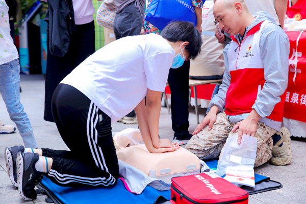 紅十字會(huì)還為居民宣傳普及防溺水知識(shí)、心肺復(fù)蘇現(xiàn)場(chǎng)教學(xué);星光救援隊(duì)為居民講解家庭防火自救知識(shí)、科普繩索救援知識(shí)、展示救援設(shè)備;海容社工開展“有備無患”游園互動(dòng)游戲,進(jìn)一步提高居民家庭的自我救援能力。