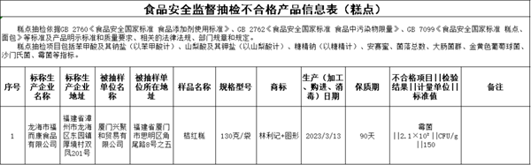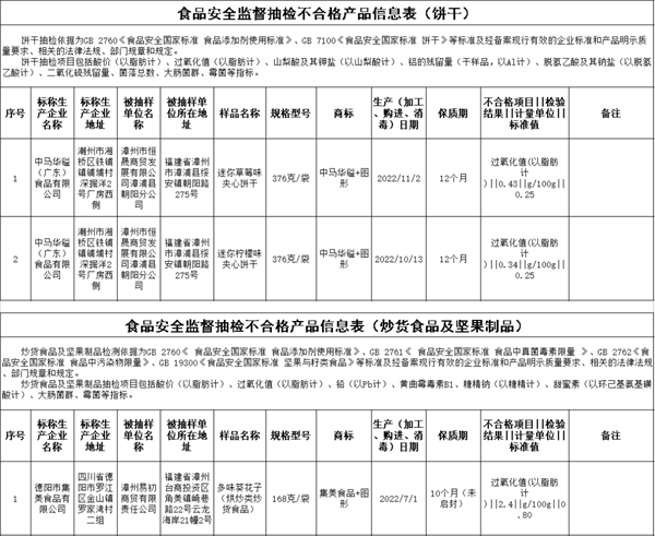 最新一期食品抽檢結(jié)果新鮮出爐!快來看看。 第20期通告的監(jiān)督抽檢信息涉及27大類食品883批次,包括:糧食加工品、食用油(含油脂及其制品)、調(diào)味品、肉制品、乳制品、飲料、方便食品、餅干、罐頭、薯類和膨化食品、糖果制品、茶葉及相關(guān)制品、酒類、蔬菜制品、水果制品、炒貨食品及堅(jiān)果制品、蛋制品、食糖、水產(chǎn)制品、淀粉及淀粉制品、糕點(diǎn)、豆制品、蜂產(chǎn)品、特殊膳食食品、餐飲食品、食品添加劑、食用農(nóng)產(chǎn)品。合格876批次,不合格7批次。不合格項(xiàng)目涉及質(zhì)量指標(biāo)問題、微生物污染問題、農(nóng)獸藥殘留問題。 質(zhì)量指標(biāo)問題 標(biāo)稱中馬華鎰(廣東)食品有限公司2022年11月2日生產(chǎn)的迷你草莓味夾心餅干,過氧化值(以脂肪計)不符合食品安全國家標(biāo)準(zhǔn)規(guī)定,銷售單位為漳州市恒晟商貿(mào)發(fā)展有限公司漳浦縣朝陽分公司。中馬華鎰(廣東)食品有限公司對檢驗(yàn)結(jié)果提出異議,并申請復(fù)檢;經(jīng)復(fù)檢后,維持初檢結(jié)論; 標(biāo)稱中馬華鎰(廣東)食品有限公司2022年10月13日生產(chǎn)的迷你檸檬味夾心餅干,過氧化值(以脂肪計)不符合食品安全國家標(biāo)準(zhǔn)規(guī)定,銷售單位為漳州市恒晟商貿(mào)發(fā)展有限公司漳浦縣朝陽分公司。中馬華鎰(廣東)食品有限公司對檢驗(yàn)結(jié)果提出異議,并申請復(fù)檢;經(jīng)復(fù)檢后,維持初檢結(jié)論; 標(biāo)稱德陽市集美食品有限公司2022年7月1日生產(chǎn)的多味葵花子(烘炒類炒貨食品),過氧化值(以脂肪計)不符合食品安全國家標(biāo)準(zhǔn)規(guī)定,銷售單位為漳州易初商貿(mào)有限責(zé)任公司; 標(biāo)稱沈陽市潤香坊酒廠2022年9月12日生產(chǎn)的北京風(fēng)味二鍋頭,酒精度含量不符合產(chǎn)品標(biāo)簽標(biāo)示要求,銷售單位為福建年年旺超市有限公司。 微生物污染問題 標(biāo)稱龍海市福而康食品有限公司2023年3月13日生產(chǎn)的桔紅糕,霉菌不符合食品安全國家標(biāo)準(zhǔn)規(guī)定,銷售單位為廈門興聚和貿(mào)易有限公司。 農(nóng)獸藥殘留問題 永定區(qū)張勝解冰凍蔬菜店銷售的水芹(購進(jìn)日期為2023年3月26日),毒死蜱不符合食品安全國家標(biāo)準(zhǔn)規(guī)定; 深圳沃爾瑪百貨零售有限公司晉江SM分店銷售的牛蛙(購進(jìn)日期為2023年3月30日),恩諾沙星不符合食品安全國家標(biāo)準(zhǔn)規(guī)定。 整改措施 針對抽檢不合格產(chǎn)品,福建省市場監(jiān)督管理局已要求所在地市場監(jiān)管部門對不合格產(chǎn)品生產(chǎn)經(jīng)營者開展調(diào)查處置,依法查處違法違規(guī)行為,督促生產(chǎn)經(jīng)營者履行停止銷售、下架、召回和公告等法定義務(wù),有效防控食品安全風(fēng)險。 掃碼查看合格產(chǎn)品信息表 |