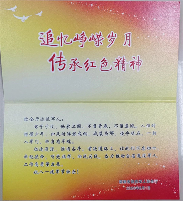 8月1日上午,圍繞“學習貫徹黨的創(chuàng)新理論、推動退役軍人工作高質量發(fā)展”主題,省退役軍人事務廳召開慶祝建軍96周年座談會。廳黨組書記、廳長羅慶春出席座談會并講話。廳黨組成員、副廳長陳建輝、陳浩作交流發(fā)言,廳二級巡視員陳勇主持座談會,廳機關和在榕所屬單位退役軍人參加座談。 羅慶春代表廳黨組向全省退役軍人和退役軍人工作者致以節(jié)日問候,衷心感謝大家退役不褪色、離軍不離黨,為我省退役軍人工作作出的積極貢獻。他勉勵大家要深入學習貫徹習近平強軍思想,跟進學習領會習近平總書記關于國防和軍隊建設一系列重要講話精神,始終在思想上政治上行動上同以習近平同志為核心的黨中央保持高度一致,以實際行動堅定擁護“兩個確立”、堅決做到“兩個維護”。要始終銘記聽黨話、感黨恩、跟黨走,永葆軍人本色,切實增強政治能力、思維能力、實踐能力,敢抓敢管、迎難而上、善作善成,奮力推動全省退役軍人工作高質量發(fā)展。 座談會上,廳黨組向全廳退役軍人贈送賀卡和《習近平著作選讀》等理論書籍,集體合唱《中國人民解放軍軍歌》《沒有共產黨就沒有新中國》。梁晨磊、萬小強、王江文、羅勛章、林玉琴、曾峻茂等6名同志作交流發(fā)言,大家回顧激情豪邁的軍旅生涯,暢談從事新時代退役軍人工作的心得體會,一致表示深刻感受到廳黨組的關心關懷和退役軍人事務部門這個大家庭的溫暖,將始終保持軍人本色,對黨忠誠、牢記使命、服務人民,始終保持軍人品格,甘于奉獻、主動擔當、勇于拼搏,始終保持軍人的紀律作風,服從命令、聽從指揮,雷厲風行,以退役軍人工作高質量發(fā)展的實際行動,讓全省退役軍人更加滿意,讓駐閩部隊更加滿意,讓黨委政府更加放心,為譜寫中國式現代化福建篇章作出更大貢獻。 |