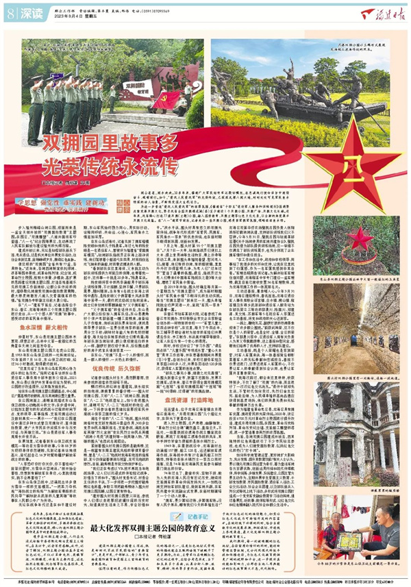 核心提示 閩山蒼蒼,閩水泱泱。30多年來,福建廣大軍民始終牢記殷切囑托,在忠誠踐行使命宗旨中接續(xù)奮斗、砥礪前行。如今,“愛我人民愛我軍”的光榮傳統(tǒng),已深深扎根八閩大地,時時處處可見軍民魚水情深的動人場景,不斷煥發(fā)強大生機活力。 為進一步營造“愛我人民愛我軍”的濃厚氛圍,《福建省“十四五”退役軍人服務(wù)和保障規(guī)劃》強調(diào)要注重發(fā)展雙擁文化,要求我省全國雙擁模范城(縣)至少建設(shè)1個雙擁公園、雙擁廣場、雙擁文化長廊。近年來,我省精心打造77座雙擁(主題)公園,融入國防教育、雙擁主題等紅色文化元素,以全新的角度展示雙擁文化底蘊。在“八一”建軍節(jié)前后,走訪一些雙擁公園,感受崇軍擁軍氛圍,領(lǐng)略濃濃魚水情。 “八一”前夕,駐福州武警某部官兵走進福州“雙擁國防教育”主題園,接受“愛我人民愛我軍”的光榮傳統(tǒng)教育。 步入福州梅峰山地公園,迎面而來是一座全天候開放的“雙擁國防教育”主題園。在園區(qū),“雙擁雕塑”、八閩開國將軍印鑒墻、“八一七”紀(jì)念園等展區(qū),生動再現(xiàn)了人民軍隊解放與建設(shè)福州的光輝歷程。 建成開放以來,無論是駐榕部隊新兵下連、老兵退伍,還是機關(guān)單位開展黨日活動,往往會來到這里,回顧崢嶸歲月,賡續(xù)紅色血脈。 像這樣的“雙擁園”全省共有77座,各具特色?!敖陙?,各地因地制宜依托綠地、涼亭等園林景觀,或革命陳列館、紀(jì)念館,或革命烈士陵園,按照大體量、多模塊、高擴展的思路建設(shè)雙擁主題公園,打造百姓喜聞樂見的雙擁工作新地標(biāo),讓群眾在休閑的同時,潛移默化地接受雙擁和國防教育熏陶,最大限度地激發(fā)八閩兒女愛國強軍的熱情?!笔‰p擁辦專職副主任熊大勇介紹。 在“八一”建軍節(jié)前后,來到東山、晉江、龍海等地的三個雙擁主題公園進行走訪,從一個個感人的“雙擁”故事中,感受濃濃的軍民魚水情深。 魚水深情 薪火相傳 仲夏時節(jié),東山縣雙擁主題公園林木蔥蘢、綠意正濃,叢林中火苗一般簇紅的五角星在天地之間愈發(fā)奪目。 東山縣雙擁主題公園叢林中火苗一般簇紅的五角星 東山縣雙擁主題公園又名虎山公園,是1953年東山島保衛(wèi)戰(zhàn)的一處陣地舊址。70年前的7月16日,東山保衛(wèi)戰(zhàn)打響,經(jīng)過36小時激戰(zhàn),取得最終勝利。 “這里見證了當(dāng)年東山島軍民同心協(xié)力戰(zhàn)斗的紅色歷史?!睎|山縣退役軍人事務(wù)局干部朱勝東介紹說。2021年,東山縣以保護開發(fā)革命舊址為契機,對公園進行改造提升,讓其煥發(fā)新生機。 站在東山縣雙擁主題公園最高點,中心城區(qū)廣廈高樓盡收眼底,足見其地理位置之重要。 在公園地面上,清晰呈現(xiàn)描述東山島保衛(wèi)戰(zhàn)驚心動魄戰(zhàn)斗的文字;在步道中間,以銘刻主題句的形式把戰(zhàn)斗過程的時間節(jié)點、黨的領(lǐng)導(dǎo)、軍事指揮、支前雙擁運動以及勝利果實一一展示……“我們在公園建設(shè)中通過多種方式普及雙擁知識、宣傳國防教育,使廣大市民在休閑娛樂中與歷史對話、與英雄交流?!睎|山縣退役軍人事務(wù)局局長許世齊說。 在展館里,記載著東山保衛(wèi)戰(zhàn)支前模范一等功臣方雪華的故事。今年88歲的方奶奶身體依然硬朗,高興地回憶起自己16歲時幫助藏護解放軍戰(zhàn)士的故事。 今年88歲的方雪華是東山保衛(wèi)戰(zhàn)支前模范一等功臣。 “人家恐嚇你打你關(guān)你,你不害怕嗎?”回答問題時,方雪華從容地說:“剛開始會害怕,但想到有解放軍在身邊,心里就很踏實,就不會再害怕了!” 在東山島保衛(wèi)戰(zhàn)中,還涌現(xiàn)出許多像方雪華一樣的支前模范?!耙话巡说秺Z機槍”“海防戰(zhàn)士的媽媽”“為解放軍帶路的農(nóng)民向?qū)А薄敖獬龜潮溲b的兒童英雄”等故事在人民群眾中廣為傳頌。 無論在戰(zhàn)爭年代還是在和平建設(shè)時期,東山軍民始終勠力同心,用實際行動,詮釋同呼吸、共命運、心連心,軍民魚水之情愈加深厚。 在東山島近海處,見到了擁軍楷模陳安順和他的兒子陳勇軍。年過七旬的陳安順是一名退伍軍人,曾被評為福建省“愛國擁軍模范”。駐地部隊指戰(zhàn)員正在海上游泳訓(xùn)練,他們駕駛著小船游弋在四周,時而擋住遠處飛馳來的漁船,時而靠近搏浪的人群。 “看到部隊在這里海訓(xùn),父親就主動為部隊訓(xùn)練提供力所能及的保障,也帶著我一起干,這件事一干就是20多年。”陳勇軍說。 陳安順將家中的兩條漁船用于部隊海上訓(xùn)練保障,不計報酬、堅持不懈,只要部隊需要,隨叫隨到。當(dāng)年有6名戰(zhàn)士在海上訓(xùn)練中遇險,是陳安順父子倆冒著大風(fēng)浪在霧海中苦尋一天,最終把這些戰(zhàn)士搶救回來。戰(zhàn)士們親切地稱那艘漁船為“父子擁軍船”。 “父子擁軍船”的佳話傳開后,東山縣廣大群眾紛紛加入擁軍隊伍。東山縣澳角村個體戶老郭新建一幢三層樓房,準(zhǔn)備給兒子作婚房,他聽說部隊要來駐訓(xùn),便找縣領(lǐng)導(dǎo)要求部隊一定要住進他家的新房,費用分文不收;銅缽村年逾八旬的老奶奶謝清香,每天給住在她家的戰(zhàn)士們煮雞蛋;每年部隊到當(dāng)?shù)伛v訓(xùn),群眾像迎接遠歸的親人一樣,敲鑼打鼓歡迎子弟兵,紛紛騰出最好的房子把官兵請到家里…