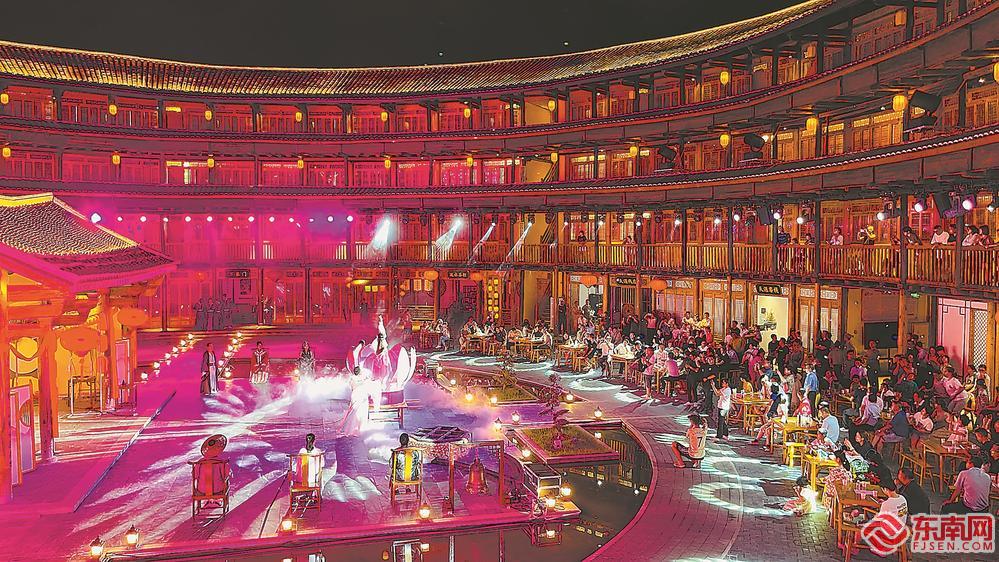 東南網(wǎng)8月13日訊(福建日?qǐng)?bào)通訊員 熊川 攝影報(bào)道)經(jīng)過(guò)一個(gè)多月的劇本打磨、排練及燈光舞臺(tái)效果的升級(jí),永定土樓《天涯共此樓》沉浸式演繹劇場(chǎng)3日起恢復(fù)常態(tài)化演出,連日來(lái)吸引大批游客。 據(jù)介紹,《天涯共此樓》沉浸式演藝劇場(chǎng)設(shè)在永定洪坑景區(qū)環(huán)興樓內(nèi),升級(jí)后演出時(shí)長(zhǎng)約為60分鐘。演出將夏日國(guó)風(fēng)與科技感十足的聲光電技術(shù)相融合,把一個(gè)充滿武俠氣息的宋代江湖世界呈現(xiàn)在游客面前。永定客家土樓藝術(shù)團(tuán)團(tuán)長(zhǎng)陳盛哲說(shuō),演出提檔升級(jí)不僅充實(shí)了劇情故事,還實(shí)現(xiàn)了漫天飛雪、漫天花瓣等特效,帶給游客身臨其境的體驗(yàn)。 |