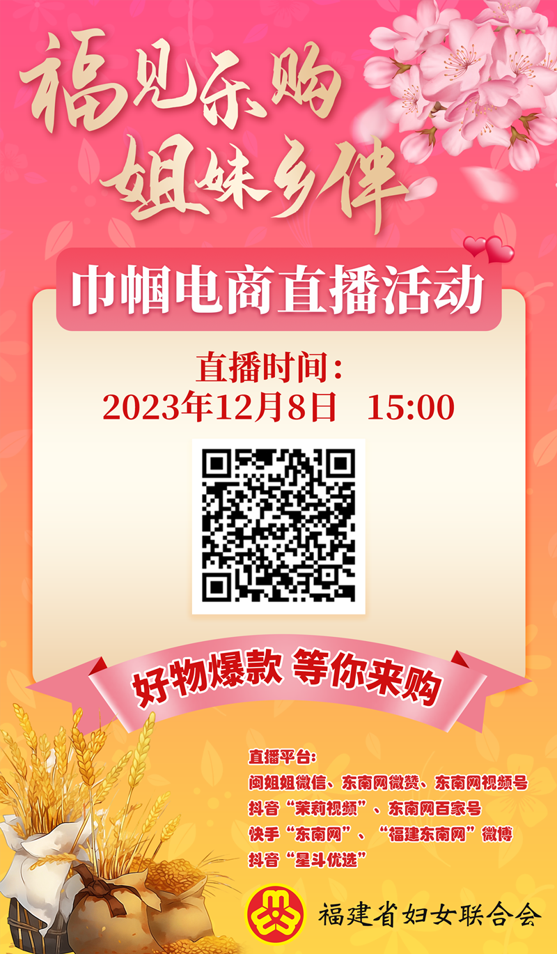 12月7日至8日,福建省巾幗電商直播活動(dòng)將走進(jìn)泉州南安、泉州鯉城。屆時(shí),90余件當(dāng)?shù)亍皨D”字號(hào)企業(yè)特色農(nóng)產(chǎn)品、美食小吃、巾幗電商代表好物及西部地區(qū)農(nóng)特產(chǎn)品將亮相直播間,帶您呷好味,尋好禮! 本次活動(dòng)由福建省婦女聯(lián)合會(huì)主辦,泉州市婦聯(lián)分別聯(lián)合南安市婦聯(lián)、南安市女企業(yè)家聯(lián)誼會(huì)暨擁軍協(xié)會(huì)和鯉城區(qū)婦聯(lián)、鯉城區(qū)女企業(yè)家聯(lián)誼會(huì)協(xié)辦。12月7日,東南網(wǎng)將攜手南安市北空間眾創(chuàng)業(yè)化器有限公司 (南安北部電商創(chuàng)業(yè)園)舉辦泉州首場巾幗電商直播活動(dòng),展示紅蔥酥、咸茶、麻糍等特色地方食品及當(dāng)?shù)亟韼脚蠛梦铮?2月8日,東南網(wǎng)還將攜手位于泉州鯉城的福建省星斗數(shù)字科技有限公司舉辦巾幗電商直播活動(dòng),帶來糕點(diǎn)禮盒、進(jìn)口商品等優(yōu)質(zhì)伴手禮。直播期間,兩地女企業(yè)家代表、巾幗新農(nóng)人、巾幗電商直播代表人物等將做客直播間,為大家傾情推薦當(dāng)?shù)卮砩唐?,讓您足不出戶,盡享繽紛好物。一大批好物將以優(yōu)惠折扣上架直播間,超值福利等你來搶!不容錯(cuò)過! 2023年“福見樂購 姐妹鄉(xiāng)伴”巾幗電商直播活動(dòng)于11月21日在福州連江啟動(dòng)?;顒?dòng)以“基地 直播 故事”的推廣模式,舉辦15場直播,覆蓋我省9個(gè)設(shè)區(qū)市和平潭綜合實(shí)驗(yàn)區(qū),圍繞巾幗優(yōu)品推廣,引入當(dāng)?shù)剜l(xiāng)村女主播,助力巾幗優(yōu)品帶貨,持續(xù)幫助寧夏、新疆、西藏、甘肅地區(qū)銷售巾幗好物,為鄉(xiāng)村振興賦能添翼。 啟動(dòng)儀式當(dāng)天,80余件巾幗好物亮相福建省婦聯(lián)巾幗電商直播 · 連江直播間,吸引82.27萬網(wǎng)友觀看并選購,同期還舉辦了線下展銷活動(dòng),受到當(dāng)?shù)厝罕姎g迎。 福見樂購,姐妹鄉(xiāng)伴。識(shí)別下方二維碼,快進(jìn)入直播間把巾幗好物帶回家吧!