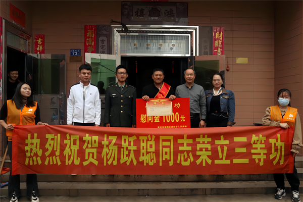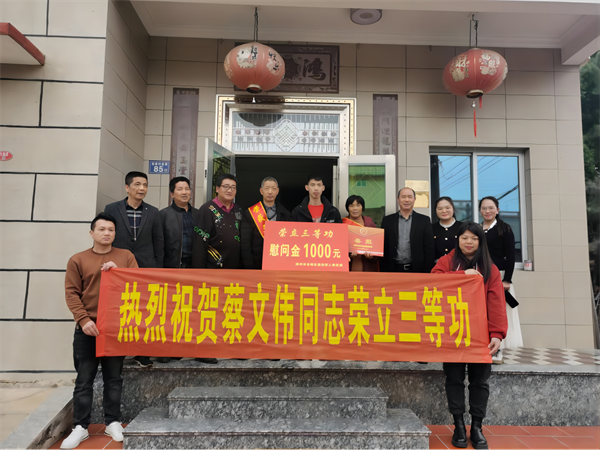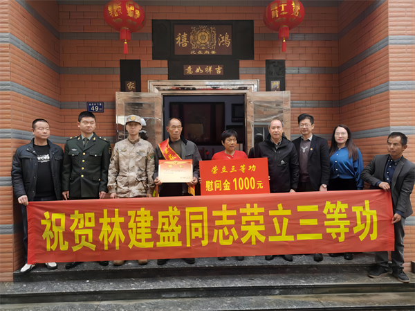 喜報(bào)頻傳桑梓地,榮耀常駐功臣門。1月30日-2月1日,龍海區(qū)退役軍人事務(wù)局與區(qū)人武部聯(lián)合開展“為立功軍人送喜報(bào)”活動(dòng)。先后為榮立三等功現(xiàn)役軍人海澄鎮(zhèn)鐘嶼旭、蔡文偉,紫泥鎮(zhèn)林建盛,隆教鄉(xiāng)楊躍聰家屬送上立功喜報(bào)及慰問金,并帶去春節(jié)的祝福和問候。 現(xiàn)役軍人鐘嶼旭獲獎(jiǎng)獎(jiǎng)?wù)?/p> 橫幅醒目、鑼鼓震天、鞭炮齊鳴,區(qū)鎮(zhèn)村退役軍人服務(wù)保障體系三級(jí)聯(lián)動(dòng),軍地領(lǐng)導(dǎo)為軍屬戴上“軍屬光榮”綬帶,營(yíng)造濃厚的氛圍,沿途群眾爭(zhēng)相圍觀,為節(jié)日增添了光彩。 尊崇有實(shí)度,喜報(bào)有溫度。一張喜報(bào)連著軍心士氣,系著軍屬榮光,承載著軍人家庭的榮耀,全社會(huì)的尊崇。 與鐘嶼旭父母及妻子合影 鐘嶼旭的家人早早做好準(zhǔn)備,除塵布置,屋子里煥然一新,一派喜慶洋洋。 慰問組與林建盛軍屬合影 林建盛的母親身著紅衣,頭戴紅花,和他的父親一起早早等在家門口,當(dāng)聽到鑼鼓聲看到浩浩蕩蕩的送喜報(bào)隊(duì)伍時(shí)激動(dòng)不已,喜悅之情溢于言表。 慰問組與楊躍聰軍屬合影 楊躍聰?shù)母赣H深切地表示,當(dāng)初送兒參軍,就是想通過部隊(duì)的錘煉,成為一名頂天立地的男子漢,這份喜報(bào)就是對(duì)我們最大的安慰和褒獎(jiǎng)。 慰問組與蔡文偉及軍屬合影 軍地領(lǐng)導(dǎo)與軍屬深入交談,嘮家常,了解生活近況,對(duì)他們一如既往關(guān)心支持國(guó)防事業(yè)表達(dá)崇高敬意和衷心感謝。春風(fēng)化雨,潤(rùn)物無聲。通過送喜報(bào)和春聯(lián)、年畫慰問軍屬等活動(dòng),切實(shí)提升軍人地位,增強(qiáng)軍屬榮譽(yù)感,激發(fā)子弟兵投身國(guó)防,建功軍營(yíng)的熱情。 |