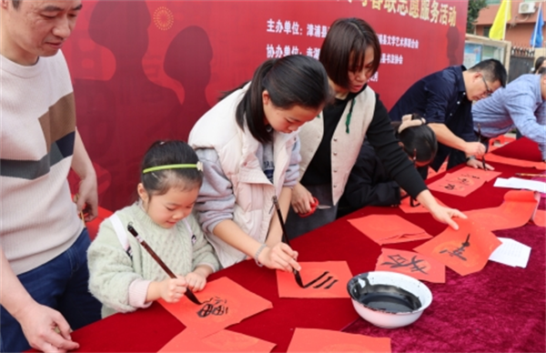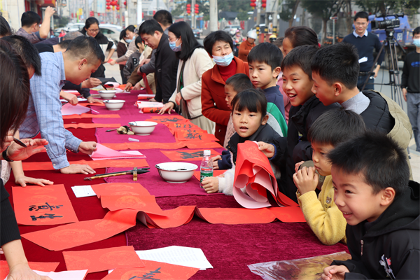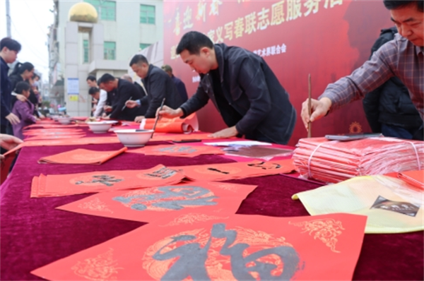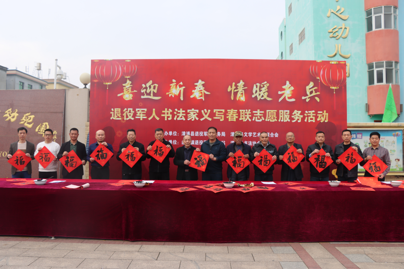 義寫春聯(lián)送祝福,歡天喜地迎新春。為弘揚(yáng)優(yōu)良傳統(tǒng)文化,唱響文明風(fēng)主旋律,漳浦縣退役軍人事務(wù)局聯(lián)合縣文學(xué)藝術(shù)界聯(lián)合會(huì)在赤湖鎮(zhèn)舉辦以“喜迎新春 情暖老兵”為主題的退役軍人書法家義寫春聯(lián)志愿服務(wù)活動(dòng),免費(fèi)為轄區(qū)居民發(fā)放春聯(lián),讓當(dāng)?shù)厝罕娗袑?shí)感受到傳統(tǒng)文化和濃濃的節(jié)日氣息。 漳浦縣退役軍人事務(wù)局負(fù)責(zé)人黃乙濱與退役軍人書法家、志愿者合影留念。 活動(dòng)現(xiàn)場(chǎng),墨香飄溢,年味兒漸濃。退役軍人書法家們?cè)缭鐏淼健八透偂弊龊脺?zhǔn)備,在紙上揮毫潑墨,歡寫對(duì)聯(lián)?!跋簿訉毜厍旰?,福照家門萬事興。”“福星高照全家福;春光耀輝滿堂春?!薄环⒁饧槿缫狻⒊錆M祝福的春聯(lián)寫出了人們對(duì)新年的期盼,也“折射”出濃濃的節(jié)日氛圍。 小朋友大朋友前來圍觀,欣賞書法作品。 小朋友們?cè)诨顒?dòng)現(xiàn)場(chǎng)寫對(duì)聯(lián)。 現(xiàn)場(chǎng)的小朋友幫忙傳遞紅紙,充當(dāng)“小志愿者”給書法家們搭把手。 現(xiàn)場(chǎng)人員一邊欣賞、贊美著志愿者們的書法作品,一邊挑選著自己心儀的春聯(lián),喜悅之情溢于言表。書法愛好者們或是自由發(fā)揮,或是應(yīng)村民要求“私人訂制”,以筆墨承載祝福,創(chuàng)作出寓意美好的春聯(lián)和“?!薄按骸弊?。值得一提的是,現(xiàn)場(chǎng)還有5位小小書法愛好者也在寫“春”和“?!弊郑磉_(dá)內(nèi)心的滿滿祝福。這些春聯(lián)、“春”和“?!弊謱懞镁退徒o村民,整場(chǎng)義寫春聯(lián)供不應(yīng)求。 退役軍人書法家楊海南書寫對(duì)聯(lián)。 退役軍人書法家陳曉春(右二)與“戰(zhàn)友們”在現(xiàn)場(chǎng)準(zhǔn)備好筆墨后,開始忙碌寫對(duì)聯(lián)。 村民領(lǐng)到春聯(lián)和“?!薄按骸弊?,紛紛表示手寫春聯(lián)更有意義、更有年味兒,內(nèi)容也是滿滿的正能量。據(jù)統(tǒng)計(jì),當(dāng)天送出春聯(lián)300多副,“?!薄按骸?00多字。“每年春節(jié)期間,都要開展義寫春聯(lián)活動(dòng),結(jié)合三下鄉(xiāng)濃厚‘?!幕蓖艘圮娙藭覘詈D显诂F(xiàn)場(chǎng)說道。 此次活動(dòng)由赤湖鎮(zhèn)退役軍人服務(wù)站、漳浦縣書法協(xié)會(huì)合力協(xié)辦。 |