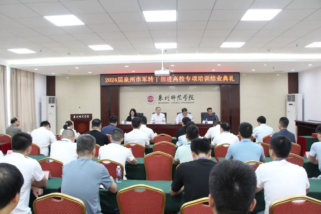 6月28日上午,2024屆泉州市軍轉(zhuǎn)干部進(jìn)高校專(zhuān)項(xiàng)培訓(xùn)結(jié)業(yè)典禮在泉州師范學(xué)院舉行,25名軍轉(zhuǎn)干部完成為期一學(xué)年的專(zhuān)項(xiàng)培訓(xùn)活動(dòng),學(xué)員代表領(lǐng)取結(jié)業(yè)證書(shū),優(yōu)秀學(xué)員領(lǐng)取榮譽(yù)證書(shū)。 中共泉州市委退役軍人事務(wù)工作領(lǐng)導(dǎo)小組辦公室主任、泉州市退役軍人事務(wù)局局長(zhǎng)唐良元,泉州市退役軍人事務(wù)局副局長(zhǎng)劉紅生,泉州師范學(xué)院黨委常委、副校長(zhǎng)夏侯建兵,泉州師范學(xué)院武裝部、教務(wù)處、后勤管理處、繼續(xù)教育處、繼續(xù)教育學(xué)院等相關(guān)部門(mén)負(fù)責(zé)人,泉州市退役軍人事務(wù)局相關(guān)科室負(fù)責(zé)人等參加結(jié)業(yè)典禮。 “通過(guò)一年的學(xué)習(xí),各位學(xué)員能夠主動(dòng)轉(zhuǎn)變角色,把軍人的優(yōu)良作風(fēng)帶進(jìn)校園、融入到學(xué)習(xí)中,在政治思想、專(zhuān)業(yè)素質(zhì)和崗位能力等方面得到了加強(qiáng)和提升?!比輲煼秾W(xué)院黨委常委、副校長(zhǎng)夏侯建兵在致辭中表示,希望學(xué)員要堅(jiān)持學(xué)習(xí),通過(guò)不斷學(xué)習(xí)努力增強(qiáng)本領(lǐng);要實(shí)干篤行,在地方履職中建功立業(yè);同時(shí),也希望學(xué)員共同關(guān)心母校,一如既往支持母校發(fā)展。