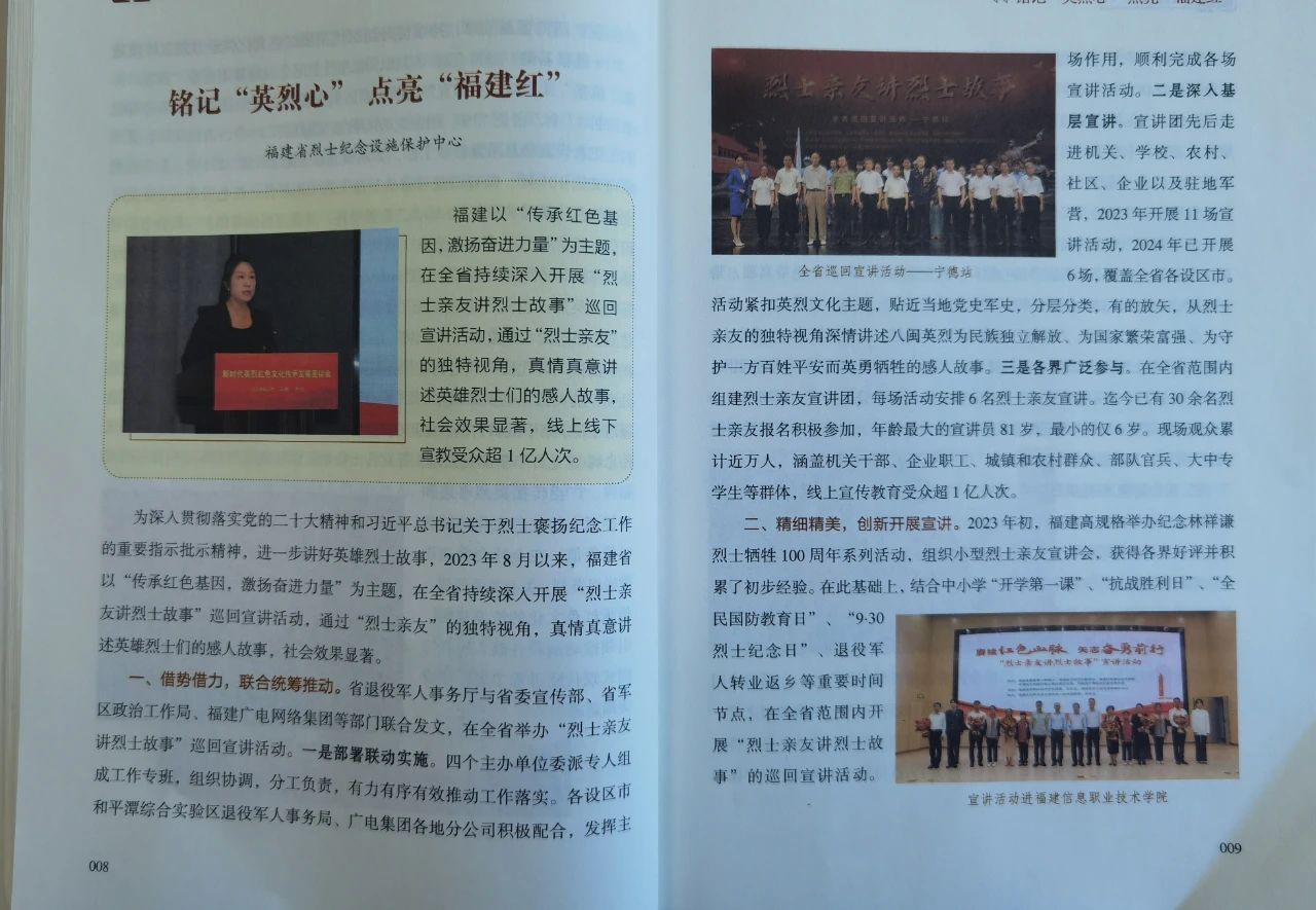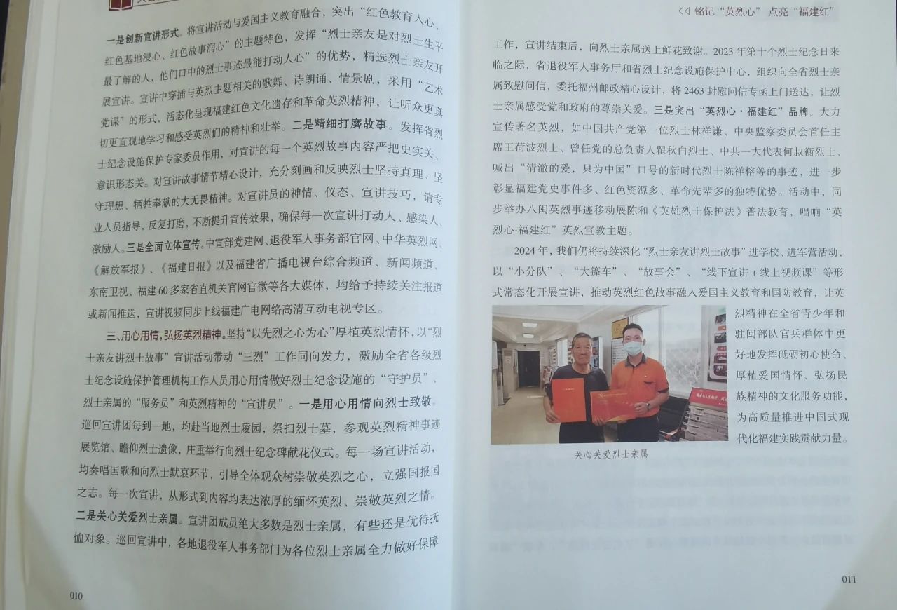 近日,退役軍人事務(wù)部烈士紀(jì)念設(shè)施保護(hù)中心圍繞英烈紅色文化傳承發(fā)展和烈士紀(jì)念設(shè)施保護(hù)利用主題,編印《強(qiáng)基鑄魂——英烈褒揚(yáng)領(lǐng)域研究成果匯編(二)》,收錄各省退役軍人事務(wù)部門、媒體、專家學(xué)者及社會(huì)組織的經(jīng)驗(yàn)材料及研究課題文章37篇。我省“烈士親友講烈士故事”宣講活動(dòng)經(jīng)驗(yàn)做法,作為全書僅有的4篇地方經(jīng)驗(yàn)成果入編,這既是對(duì)福建烈保工作系統(tǒng)“英烈心·福建紅”烈士褒揚(yáng)工作特色品牌的生動(dòng)展示,也是對(duì)福建在推動(dòng)烈士褒揚(yáng)工作高質(zhì)量發(fā)展方面創(chuàng)新探索的成果推廣。 |