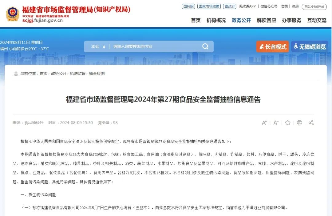 近日,福建省市場監(jiān)管局公布第27期食品安全監(jiān)督抽檢相關(guān)信息通告。 本期通告的監(jiān)督抽檢信息涉及26大類食品730批次。其中合格715批次,不合格15批次。不合格項目涉及微生物污染問題、食品添加劑問題、質(zhì)量指標問題、農(nóng)藥殘留問題、重金屬污染問題、其他污染問題。 微生物污染問題 標稱福建瓴智食品有限公司2024年5月7日生產(chǎn)的夾心海苔(巴旦木),菌落總數(shù)不符合食品安全國家標準規(guī)定,銷售單位為平潭冠業(yè)商貿(mào)有限公司。 福州市馬尾區(qū)程鵬小吃店的湯碗(消毒日期為2024年6月14日),大腸菌群、陰離子合成洗滌劑(以十二烷基苯磺酸鈉計)不符合食品安全國家標準規(guī)定。 食品添加劑問題 標稱龍巖市柿柿圓食品有限公司2023年12月26日生產(chǎn)的蒜香花生,二氧化硫殘留量不符合食品安全國家標準規(guī)定,銷售單位為福建好多多商貿(mào)集團有限公司雙園分公司。 沃爾瑪(福建)商業(yè)零售有限公司寧德天湖東路分店銷售的楊梅(購進日期為2024年5月13日),糖精鈉(以糖精計)不符合食品安全國家標準規(guī)定。 質(zhì)量指標問題 高新區(qū)顏厝月駿超市銷售的散裝古方瓜子(購進日期為2024年5月15日),過氧化值(以脂肪計)不符合食品安全國家標準規(guī)定。 農(nóng)藥殘留問題 平潭永業(yè)超市有限公司銷售的妃子笑荔枝(購進日期為2024年6月15日),氟嗎啉不符合食品安全國家標準規(guī)定。 漳州大潤發(fā)商業(yè)有限公司銷售的海南??谀竟希ㄙ忂M日期為2024年5月23日),噻蟲胺不符合食品安全國家標準規(guī)定。 廈門市同安區(qū)果子鋪子百貨店銷售的妃子笑荔枝(購進日期為2024年6月7日),吡唑醚菌酯不符合食品安全國家標準規(guī)定。 福建永輝超市有限公司莆田市荔華東萬達廣場店銷售的木瓜(購進日期為2024年5月11日),噻蟲胺、噻蟲嗪不符合食品安全國家標準規(guī)定。 浦城縣徐氏果品批發(fā)部銷售的香梨(購進日期為2024年5月7日),氯氟氰菊酯和高效氯氟氰菊酯不符合食品安全國家標準規(guī)定。 漳州市龍文區(qū)領(lǐng)惠生鮮超市銷售的紅心木瓜(購進日期為2024年5月30日),乙酰甲胺磷不符合食品安全國家標準規(guī)定。 重金屬污染問題 廈門和悅城商貿(mào)有限公司銷售的老姜(購進日期為2024年6月16日),鉛(以Pb計)不符合食品安全國家標準規(guī)定。 其他污染問題 閩侯縣上街味美小吃店的圓盤(消毒日期為2024年6月11日),陰離子合成洗滌劑(以十二烷基苯磺酸鈉計)不符合食品安全國家標準規(guī)定。 福建省鑫財餐飲服務有限公司霞浦鑫財分公司的杯子(消毒日期為2024年6月14日),陰離子合成洗滌劑(以十二烷基苯磺酸鈉計)不符合食品安全國家標準規(guī)定。 閩侯縣甘蔗飯米粒兒小吃店的方盤(消毒日期為2024年6月13日),陰離子合成洗滌劑(以十二烷基苯磺酸鈉計)不符合食品安全國家標準規(guī)定。 |