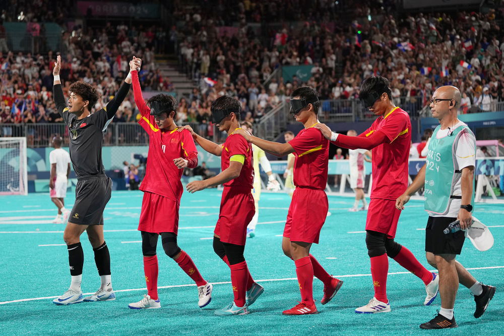 9月1日,中國隊(duì)隊(duì)員賽后向觀眾致意。新華社記者 熊琦 攝 相互理解的安靜與躁動(dòng),相互攙扶的默契與溫情,是看不見的他們帶給大家的感動(dòng)與力量。 “盲人足球,是對(duì)聽覺和觸覺的極致把控。”中國盲人足球隊(duì)引導(dǎo)員李進(jìn)說。對(duì)于盲人運(yùn)動(dòng)員來說,傳球、攔截和射門等技術(shù)動(dòng)作需要通過特制足球滾動(dòng)發(fā)出的響聲和場內(nèi)指定區(qū)域發(fā)出的指令來完成,而每一項(xiàng)技術(shù)動(dòng)作的發(fā)力部位、動(dòng)作幅度,則需要運(yùn)動(dòng)員日復(fù)一日地去觸摸、去感受,直至身體形成肌肉記憶。