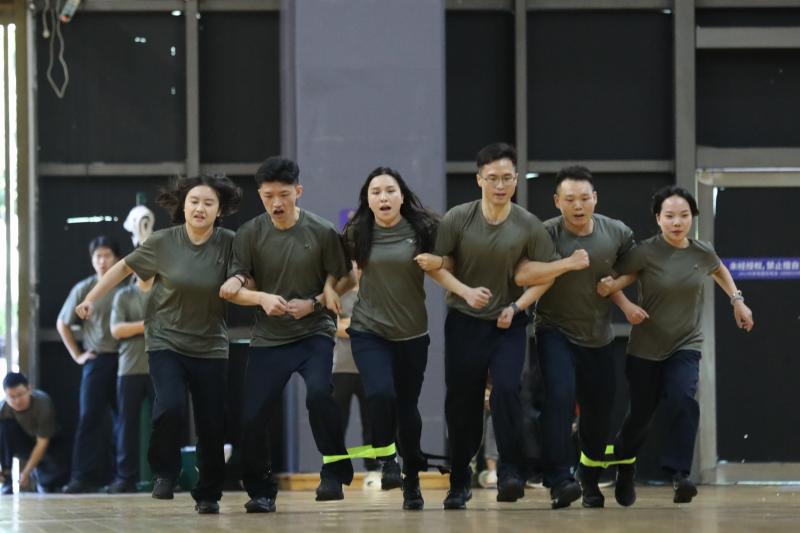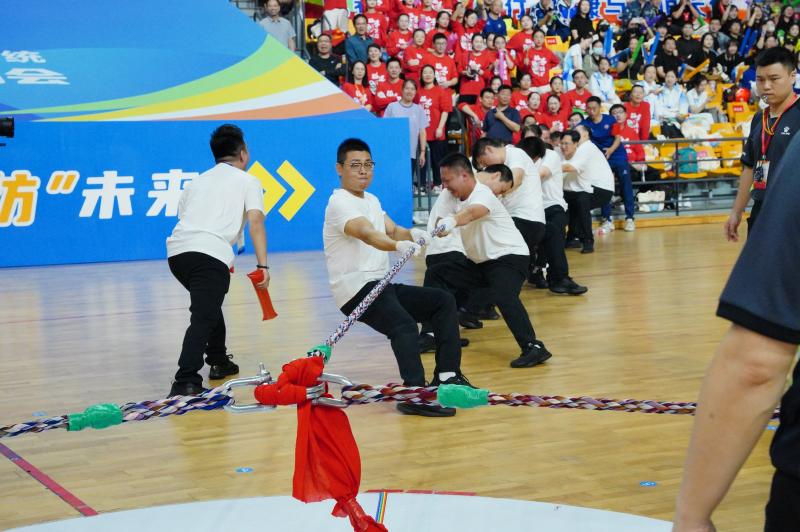 在隨后進行的趣味運動賽中,各支隊伍盡展所能,賽出屬于輕紡人的青春風采。激烈的“力拔山河”多向拔河比賽,各隊隊員緊握繩索,腳跟扎地,在齊聲吶喊中爆發(fā)出驚人的力量,場面緊張而激烈;歡快的“齊頭并進”項目中,參賽選手綁腿搭肩同行,口中喊著整齊的口號,步伐協調地向著終點沖刺,如同親密無間的戰(zhàn)友;巧妙的“凝心聚力”背夾球環(huán)節(jié)中,隊員們背靠背,心連心,夾著氣球快速又小心地前進,氣球的每一次微晃都牽動著全場觀眾的心;充滿挑戰(zhàn)的“共渡難關”接力賽中,參賽隊伍爭分奪秒、心心相連、共渡難關,巨大的“車輪”憑借團隊協作的力量在賽道上飛速滾動,仿佛破浪前行的巨輪,朝著勝利的彼岸全速前進。趣味運動賽的最后,各參賽隊伍代表共同拼出匯聚著全體參賽企業(yè)圖形徽標的大拼圖并合影,象征著全體輕紡人團結一心、共同奮斗的堅定信念。經過激烈而又充滿趣味的比拼,輕紡設計院最終獲得了趣味運動賽團體第一名,金皇環(huán)保和海峽融合分獲第二、第三名。
